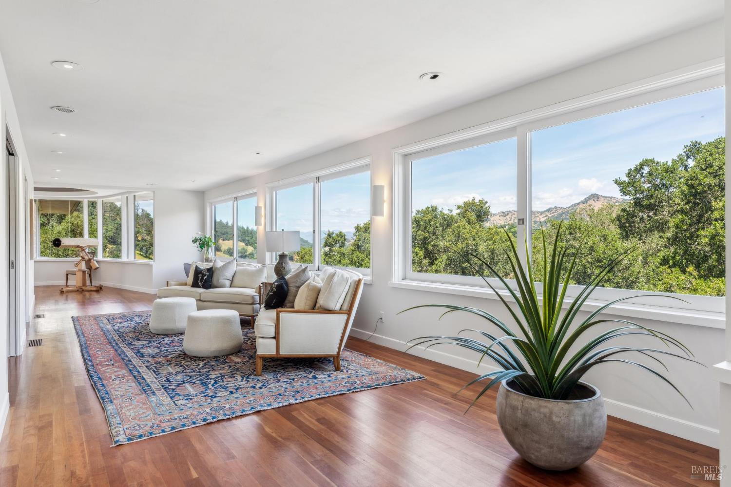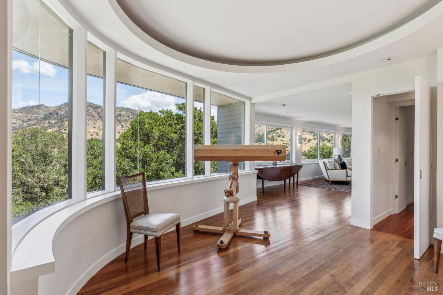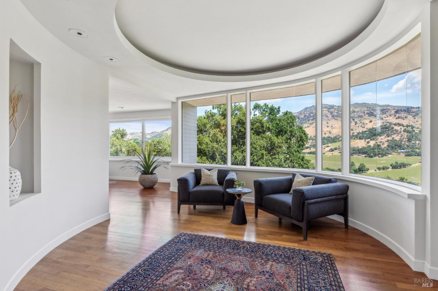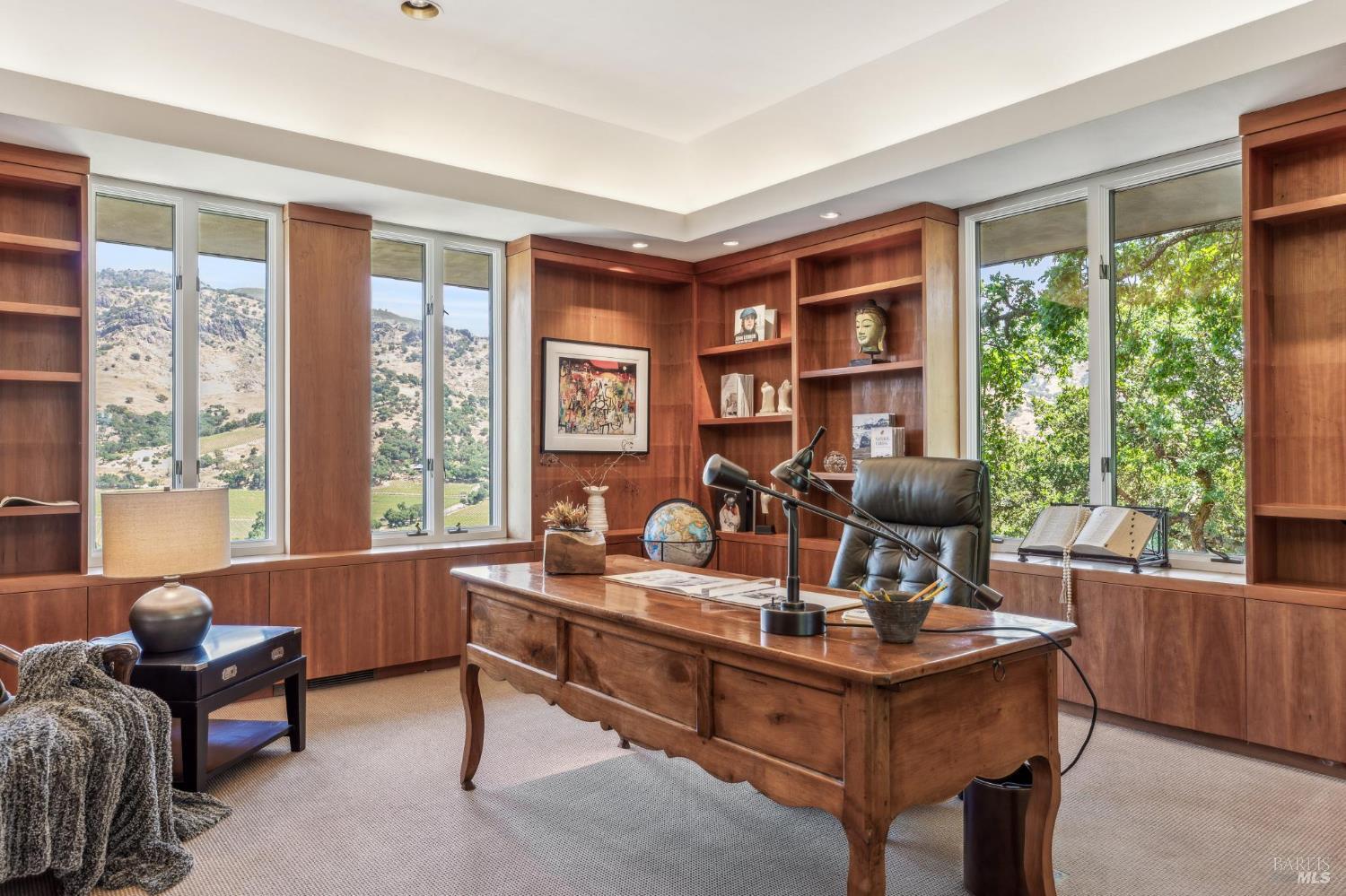 The incredible legacy of this estate will capture your imagination, while the beauty of the setting and the style and comfort of the home will capture your heart. Perched atop a knoll and anchored in bedrock, this 7,912 SF, 6-bedroom home commands views of Napa Valley with Stags Leap Palisades as the backdrop. Designed to take in the ever-changing light on the peaks, the home blends strength and artistry with restrained elegance. The glass-paneled doors open to amber wood floors and a gallery of windows. The warm bookshelf lined library is tucked down the hall, while the living room with open beams, stone fireplace, built-ins and hidden glass doors that partition it from the window gallery, then flows seamlessly to the bar & dining room with gorgeous views. The chef's kitchen features butcher block counters, a six-burner Wolf range, skylight, and is open to the family room. The west-facing primary suite offers a marble bath, deep soaking tub, and spacious dressing room. The lower level includes a former dance studio, additional bed & bath, woodworking shop, wine cellar, and guest suite with its own outside patio. Upstairs, three charming bedrooms feel like a secret retreat. Surrounded by gardens, and heritage oaks this 8.19 acres is history waiting to be loved and reimagined.Interested in this Listing?