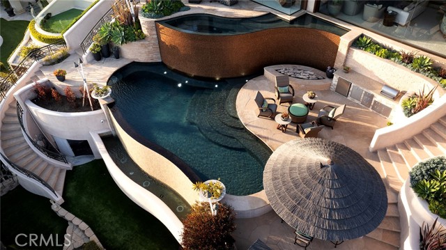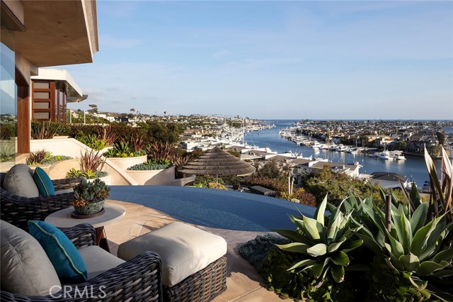 Sited on the premier street in Irvine Terrace, one of Corona Del Mar's most coveted neighborhoods, 1131 Dolphin Terrace distinguishes itself as a showcase property. Visitors are welcomed into the courtyard by meticulously curated landscaping from Roger s Gardens, guiding them to the custom Honudran mahogany-wrapped double doors that lead to the formal entry. The focal point of the main living area is a floating fireplace extending through an octagonal skylight in the ceiling, flanked by two substantial saltwater fish tanks totaling over 1,100 gallons. A grand picture window spans the width of the living room, offering sweeping 180-degree views of Newport Harbor- considered to be some of the best in the region. Frameless glass doors adorned with hand-carved mahogany Dolphin handles (a nod to the iconic Dolphin Terrace) provide access to the backyard, featuring a custom-designed, zero-edge curved pool and spa, a 25-foot Italian glass wall, and an outdoor cooking area with a fire pit, and steps which lead down to a gated access point on Bayside Drive, allowing for easy access to the world-famous Balboa Island. A private sitting area rests adjacent to the primary bedroom which boasts walls of floor-to-ceiling glass, offering panoramic views out to the jetties of the harbor entrance and another of the three interior fireplaces. The primary bathroom showcases dual vanities, a walk-in shower, jacuzzi tub, heated tile floors, and an expansive walk-in closet. Venetian plaster walls guide you to two additional substantial ensuite bedrooms and a fully outfitted home theater. The dining room, adorned with suede padded walls, provides convenient access to the kitchen, appointed with high-end stainless steel appliances, two built-in sub-zero refrigerators, and custom mahogany cabinetry. An additional ensuite bedroom, currently utilized as an office, a laundry room, and an oversized 2-car garage equipped with a full sound system, round out the features. This impeccably maintained home, with no expense spared, is in pristine condition and has been meticulously cared for by the current owners.Interested in this Listing?