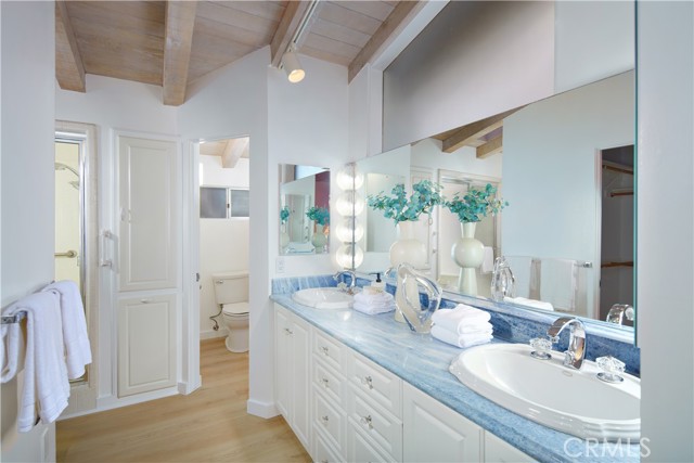 Just feet from the sand in Corona del Mar, behind the gates of the exclusive Breakers Drive enclave and on the market for the first time since its construction, this once-in-a-lifetime residence overlooks Big Corona Beach, the stone jetties that line Newport Harbor s entrance channel, Catalina Island, breaking waves, and dramatic coastline bluffs. Virtually hidden from the street above and exceptionally private on every level, this coastal gem of approximately 5,084 square feet consists of a 5-bedroom, 3.5-bath main residence, and a separate 2-bedroom, 2-bath ADU with front-row ocean views which is currently leased and offers outstanding income potential. The home s private entry introduces the lowest floor and hosts an office or bedroom with ensuite bath and a wet bar. Offering separate outside access, a media lounge with tray ceiling and wet bar can easily become a studio or home gym. Floating stairs lead to the main level of the residence, which impresses with stunning ocean and beach views, a towering double-height vaulted ceiling with floor-to-ceiling windows, access to a spacious ocean-view terrace, a fireplace with bookmatched stone surrounds, a wet bar, and a dining room with built-in buffet. An island kitchen shines with granite countertops, Thermador and Sub-Zero appliances, and a fireplace-warmed breakfast room opening to a private rear patio with automated sprinklers. Locking gates lead from the patio to the street behind and a short stroll to Corona del Mar s village shops and restaurants. The patio can also be reached by a wood-paneled guest room. On the top floor, an open landing overlooks the living room below and leads to two ocean-view guest rooms, with one leading to a beach-view balcony, and another offering access to a private rear balcony. Separate from the guest bedrooms, the primary suite is fully appointed with a balcony overlooking the ocean, a cedar-lined walk-in closet and a sauna with door to the rear balcony. Mid-Century style is complemented by clerestory windows, vaulted open-beam ceilings, custom built-ins, and a period-perfect intercom system. Enjoy easy access to Big Corona s broad beach, tide pools, Fashion Island, Pelican Hill, and John Wayne Airport.Interested in this Listing?