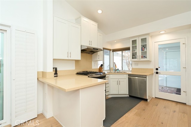 Highly desirable Single Level DETACHED home located steps from the prestigious South Lake of Woodbridge. This 2 bedroom, 2 bath home is the ultimate example of attention to detail from the Provenza hardwood floors to the custom fire and ice fireplace which provides warmth and openness. The spacious floor plan allows immense amounts of natural light with vaulted ceilings and recessed lights. The formal dining is perfect for entertaining which leads through the sliding door to a private outside entertaining area with wrap around garden courtyard. Designer inspired kitchen with Quartz Countertops and stainless-steel appliances, including a gas burner stove. Primary bedroom has direct access to the private courtyard and high ceilings. Primary bathroom has dual sinks and walk-in shower lined with marble and mosaic porcelain tile and a frameless glass shower enclosure. The 2-car garage has epoxy floors with finished drywall, rack storage, and laundry area. Walking distance to award winning schools. Woodbridge provides resort-style amenities which include 2 lakes with sand bottom lagoons, boating, fishing, BBQ, fire pits, green belts with numerous trails, over 20 pools, 16 spas, and 20 tennis courts.