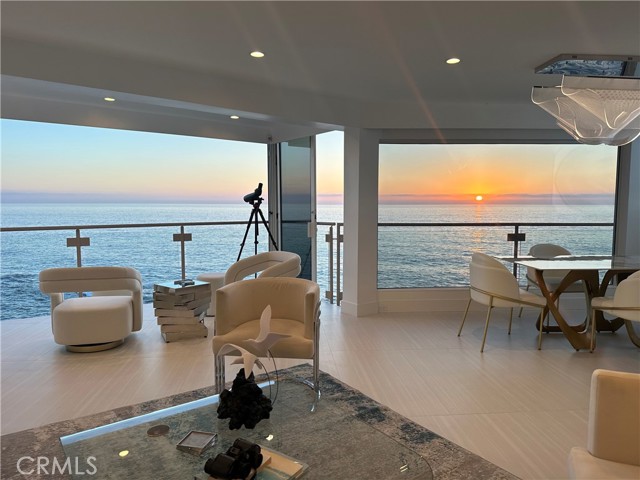Escape to an exquisite, fully furnished oceanfront retreat that epitomizes the essence of beach paradise. Nestled within the coveted Table Rock community of Laguna Beach, this extraordinary residence offers an unparalleled experience. Immerse yourself in the majestic waves below, while reveling in sweeping views of Catalina, captivating sunsets, abundant marine life, and picturesque coastline extending from the North to South. Positioned within one of the most sought-after locations in Table Rock, this residence exudes serenity and exclusivity with impeccable ocean views, allowing you to bask in the beauty of the sea from the comfort of your beach retreat. The open floor plan boasts luxurious finishes and a contemporary style, seamlessly connecting the living room and seating area to the ocean through glass sliding doors. Awaken each morning in the main bedroom to a ocean paradise. The secondary en-suite, currently utilized as an office, offers versatility with a Murphy bed, comfortable seating, TV, and a dedicated workspace. Additional features include indoor laundry with washer & dryer, four mini splits with heat & AC, 1 car space in a shared two-car garage, and one permitted guest parking spot, subject to availability. Conveniently bypass any stairs with the use of the elevator, ensuring easy access to the residence. The Table Rock Community boasts a serene atmosphere, with a lush grassy courtyard and inviting pool area. Indulge in an array of amenities, including direct beach access to West Beach and mere steps to Table Rock Beach. Unwind by the pool or in the jacuzzi, savor the BBQ area over looking the beach, or engage in a game of shuffleboard or ping pong. Clubhouse has a pool/billiards room and gym, offering additional leisure and recreation. You ll find yourself just steps away from restaurants, hiking trails and the Trolley that will transports you along the breathtaking coastline to a wealth of attractions as you venture out into Laguna Beach where you'll discover a plethora of other beaches, shopping, nightlife, The Montage Resort, The Ranch golf course, and Art district. Embrace oceanfront living year round at this Table Rock residence.