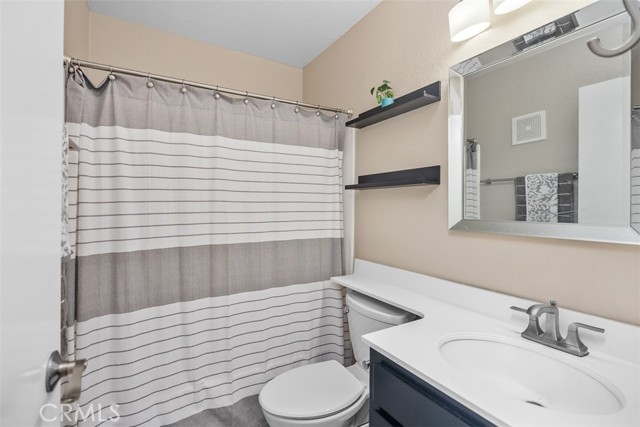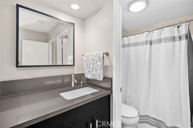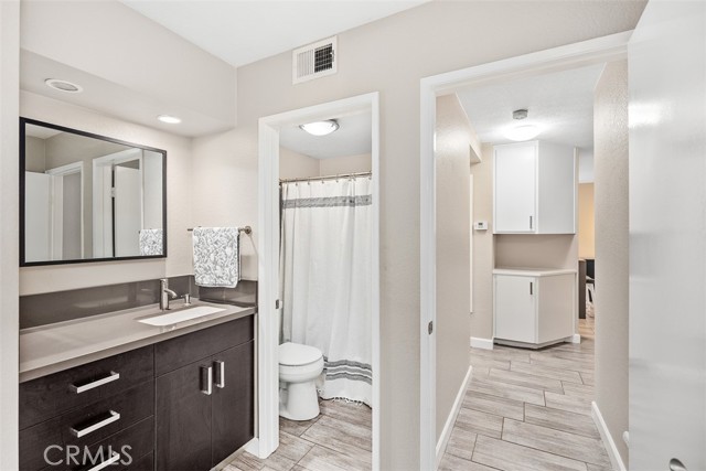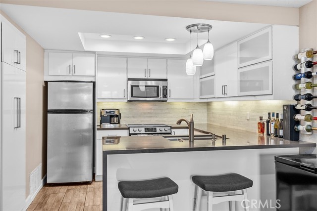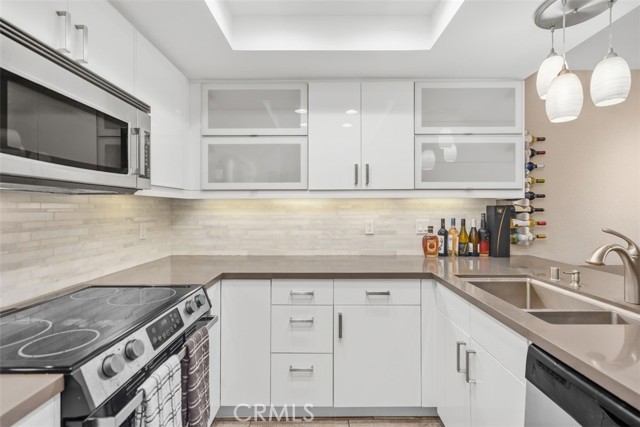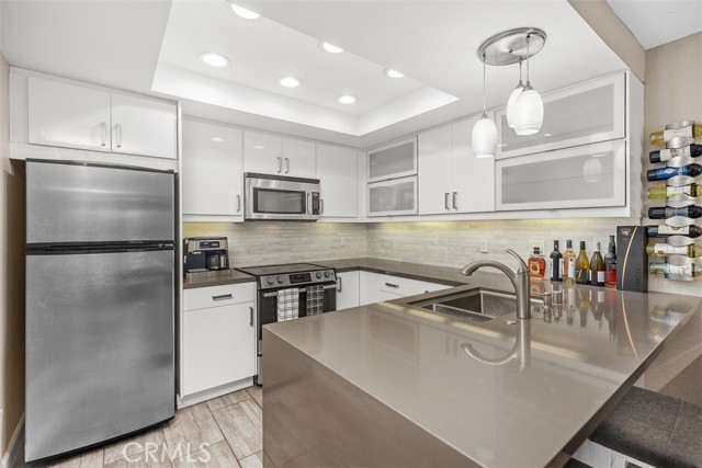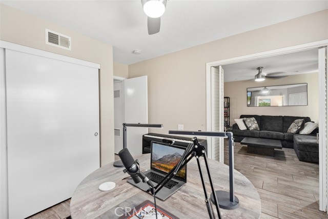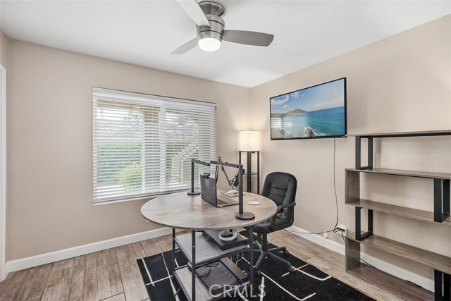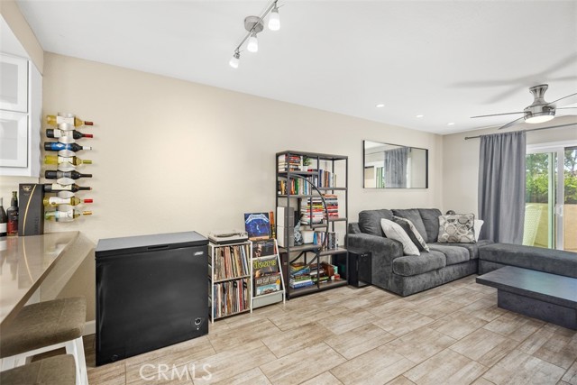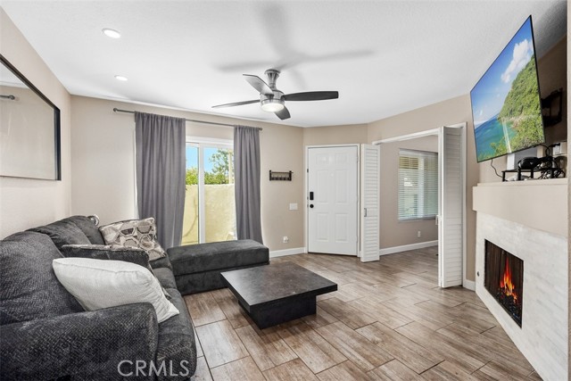 This ground-level, fully furnished 2-bedroom condo offers an easy, comfortable place to call home, whether you're working remotely, in between homes, or simply looking for a low-maintenance space with style. With no stairs inside and one bedroom set up as a dedicated home office, it's perfect for those needing both function and flexibility. The kitchen is designed with everyday ease in mind, featuring quartz countertops with a waterfall edge, an expanded pantry, high-gloss soft-close cabinets, a single-level sink counter, and a Carrera marble backsplash. Thoughtful storage touches like pull-out corner inserts make great use of space. Wood-look tile flooring runs throughout the home with no carpet anywhere. You'll also appreciate the recessed lighting, updated electrical fixtures, and ceiling fans in every room. Central air conditioning keeps things cool, and the in-unit washer and dryer make laundry a breeze. The living area features a Carrera marble-tiled fireplace that ties beautifully into the kitchen design. Just off the primary bedroom, you'll find a private, shaded patio, an ideal spot to relax or enjoy your morning coffee. This peaceful community offers two pools, two spas, scenic walking trails, and is conveniently located near shopping and with easy freeway access.
