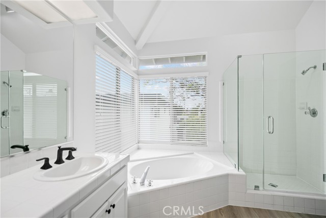 This exquisite 3-bedroom, 3.5-bath home in the tranquil Beacon Court enclave captivates even the most discerning taste. Its open floor plan showcases walls of windows, cathedral ceilings, and skylights, flooding the space with natural light. A striking two-story entry welcomes you with clerestory windows and a custom chandelier. Gleaming designer wood flooring flows across the first level, uniting a spacious living room, an adjacent dining room, and a convenient guest bath. The chef s kitchen dazzles with granite counters and a designer backsplash, seamlessly connecting to a cozy breakfast nook and an inviting outdoor garden patio. The main bedroom suite enchants with a fireplace, cathedral ceilings, a walk-in closet, and a sunlit bathroom featuring a deep soaking tub, dual sinks, and a spa-inspired shower. The second bedroom suite impresses with cathedral ceilings, a large walk-in closet, and an en-suite bathroom boasting dual sinks, a deep soaking tub, and a separate shower. A third bedroom and hall bath complete the second level. For effortless parking, the oversized two-car garage, complete with epoxy floors and laundry hookups, delivers both style and function.
