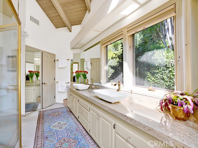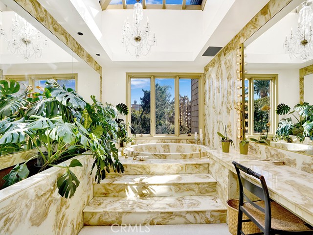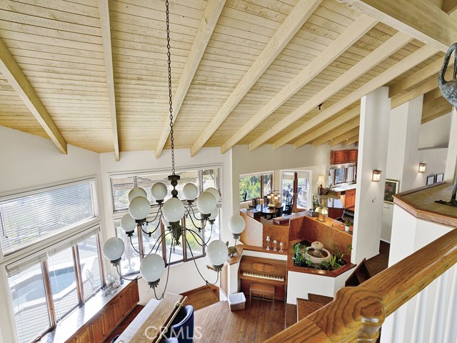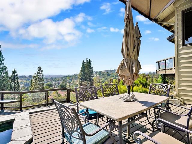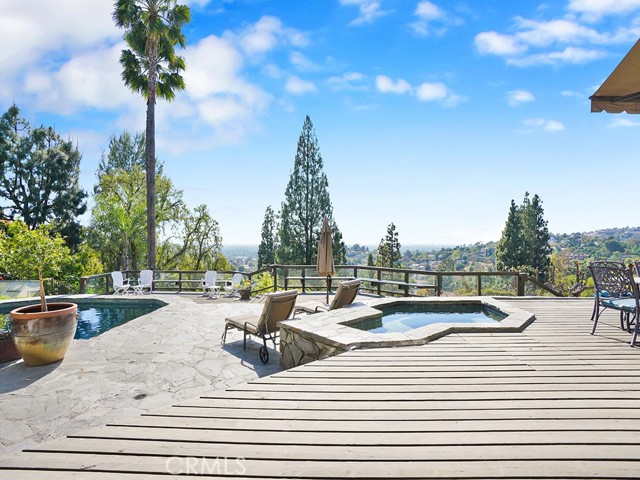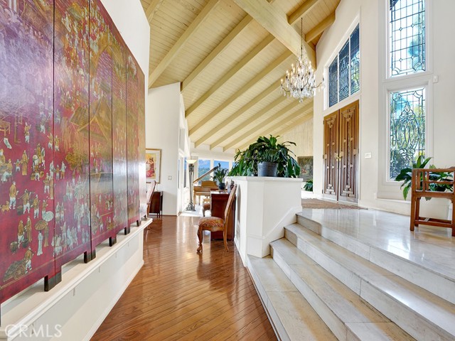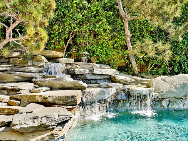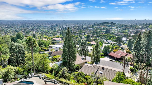 Awe inspiring 180 degree views from Tustin to the Pacific, this 7,622 sf architectural masterpiece at the end of a cul-de-sac is perched on a beautifully landscaped half-acre site in the estates of Tustin Hills. Designed by celebrated architect Ron Yeo, the Pasadena/USC style home boasts a broad open floor plan on multiple floating levels with intimate living spaces highlighted by exposed wood and beam design and high ceilings with all important rooms designed around the spectacular views and integrated indoor and outdoor spaces. A large bright living room with fireplace has an adjacent formal dining room with crystal chandelier and wrap around deck. A convertible office/library with copper fireplace and bookcase is below. The kitchen space includes a breakfast nook, owners desk and an open introduction to the main living areas below. An enticing entertaining space includes a full bar with dishwasher, a player piano with 100 music rolls, reel to reel tape system and more. Descending to the right of the kitchen leads to a private tasting room with a temperature controlled 400+ bottle wine cellar; a few steps to the left of the kitchen is a cozy family space with fireplace, bookcases, kids nook and direct access to the large entertaining deck boasting a resort style natural rock waterfall and solar-heated pool, spa and built-in BBQ, with views. Situated between the Tasting Room and convertible library is a sauna, bathroom, second family room with pool table, bar with pool deck access and a fitness space with floor to ceiling mirror and ballet barre. The master bedroom boasts a fireplace, views, speakers, high ceilings and a large closet with a stand-alone 12 drawer built in. The master bath impresses with a 2 head shower, spa tub, double sinks, garden feature, skylight and chandelier. Significant other highlights include 2 en suite bedrooms with private patios, a 4th bedroom with adjacent bath, an atrium garden retreat with water feature, 3 car garage with extensive built-in storage cabinets and workbench, integrated alarm and intercom system, central vacuum, 2 tankless water heaters, 4 furnaces, 4 a/c units, 2 skylights and hardwood floors to name just a few of the many luxury features of this estate. The home s exterior was painted in 2023 with new decks in the last 4 years. A key safety feature provides crucial wildfire protection with an integrated roof sprinkler system and strategically located controls in the master bedroom and garage.