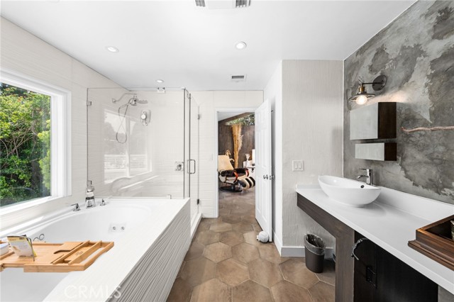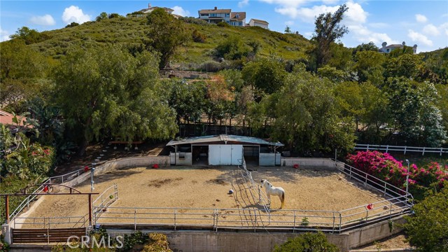 Enjoy the Equestrian lifestyle with unparalleled opportunities in this 3,995-square-foot Modern Ranch Estate. Perfectly balanced, this Orange Park Acres residence, has been curated through precise customization. Nestled behind private gates, this residence displays panoramic views and an ambience that feels like a secluded retreat. The property features 5 bedrooms, a living and dining area with soaring cathedral ceilings, wooden beams, and a large bonus room with sliding doors that open out onto the meticulous grounds. The remodeled bathrooms exude sleek sophistication, while the expansive kitchen features granite countertops, island, and large windows offering breathtaking views while enjoying your morning coffee or tea. The usable acre includes a stunning saltwater pool with waterfall and spa, a BBQ area with countertop seating, natural gas grill, stove, refrigerator, and sink. Bring your car collection, toys, RV, or imagine an ADU. Additional amenities include a handball court, wood & gas burning fire pits, and tranquil seating areas. The atmosphere is further enhanced by two decks on the main house, a spacious patio overlooking the grounds, and another patio adjacent to the art studio. Rest by the tranquil KOI pond or play on your private golf green with sandpit. A separate triplex building provides versatile spaces for an art studio, lounge area, or indoor potting area. At night, solar lighting transforms the expansive grassy area, patios, and mature landscaping into a captivating wonderland with endless options to expand. For those who appreciate organic food, the property features six raised redwood gardening beds and over 15 fruit trees, all equipped with automatic sprinklers. Additionally, the residence includes a 2-car garage, as well as a separate garage capable of accommodating up to 6 vehicles. Ample parking space for horse trailer & RV. Other upgrades include, dual AC units, upgraded sewer connection, lighting, and a comprehensive security system. Maintain seamless connectivity using Bluetooth and Apple-compatible speakers and more. With a whole-house water filtration system, this property offers a unique blend of luxury and classic sophistication. Horse facilities include a 2-stall barn with tack room, turnout area, viewing deck, wash area, and direct access to never-ending trails. With easy access to BEST schools, parks, and freeways, this location offers it all! This Oasis brings the best of Orange Park Acres living to life.
