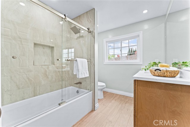 Welcome to a beautifully remodeled two-story home with timeless curb appeal, located in the highly sought-after Meredith Acres community of Orange. This thoughtfully updated residence offers a flexible layout designed for modern living, featuring four spacious bedrooms and four bathrooms. On the main level, a private bedroom sits adjacent to a separate three-quarter bath perfect for guests, multigenerational living, or a dedicated home office. The remodeled kitchen is a chef s dream, showcasing quartz countertops, a large center island with bar seating, stainless steel appliances, soft-close cabinetry, and a full-height designer backsplash. Open-concept living and family rooms are filled with natural light and enhanced by recessed lighting, crown molding, and a cozy fireplace. Upstairs, you ll find three additional bedrooms, including two with private en suite bathrooms. The expansive primary suite offers a spa-like bath and generous closet space, while the secondary suite features its own walk-in closet and bathroom an ideal retreat for an older teen, extended family member, or long-term guest. The backyard is your private oasis, complete with a sparkling pool, mature landscaping, and a covered patio perfect for relaxing or entertaining. Additional highlights include a brand new roof, central air and heating, dual-pane windows, a three-car attached garage, and numerous upgrades throughout. Located within walking distance of Orange Lutheran High School and top-rated Villa Park public schools, this move-in-ready home offers comfort, style, and an unbeatable location. This home is a must-see!Interested in this Listing?