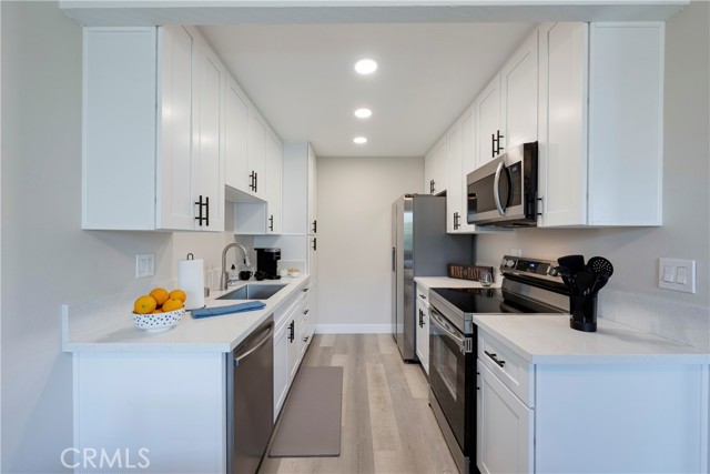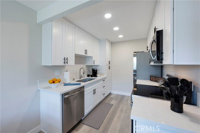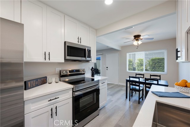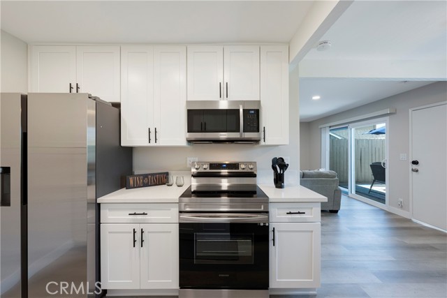 Available June 24, 2025. Fully furnished and centrally located, this quiet residential duplex is ideal for temporary housing needs in Orange County. With a minimum stay of 31 nights, it offers a stylish and comfortable retreat for mid to long-term stays. The entire unit boasts sleek grey laminate flooring, complemented by white shaker cabinets and quartz countertops in both the kitchen and bathrooms. All essential appliances are included: a refrigerator with an ice maker and filtered water, microwave, range, dishwasher, and a washer and dryer conveniently located in the attached single-car garage. The kitchen is fully stocked with cookware, utensils, dishes, glassware, a Keurig coffee maker, and more everything you need for a seamless stay. Abundant natural light fills the bright and airy living space, which is enhanced by LED recessed lighting. Unwind on the spacious sectional while enjoying entertainment on the high-definition Smart TV. The living room opens to a private patio, complete with a BBQ and outdoor dining area perfect for enjoying the Southern California sunshine. The primary bedroom features a king-size bed and an en suite bathroom for added privacy. The second bedroom offers a comfortable queen-size mattress and easy access to a full hallway bathroom. Experience the perfect blend of style, convenience, and comfort in this thoughtfully designed home away from home.