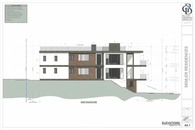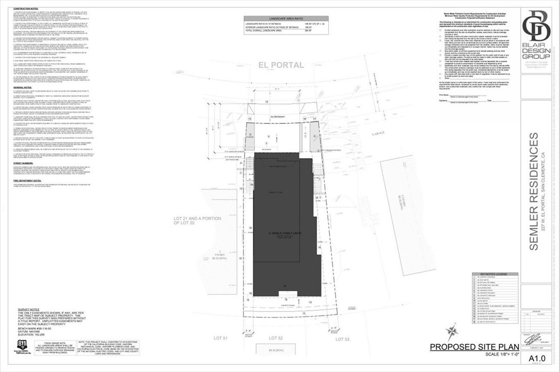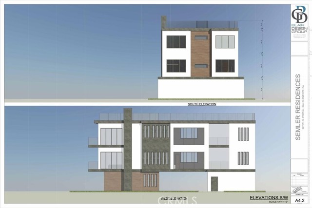 Situated in the heart of San Clemente, 227 W. El Portal offers a rare investment opportunity with plans for a luxury duplex, currently under review with the city. This exceptional lot is within walking distance to the beach, downtown shops, and restaurants, blending coastal convenience with prime development potential. The proposed duplex features two units, each approximately 2,160 square feet, totaling 4,320 square feet of living space. Designed with three bedrooms, two bathrooms, and elevator access to a rooftop deck showcasing breathtaking panoramic ocean views, this property embodies modern coastal luxury. With strong demand, investors can capitalize on returns by renting one unit while residing in the other or developing both for premium coastal rentals. Steps from the ocean and top-rated schools, this is an exceptional opportunity to create a high-end beachside retreat in one of Southern California s most desirable communities.