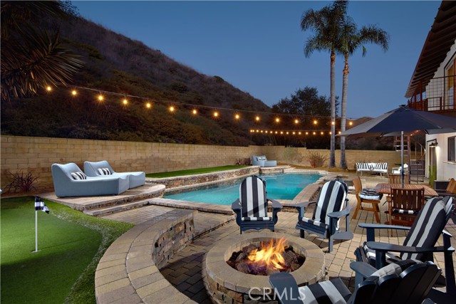 Welcome to this beautifully updated Meredith Canyon home, ideally situated on a private cul-de-sac surrounded by the hills of San Juan Capistrano. Thoughtfully designed for both comfort and entertaining, this spacious residence welcomes you with rich hardwood floors and a wrought iron staircase. The open, light-filled floorplan flows effortlessly through the main living spaces. The family room features a striking floor-to-ceiling stone fireplace, creating a dramatic focal point and a warm gathering space. The gourmet kitchen opens seamlessly to the family room and is equipped with GE Profile appliances, a custom sink, and a large center island with a breakfast counter perfect for casual meals or entertaining friends and family. A convenient downstairs bedroom and full bath provide flexibility for guests or multi-generational living. Upstairs, the expansive primary suite is a true retreat, complete with its own cozy fireplace and a private deck overlooking the beautifully landscaped backyard and surrounding hills. The en-suite bath offers dual sinks, a soaking tub, and a walk-in shower. The additional bedrooms are well-appointed and filled with natural light. The backyard is designed for year-round enjoyment, featuring a saltwater pool and spa, a built-in fire pit, and a putting green all framed by sweeping hill and open space views. A custom-built shed adds valuable storage or workspace, enhancing outdoor functionality. With only one neighboring home, the property offers a rare sense of privacy and tranquility, free of freeway noise. Additional features include a security alarm system, a newer custom steel roof, and a fully owned solar system for long-term energy efficiency. Beyond the home, enjoy direct access to hiking and mountain biking trails, including the nearby trailhead leading to Patriot Hill offering stunning ocean vistas for outdoor enthusiasts. Centrally located with convenient access to Dana Point, San Clemente, and San Juan Capistrano, this home truly captures the best of the Southern California lifestyle. Just minutes from Doheny State Beach, golf, tennis, and world-class surf, this is coastal living at its finest.Interested in this Listing?