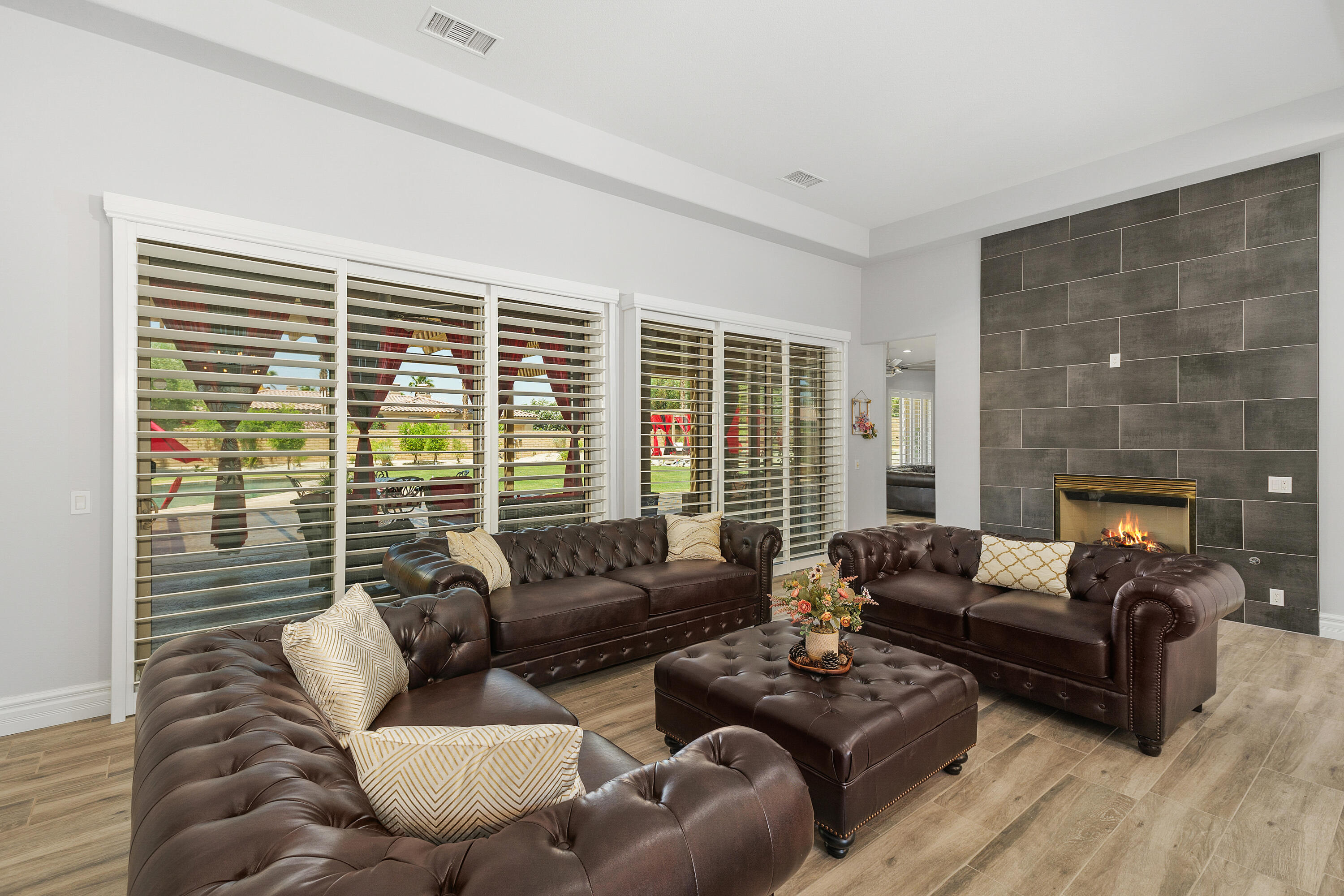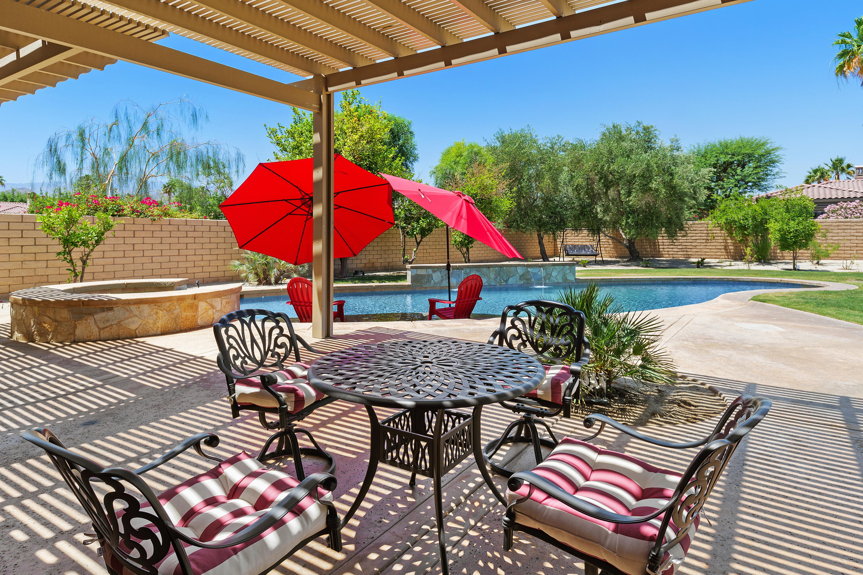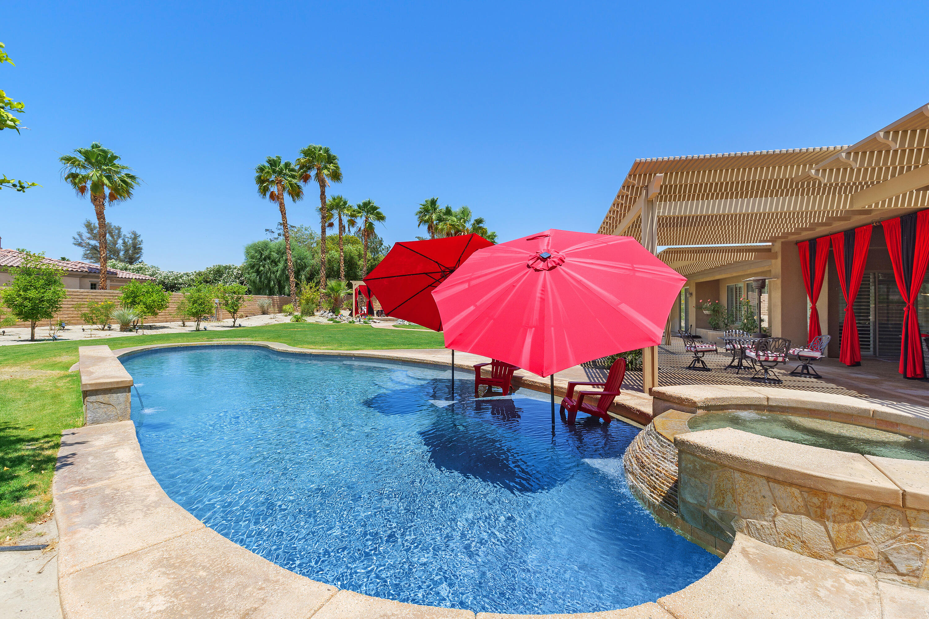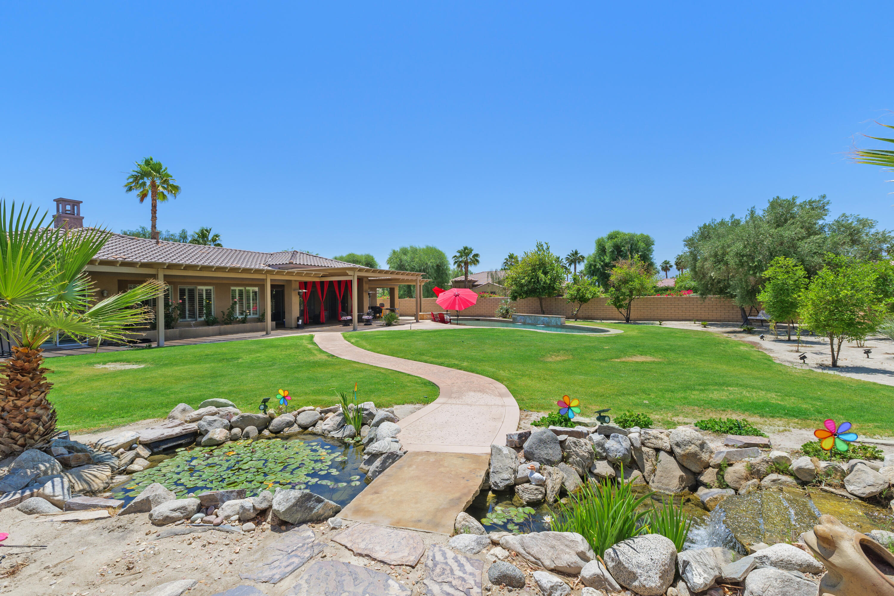 Discover refined desert living in the exclusive gated community of Stone Gate, where luxury meets functionality on a sprawling 27,443 sq ft presidential estate lot--perfect for entertaining, relaxing, and enjoying the best of the Coachella Valley lifestyle. This 4-bedroom, 5-bathroom remodeled residence features 3,240 sq ft of open-concept living space, designed with sophistication and comfort in mind. From the moment you enter, soaring ceilings welcome you, wood-like tile floors throughout, shutters, and recessed lighting that create a bright and airy atmosphere. Enjoy formal living and dining spaces, two tile gas fireplaces, and a spacious family room with a built-in entertainment center. The heart of the home is the gourmet kitchen, fully remodeled with quartz countertops, a quartz waterfall breakfast bar, stainless steel appliances, a gas cooktop, a chef's range hood, and custom cabinetry--ideal for both daily use and special gatherings. The primary suite is a serene retreat, featuring a walk-in closet, a luxurious bathroom with a standalone soaking tub, his-and-hers vanities, quartz counters, custom cabinets, and a large walk-in tile shower. Step outside to a private resort-style backyard, complete with a large pool and spa, a shaded pergola with a koi pond, and ample space for entertaining under the stars. The expansive driveway easily accommodates large vehicles, boats, toys, or an RV, and the cooled 3-car garage adds an extra layer of comfort. Located just minutes from golf courses, fine dining, shopping centers, grocery stores, and entertainment venues, this home offers both seclusion and convenience in one of Bermuda Dunes' most desirable neighborhoods. This is your chance to own a truly exceptional property on a presidential estate lot in the heart of the desert.Interested in this Listing?