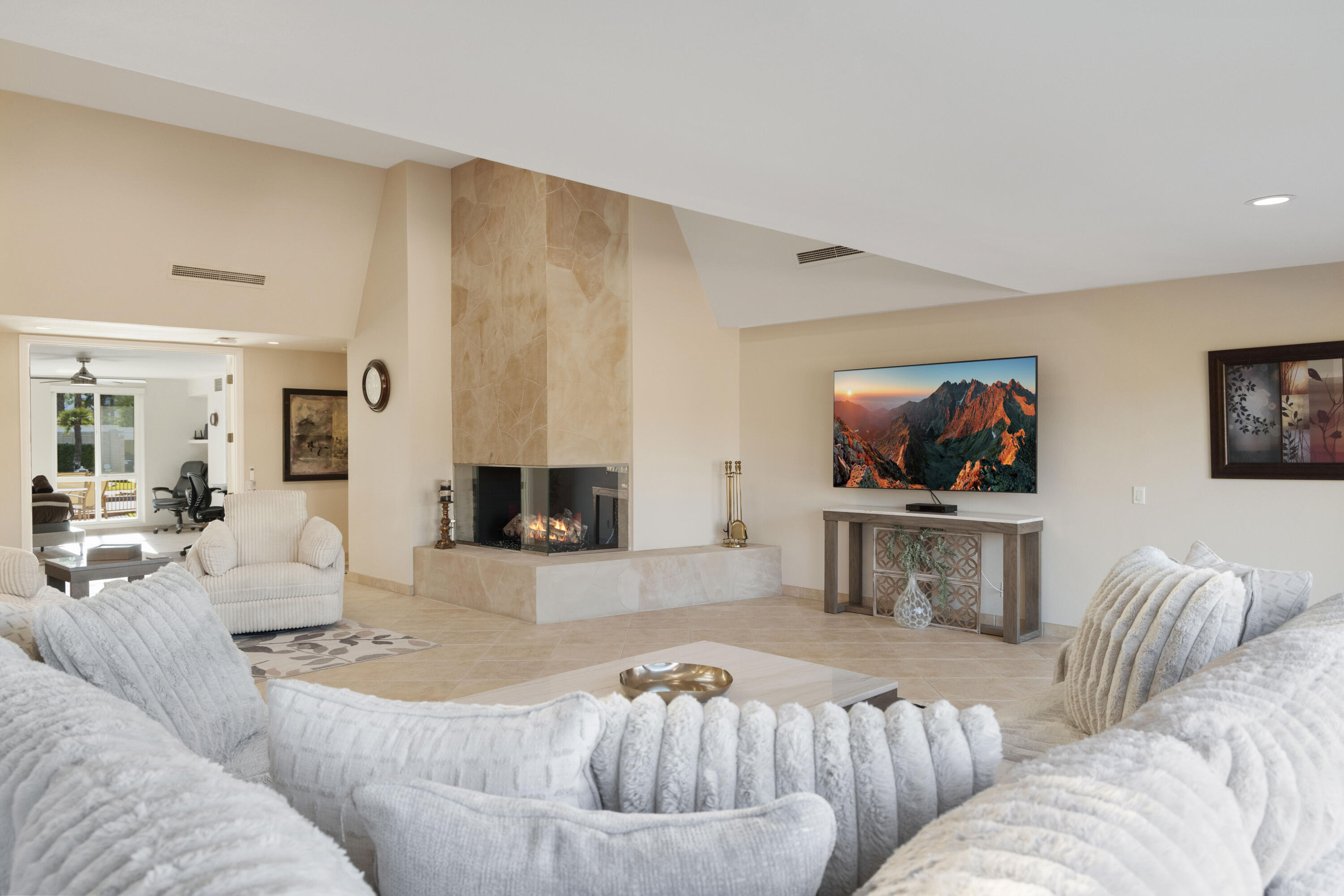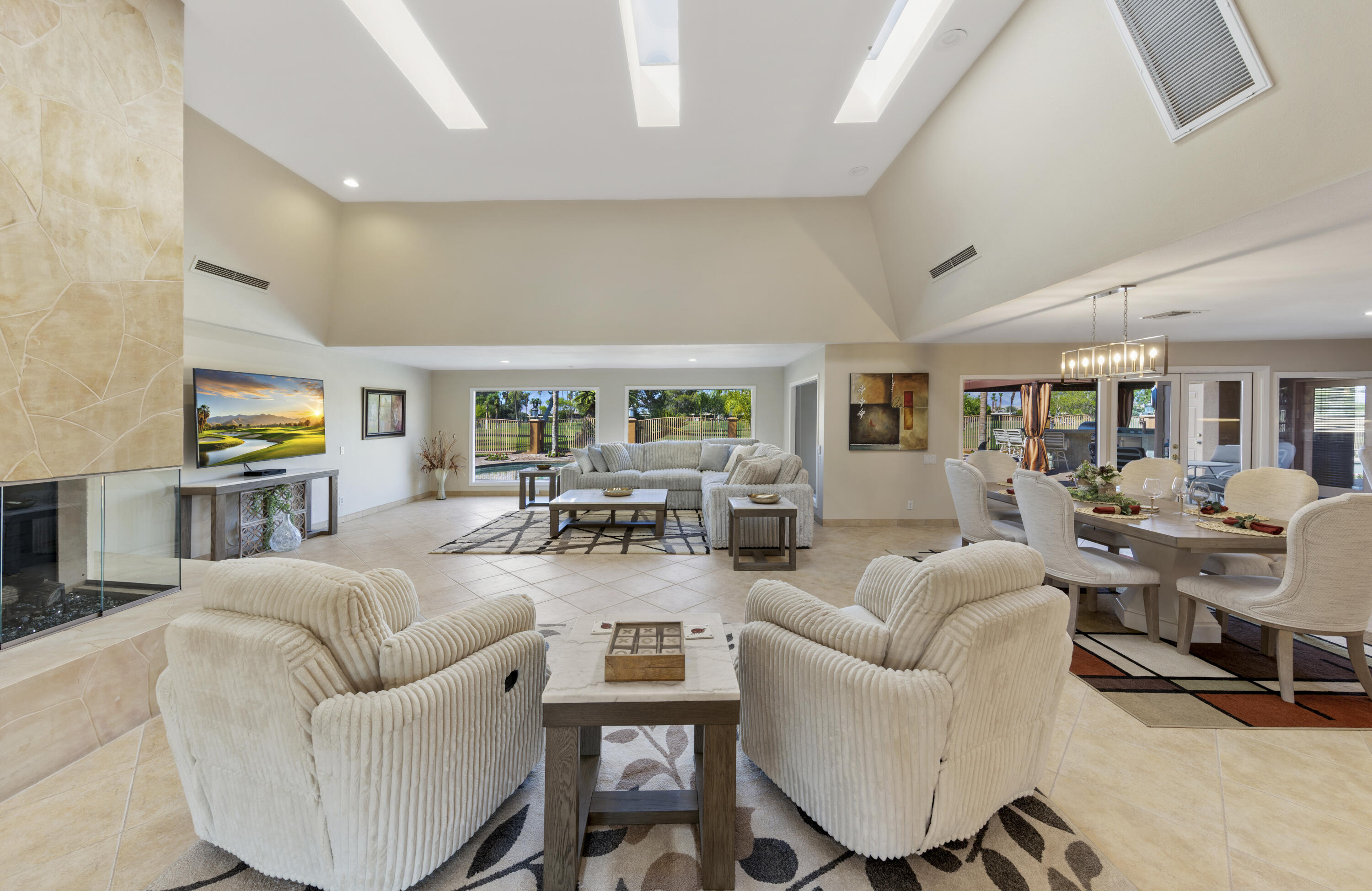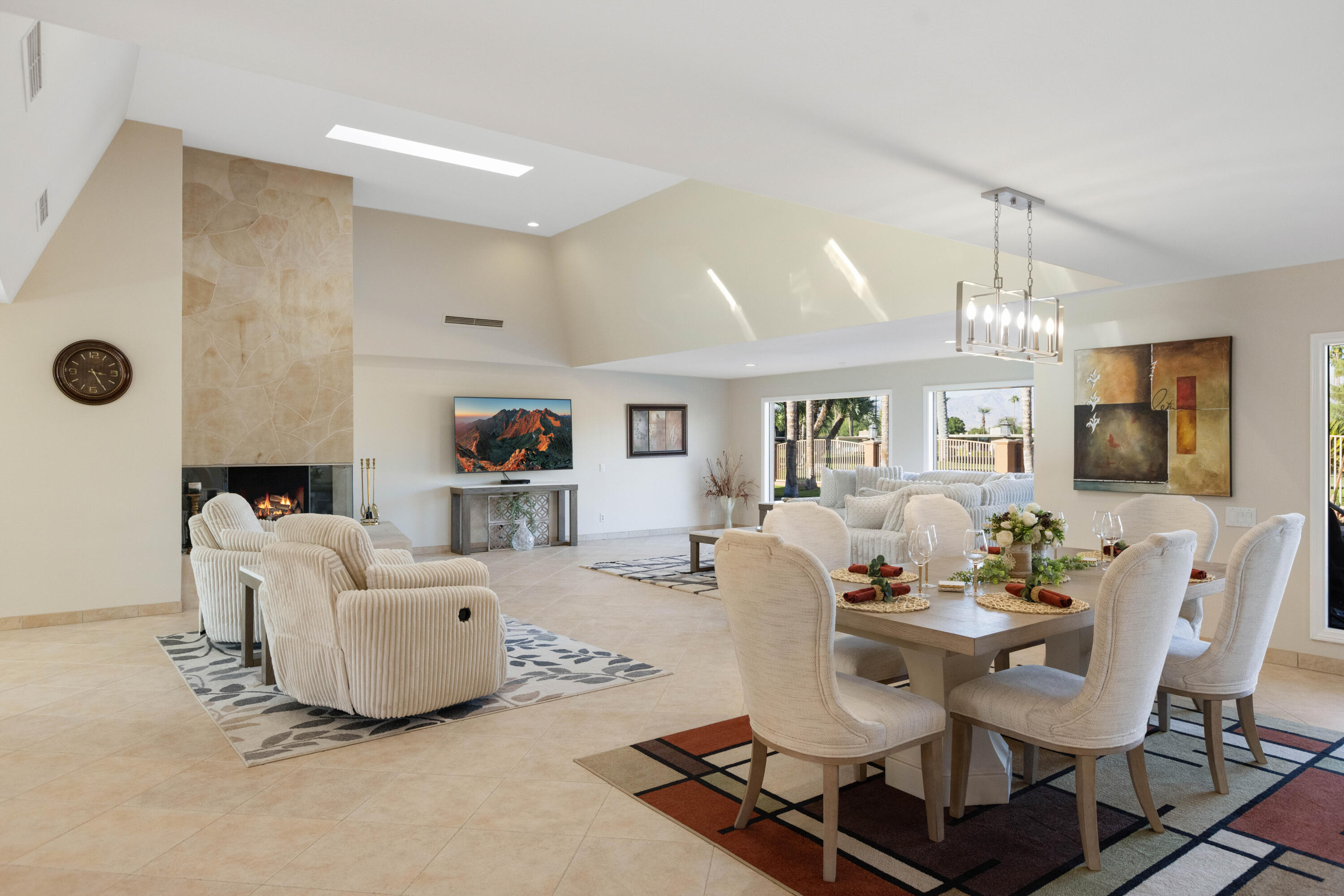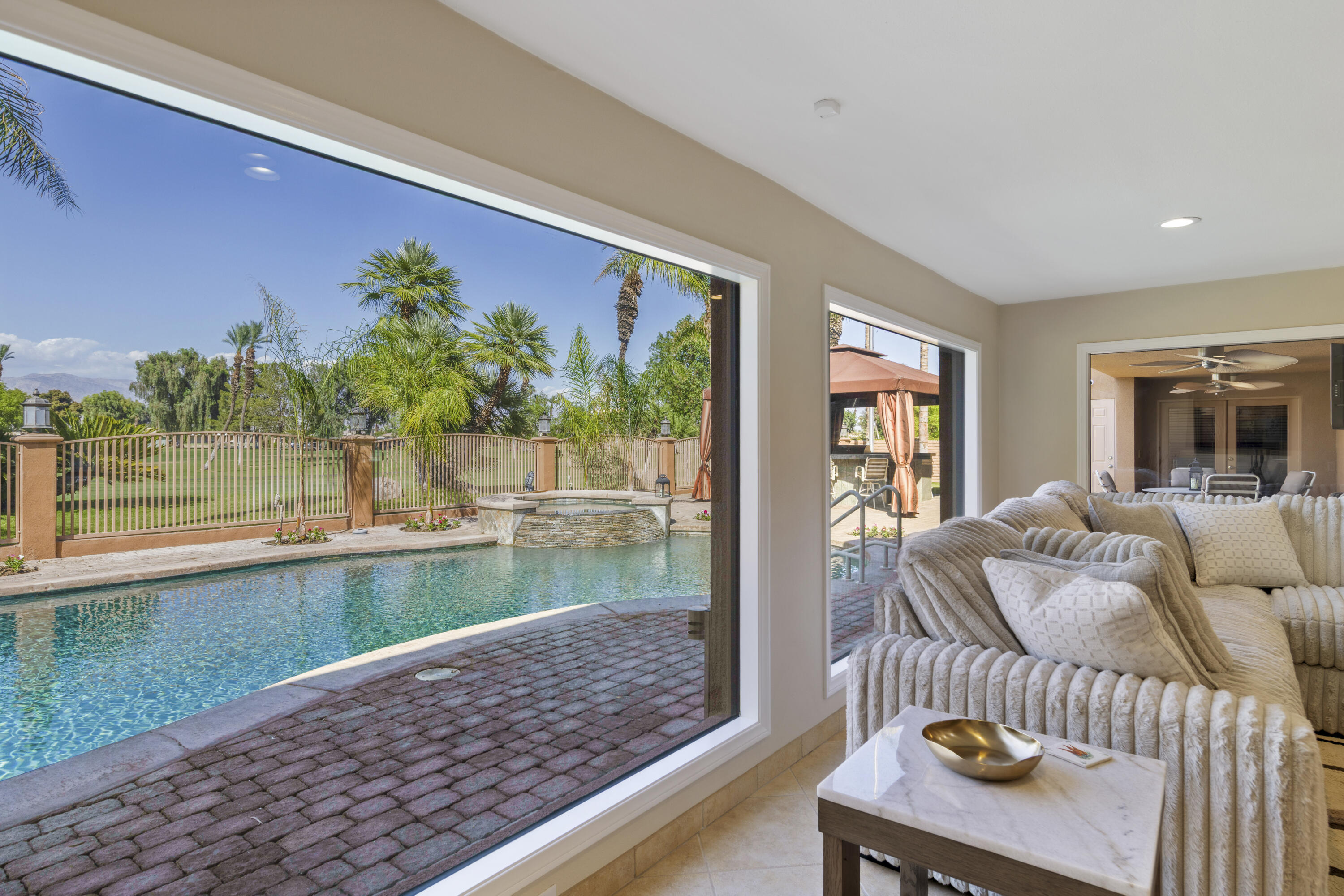 Nestled against the picturesque backdrop of the Bob Hope Classic Golf Course, this exquisite home boasts mesmerizing views of the 18th and 1st fairways alongside breathtaking mountain views. Designed with a thoughtful split floor plan, this property is ideal for a large family or those who love to entertain. The impressive double-glass door entry flows to a spacious great room featuring a cozy fireplace, which seamlessly connects the open-concept design to the dining area and kitchen, creating the perfect environment for gathering. The home features three oversized primary bedrooms with their own ensuite bathrooms and walk-in closets offering both privacy and comfort. A fourth bedroom provides flexibility, doubling as an office or study. The family room or den is a true multifunctional space--it can serve as a fifth bedroom with a half bath or be easily transformed into a second two-car garage. This home truly shines in its outdoor offerings with a covered patio, saltwater pool and spa, a soothing fountain, and a covered cabana outfitted with BBQ, sink, and granite bar. It's not just a home, it is a lifestyle. Partially Furnished and move-in ready.Interested in this Listing?