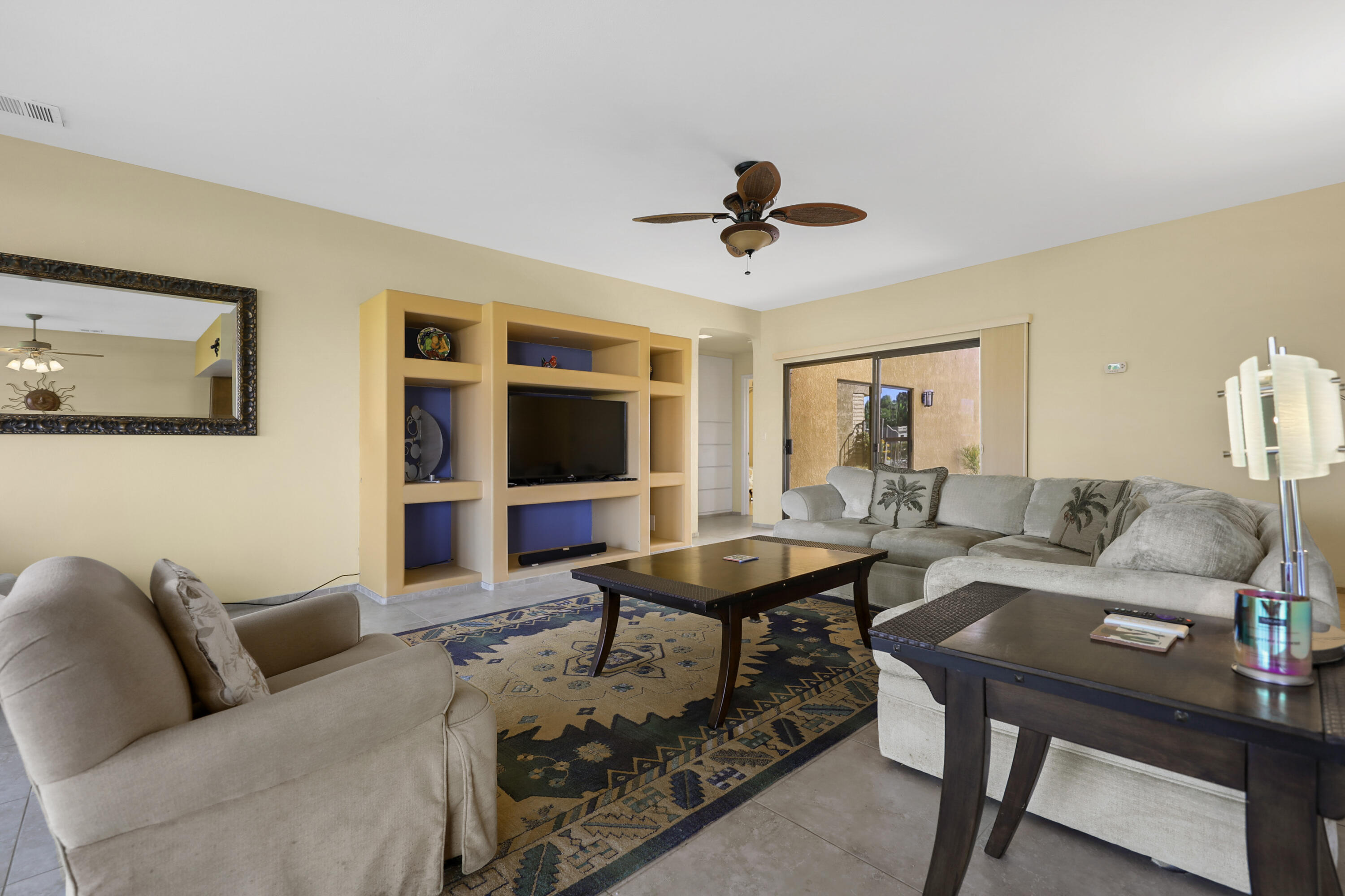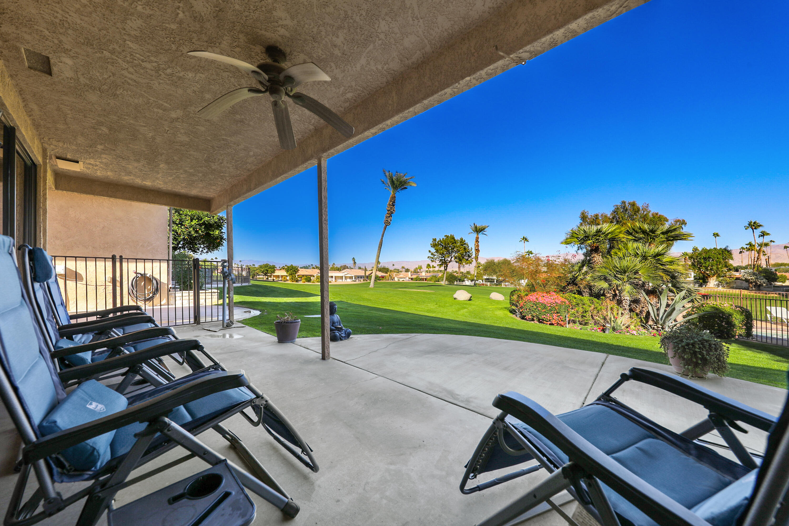 Beautiful Mountain and Pool views from this spacious condo located on the 2nd hole of the famous Bermuda Dunes Country Club. Home features THREE bathrooms and THREE large bedrooms. New cabinets in all of the bathrooms recently installed. Gourmet kitchen boasts granite countertops, custom tile backsplash and warm wood cabinets - plus a convenient wet bar. Kitchen is adjacent to the dining area, which flows into the Texas-sized Great Room with built-in entertainment center plus walls of glass which bring in lots of light. The glass sliders open to the expansive patio area which is great for entertaining or just enjoying the terrific VIEWS. The primary bedroom has plenty of room to roam and also a slider to the rear patio, plus its own full bathroom and walk-in closet. The other two bedrooms, each with a 3/4 bath, are separated by a convenient center patio with flowers and views of the SOUTH mountains. Home has a laundry room, which also houses the water heater. There is a detached, oversized two-car garage which is steps from the home. IID for lower electric. BD Security of $214 a month includes cable TV with Showtime/HBO/Cinemax plus internet with Spectrum and 24-hour guard gated security. Prado Verde HOA of only $560 a month includes exterior maintenance (incl. roof), gardening, pool/spa maintenance, trash and water. Bermuda Dunes Country Club offers many options for membership, but you do NOT have to join - See attached membership informationInterested in this Listing?