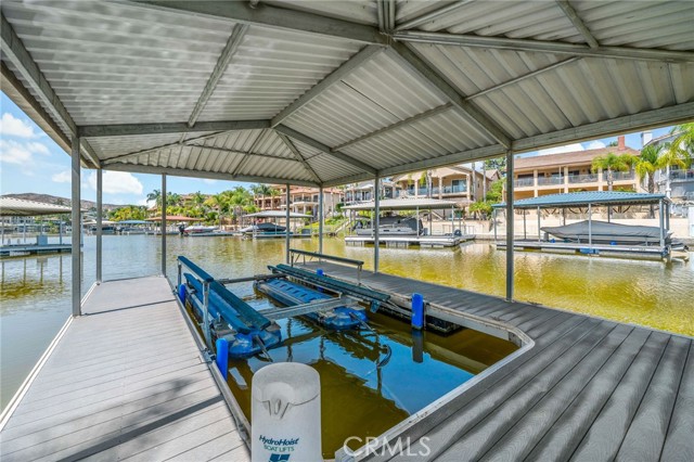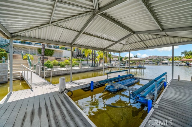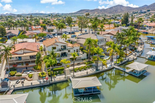 Amazing home on a quiet canal w private boat dock lift. Enjoy lake front living in this 4 bed, 3.5 bath, 3100 sq ft home w incredible custom interior construction features for seismic safety and ZERO fire rating. Elegant touches throughout this welcoming home with 1 bedroom and ensuite full bathroom downstairs and separate entrance to side yard. Features include an entry foyer w lighted alcove that leads to the living room w walk-in wet bar and adjacent family room, both served w a dual facing fireplace AND direct access thru sliding glass doors to the back patio w lake views. The kitchen is open the informal dining area with a vaulted ceiling and circular bank of windows offering lake views. The large primary bedroom features vaulted ceiling, ceiling fan and an extensive balcony w fabulous lake views. The spacious primary bathroom features large vanity w dual sinks and a separate tub and walk-in shower w heating and seating bench. The two large secondary bedrooms upstairs include oversized closets w built-in shelving and are served by the hall bathroom. The oversized laundry room is upstairs and features a deep sink, plenty of storage space and under cabinet lighting. The large garage features extensive lighting, skylights, built in storage, a second washer & dryer hookup station and a heat pump powered water heater that also serves as a cooling system. RV hookups are in the extended driveway for RV compatibility w 110&220 connects, dump station and cable. Just steps away from the back patio is 70 feet of water frontage that leads to the covered dock w electric boat lift so you can conveniently enjoy the lake and boating lifestyle of Canyon Lake. The home has a paid 40 panel solar power system w new inverter for fantastic energy cost savings. HOA amenities include a HUGE clubhouse w restaurant, meeting space, pool & spa, fitness center, plus sports courts, equestrian facilities and multiple parks in addition to the Canyon Lake Golf Course. See this special home today.Interested in this Listing?