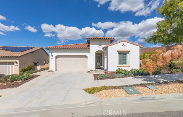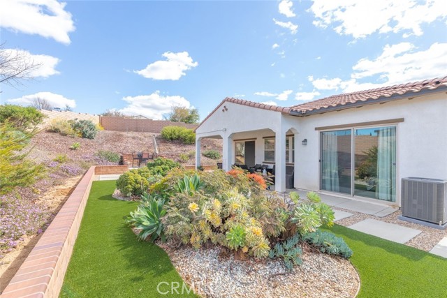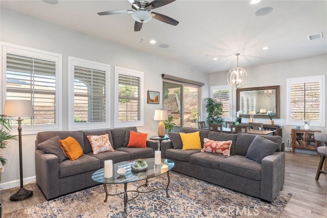 Welcome to this beautifully upgraded 2-bedroom, 2-bathroom home with an additional office, located in a vibrant 55+ community with incredible amenities. Situated on a desirable corner lot, this home boasts an open floor plan with soaring cathedral ceilings, custom lighting fixtures, and plantation shutters throughout. The spacious living area is the perfect space for relaxation or entertainment. The modern kitchen features sleek quartz countertops, beautiful cabinetry and a large pantry. The primary suite is a private retreat with a generous walk-in closet, a separate linen closet, and direct access to the backyard through a sliding glass door. The second bedroom and dedicated office space offer flexibility for guests or hobbies. The home also includes a large laundry room with a sink and tons of storage. This home features a water softener, tankless water heater and solar for added efficiency. Step outside to enjoy the beautifully designed backyard, featuring high-quality artificial grass, extensive hardscaping, and lush greenery, including a lemon tree and a mandarin orange tree. The California room provides a shaded, year-round outdoor living space, perfect for relaxing or entertaining. The backyard is private, with two sliding doors leading outside one from the family room and another from the primary bedroom offering seamless indoor-outdoor living. Raised garden beds and an in-ground sprinkler system keep the landscaping thriving with minimal maintenance. Outdoor furniture and potted plants are included, making the backyard an inviting retreat from day one. Security is covered with two cameras and a Ring system included. Enjoy breathtaking views from both the front and backyard while living in a community that offers a clubhouse, pool, and a variety of social events and activities. Hiking trails are nearby for those who love the outdoors, and with low HOA fees and low taxes, this home is as practical as it is beautiful. Refrigerator, washer, and dryer are included. Patio furniture and certain furnishings will also be included in sale move-in ready and waiting for you!Interested in this Listing?