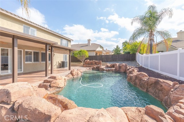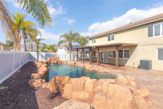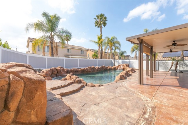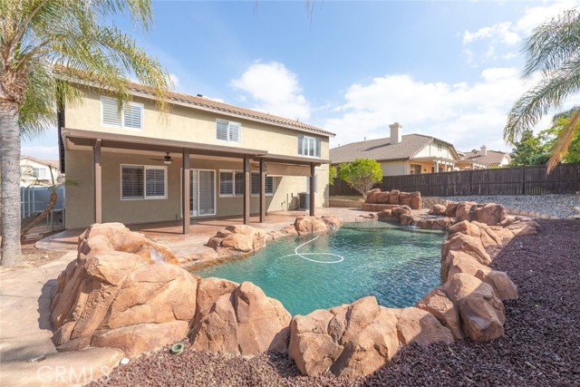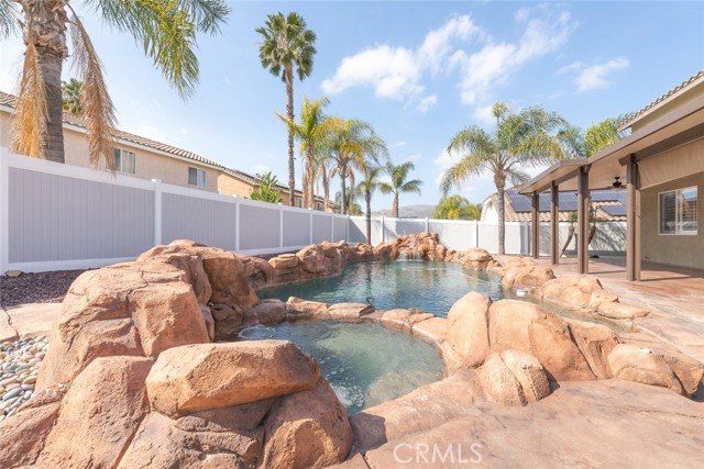 Nestled in the desirable Horsethief Canyon community, this beautifully updated home features a unique and versatile floor plan with two downstairs bedrooms perfect for guests or a home office setup. Step inside to discover stunning porcelain tile floors throughout, new interior paint, and a warm, inviting family room with a gorgeous fireplace. The fully remodeled kitchen and tastefully renovated bathrooms blend modern elegance with everyday comfort. Ceiling fans and window shutters throughout enhance both comfort and style, making this home truly move-in ready. Outside, enjoy your own private retreat, complete with a spacious patio cover and a custom rock pool ideal for relaxing or entertaining in style, all from the comfort of your backyard. Additional features include a 3-car garage, offering plenty of room for vehicles, storage, or hobby space. Don t miss out on the chance to make this exceptional house your home! LOW TAXES HERE!Interested in this Listing?