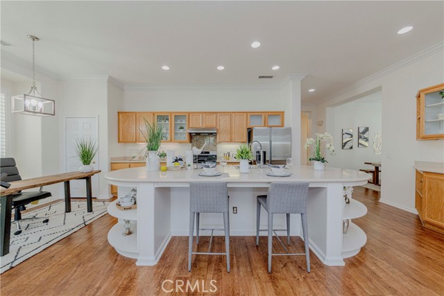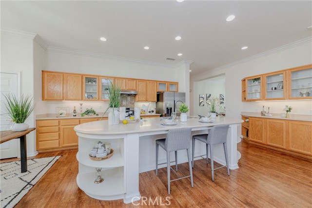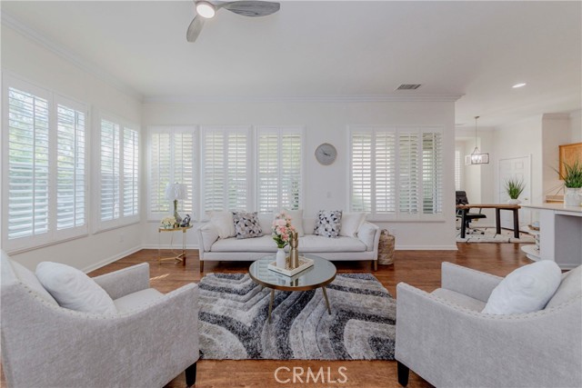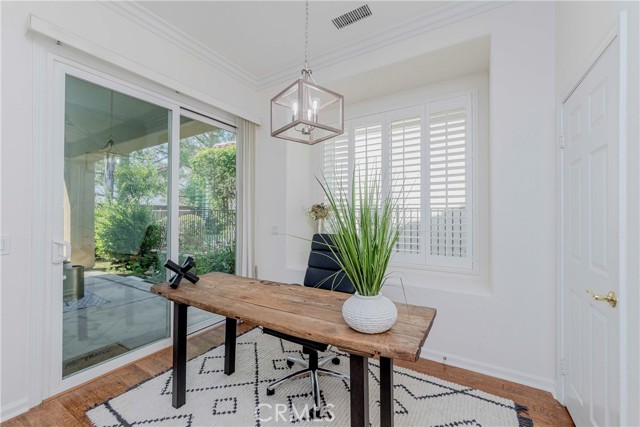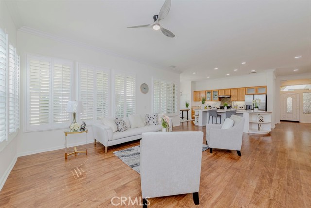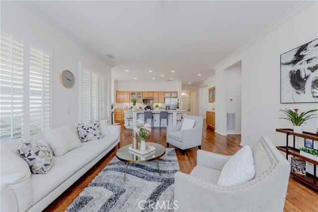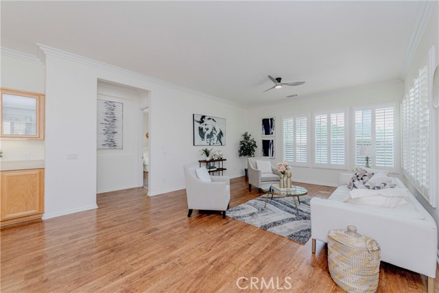 Welcome to this stunning, upgraded home located in the prestigious 55+ gated community of Trilogy at Glen Ivy, Southern California s premier active adult neighborhood nestled at the base of the Cleveland National Forest. This beautifully maintained single-story residence offers an open and airy floor plan with high ceilings, upgraded laminate flooring, fresh paint, crown molding, and baseboards throughout. The heart of the home is a spacious great room that flows effortlessly into a gourmet kitchen, featuring corian countertops, an oversized center island with breakfast bar, extended cabinetry with decorator glass doors, and a charming breakfast nook that opens to a covered outdoor patio perfect for relaxing or entertaining. The private primary suite is a true retreat, sliding doors to a separate patio area, a generous walk-in closet with built-in shelving and cabinets, and an en-suite bathroom with plenty of storage space. A secondary bedroom and full bathroom are situated away from the main living areas, providing comfort and privacy for guests. Additional highlights include a formal entry with a custom designer front door, a cozy formal dining room, new ceiling fans, an epoxied garage floor, and upgraded technology wiring throughout. The backyard offers pick-a-boo view of the mountains, adding to the peaceful ambiance of the home. Residents of Trilogy at Glen Ivy enjoy access to an array of resort-style amenities, including championship golf, tennis courts, two heated swimming pools, a state-of-the-art fitness center, walking trails, Glen Ivy Spa, a full-service clubhouse, and a variety of clubs, classes, and social activities. This home is the perfect blend of comfort, style, and vibrant community living.Interested in this Listing?