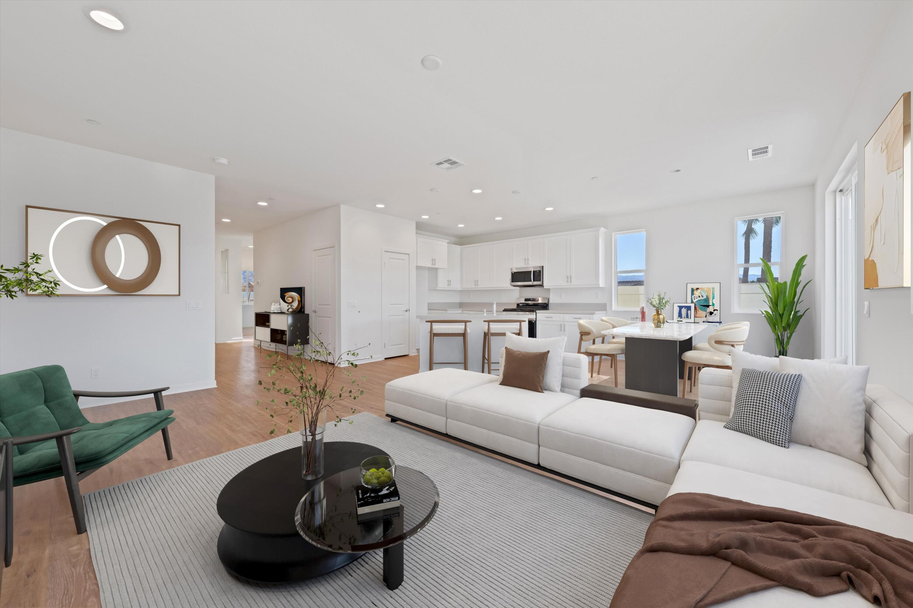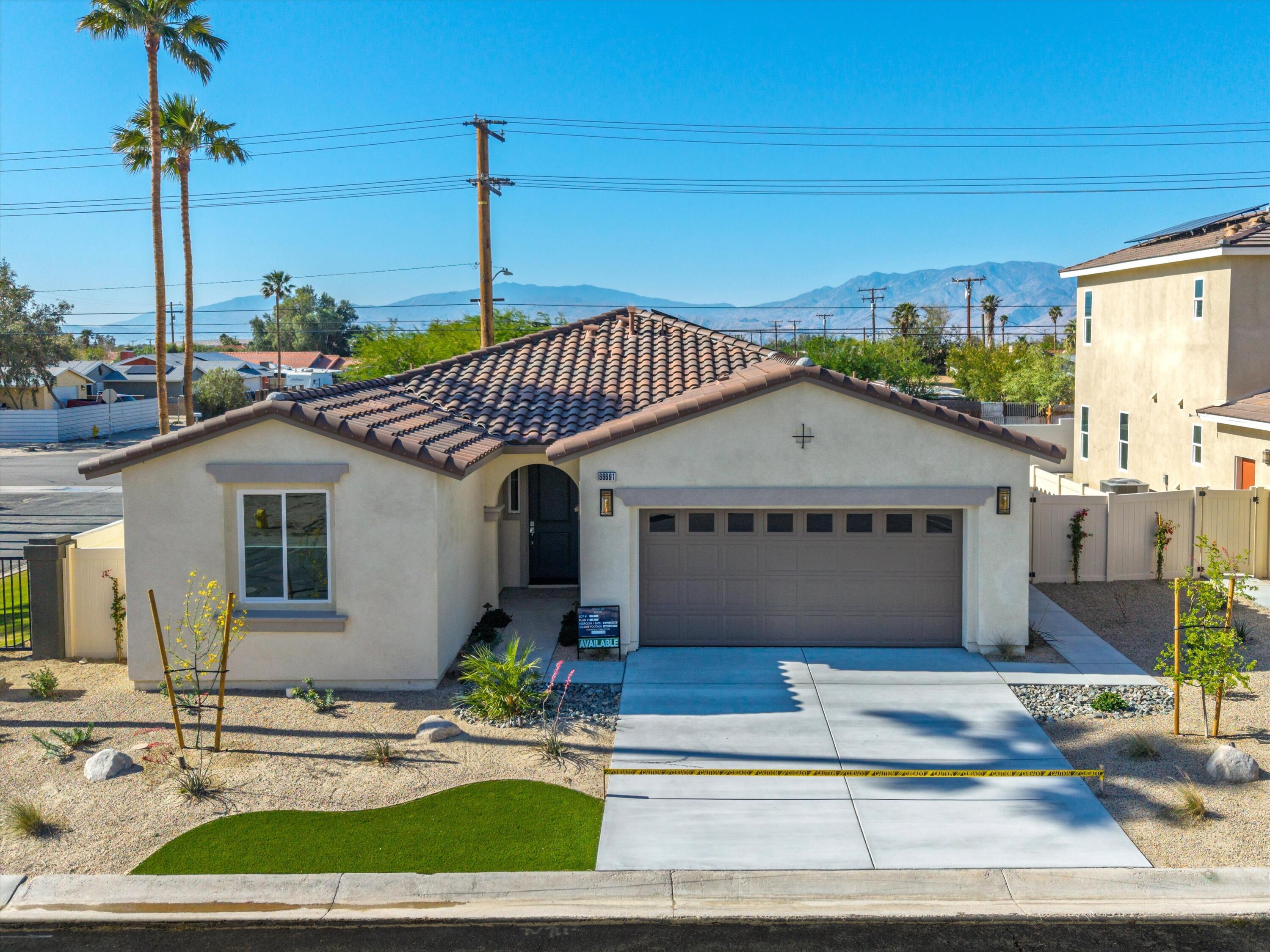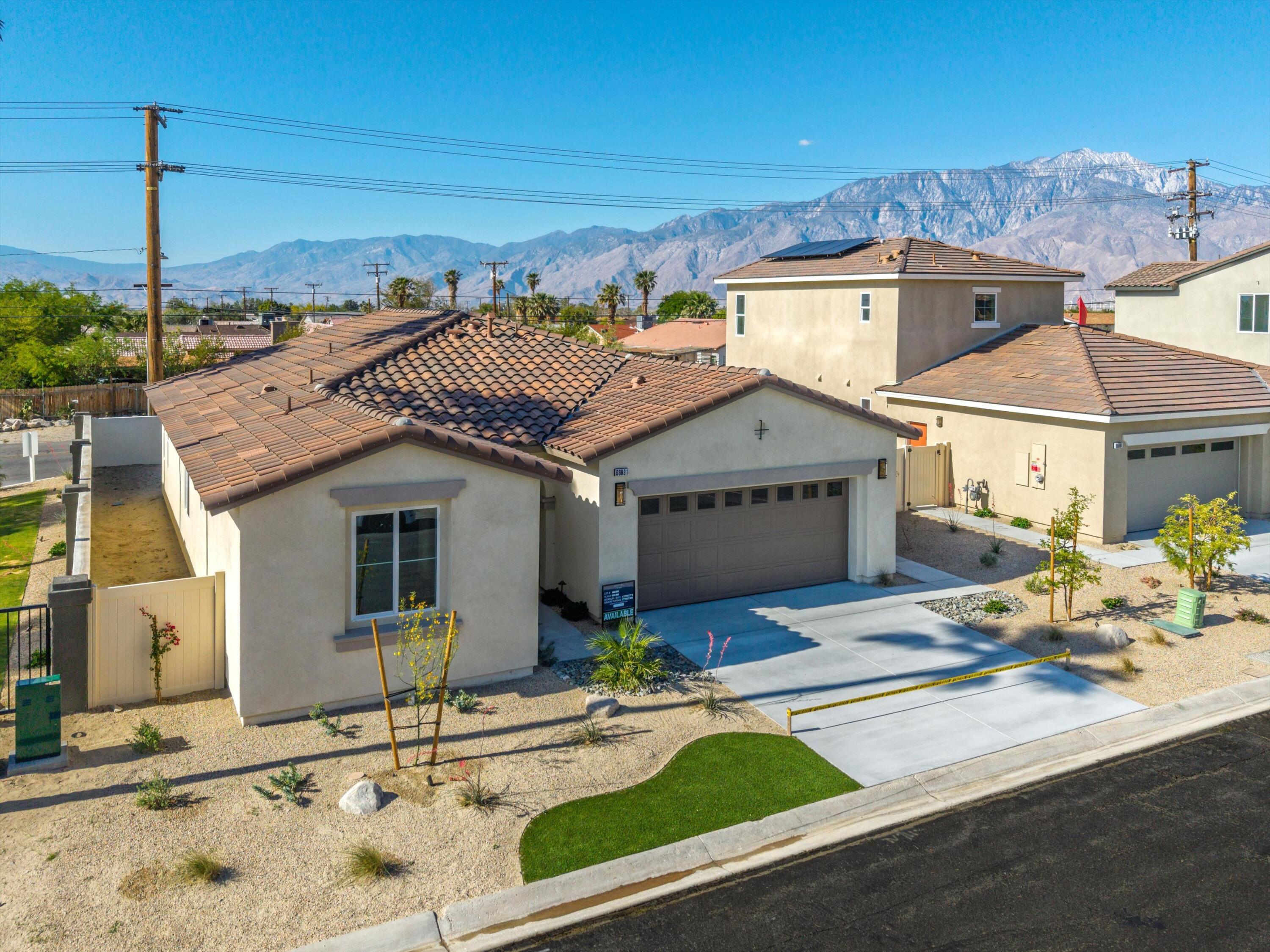 Wow!! Hurry this home is ready to move in and has just been reduced $25K!! You do not want to miss this opportunity to buy such a great Brand New Home for under $400k!! 3 bedroom 2 bath and fully Landscaped in a Gated Community Located just minutes from the I-10 Freeway, Palm Springs International Airport, and vibrant Downtown Palm Springs, this stunning new home offers the perfect blend of convenience and luxury. Key Features: Buyer-Owned Solar System: Included in the purchase price, this eco-friendly feature not only reduces your carbon footprint but also saves on energy costs. Spacious Living Areas: Thoughtfully designed to maximize comfort and functionality, perfect for entertaining or relaxing. Modern Kitchen: Equipped with upgraded cabinets and beautiful White Quartz countertops, ideal for culinary enthusiasts. Flooring: Durable vinyl plank flooring throughout the main areas, complemented by upgraded carpet in the bedrooms for added warmth and comfort. Smart Home Features: Pre-wired for a home alarm system, ceiling fans in the living room and all bedrooms, flatscreen TV outlets in the living room and primary bedroom, and an electric vehicle charging station for eco-conscious owners. Enjoy the best of Palm Springs living with its vibrant culture, stunning natural beauty, and endless opportunities for outdoor activities. This home offers a unique combination of style, convenience, and a great neighborhood, making it an exceptional choice for those seeking a luxurious desert lifestyle. Low hoa fees of $143/mo.Interested in this Listing?
