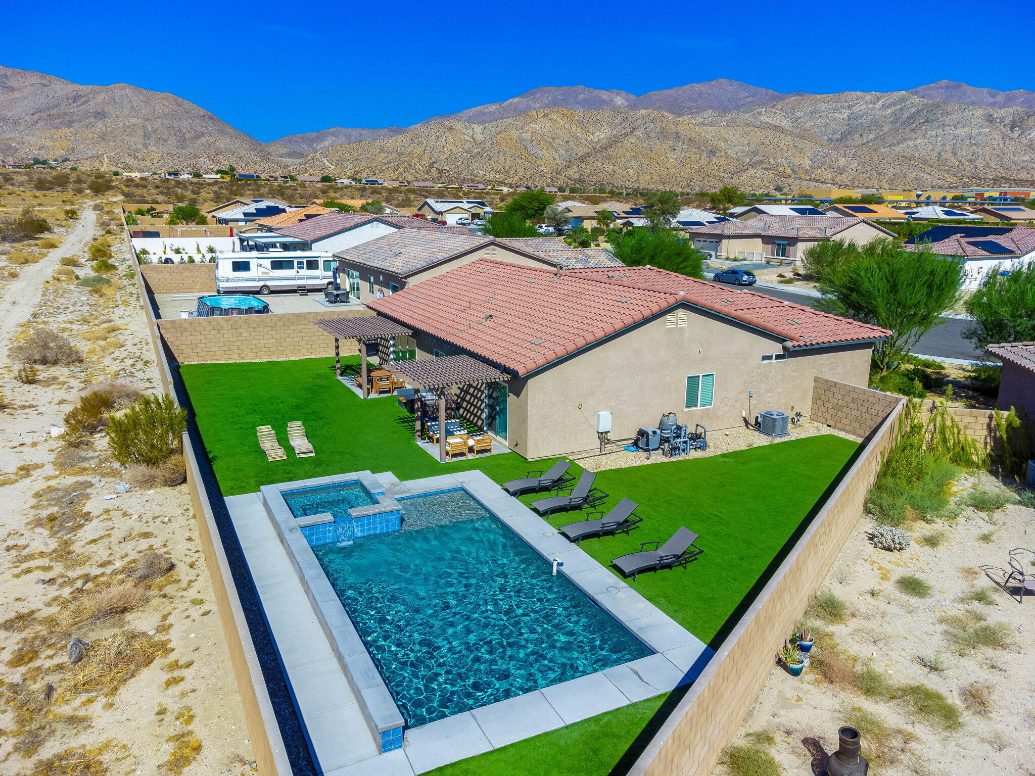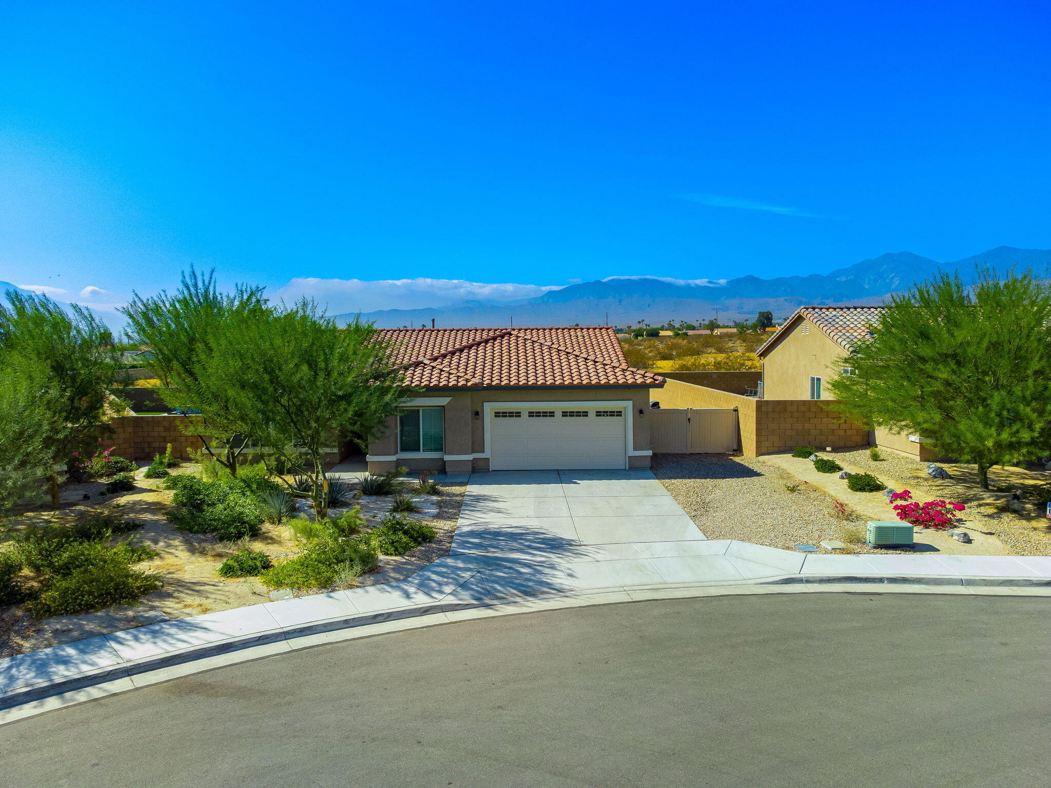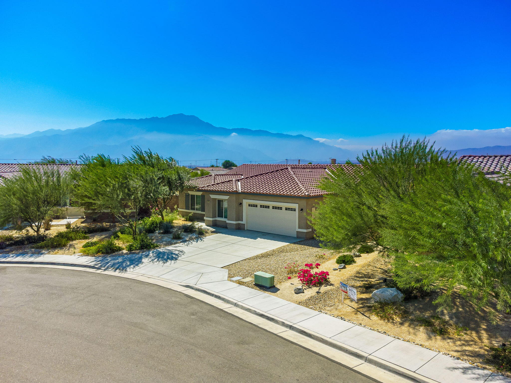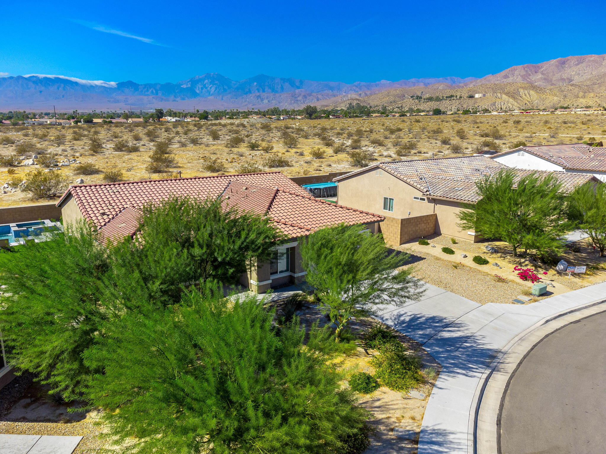 Fantastic short term rental income producing property, this Mediterranean Masterpiece with Panoramic San Jacinto Mountain Views. Experience desert living at its finest with this beautiful Mediterranean-style home, perfectly situated in the exclusive Sunset Springs community, just minutes from Palm Springs, CA. This 4-bedroom, 3-bathroom residence offers unmatched San Jacinto Mountain views that are best appreciated in person. Spanning 2,125 square feet, the home boasts a thoughtful design with high ceilings and recessed lighting that create an open, airy atmosphere. The sophisticated interior features luxury vinyl flooring throughout, adding a modern touch. The gourmet kitchen is a chef's dream, complete with granite countertops, a custom backsplash, and ample cabinetry for storage. Outdoors, the property shines with a brand-new custom-built saltwater pool, perfect for those looking to unwind and enjoy low-maintenance desert living. The yard features turf grass for ease of care, while the spacious driveway includes RV parking, catering to all your recreational needs. This home is being sold turn-key, fully furnished, and move-in ready, making it a perfect option for investors interested in breaking into the short-term rental market or for families looking for a vacation retreat. Situated next to Mission Lakes Country Club and only a short drive to the world-renowned amenities of Palm Springs.Interested in this Listing?