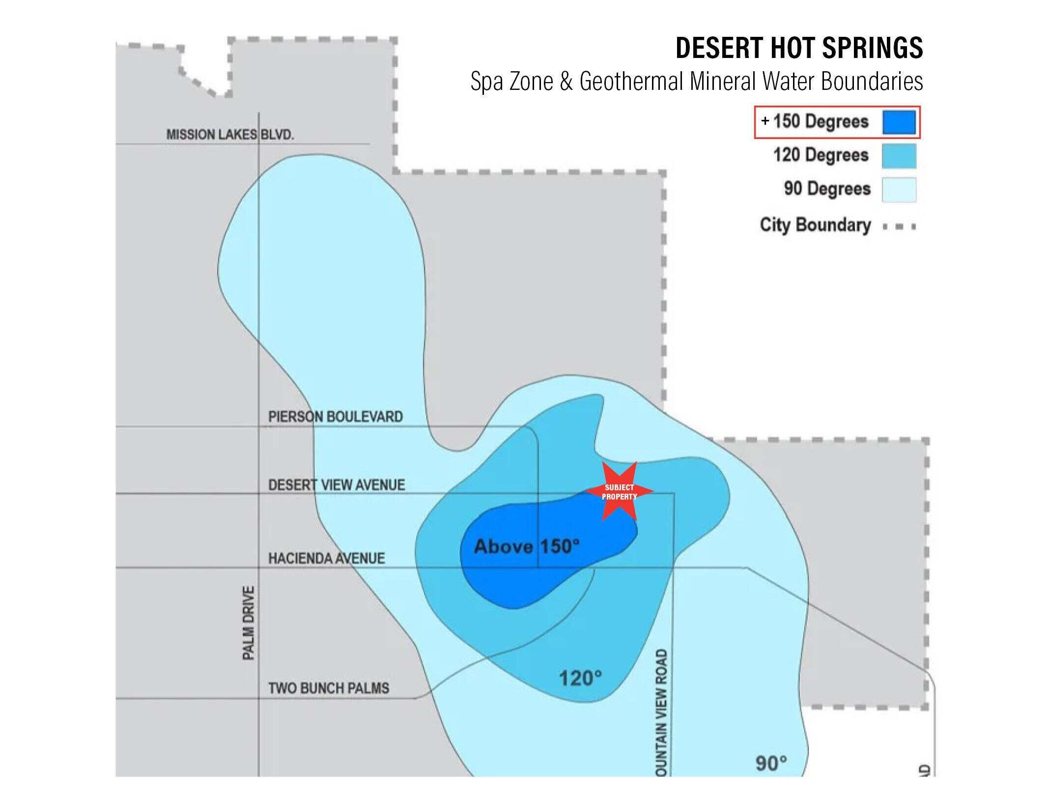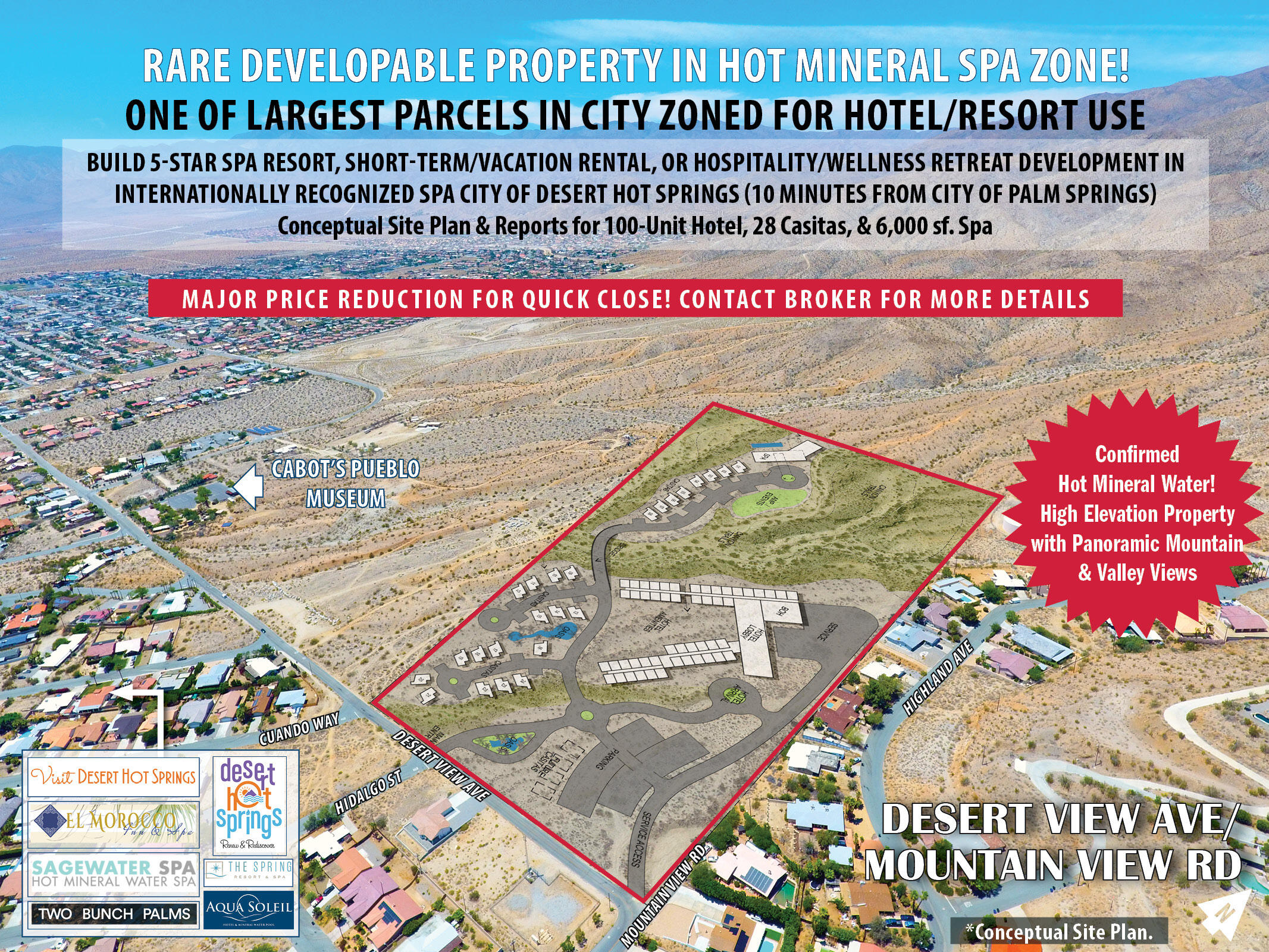 'DESERT VIEW/MOUNTAIN VIEW 20-ACRE HOT WATER RESORT' is a prime developable land property with hotel zoning (zoned 'VS' - Hotel/Hot Water Resort) in the city; and is also within the Hot Mineral Springs Zone with an existing hot water well (194 degree water). The property is located in the most desirable area of Desert Hot Springs and has spectacular views of the surrounding adjacent hills & Mt. San Jacinto. This irreplaceable property sets itself apart from the competition, and offers a peaceful and tranquil setting for a one-of-a-kind hot water resort. Attractions nearby include Cabot's Pueblo Museum, and spectacular hiking trails nearby and not far in Joshua Tree, and with only a 10-minute drive to Palm Springs. Potential buyers/developers should also consult with the city of Desert Hot Springs to see whether the city will apply the benefits of its Spa Revitalization Program to new construction. The Spa Revitalization Program allows operational spa properties that undergo renovations to apply to have 100% of the net increase in monthly transient occupancy tax waived for up to two years.Interested in this Listing?
