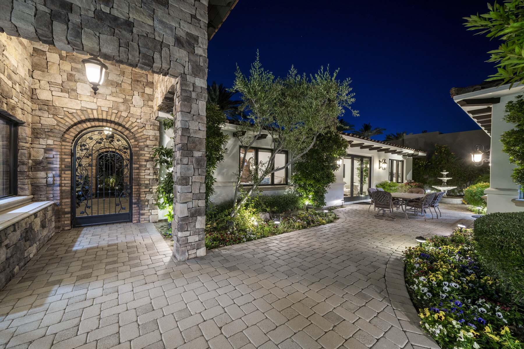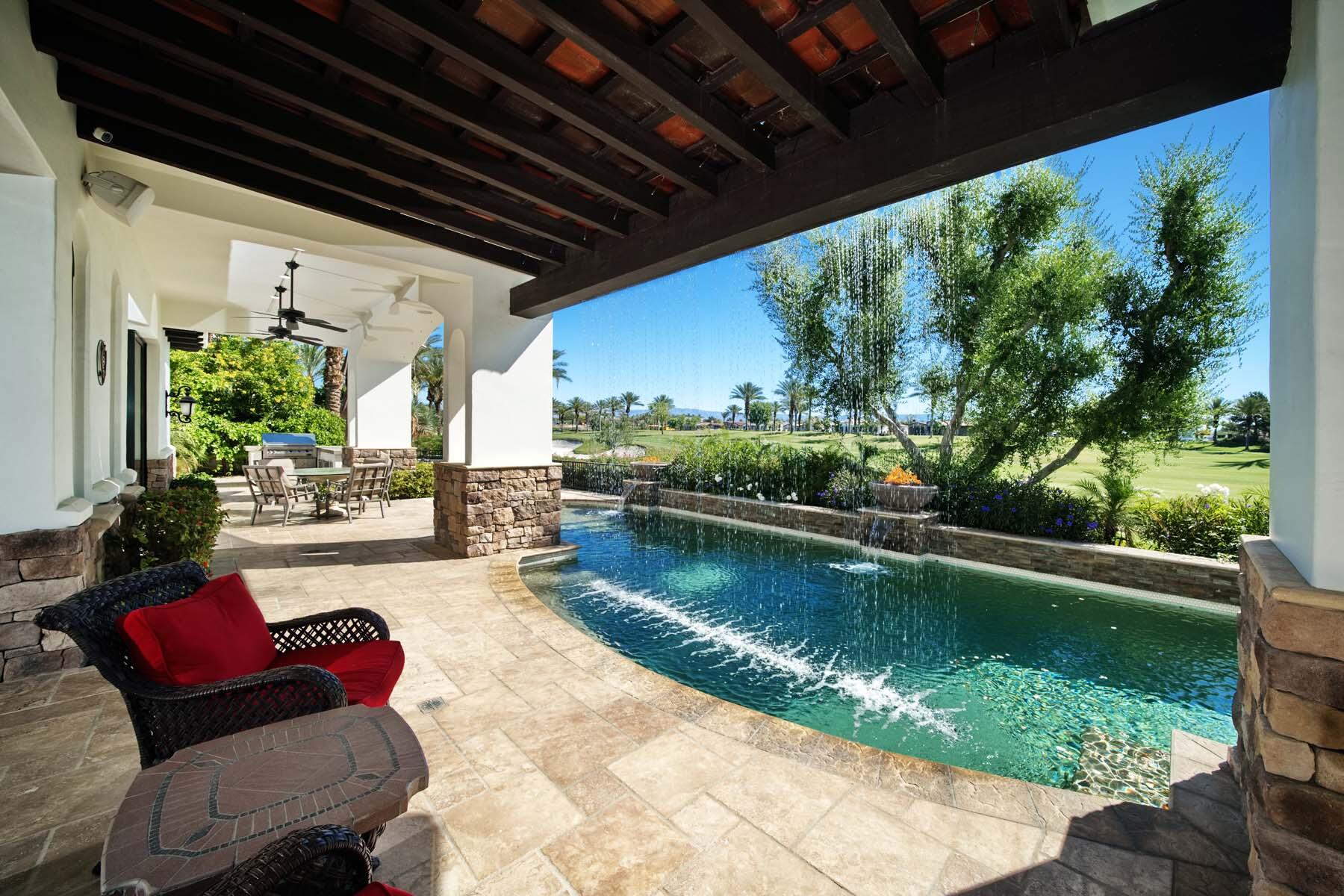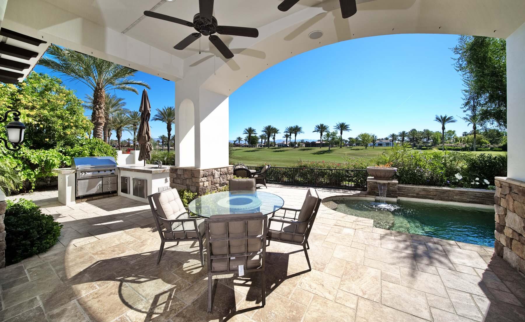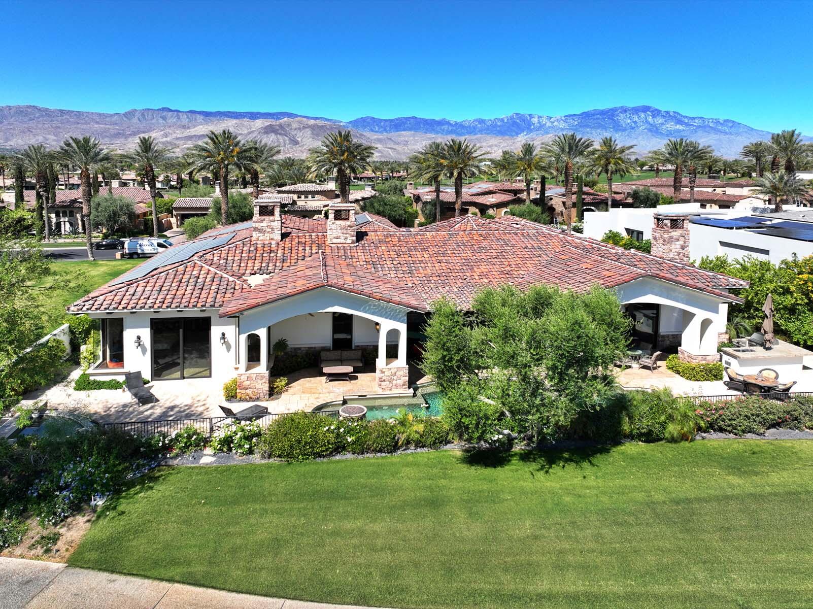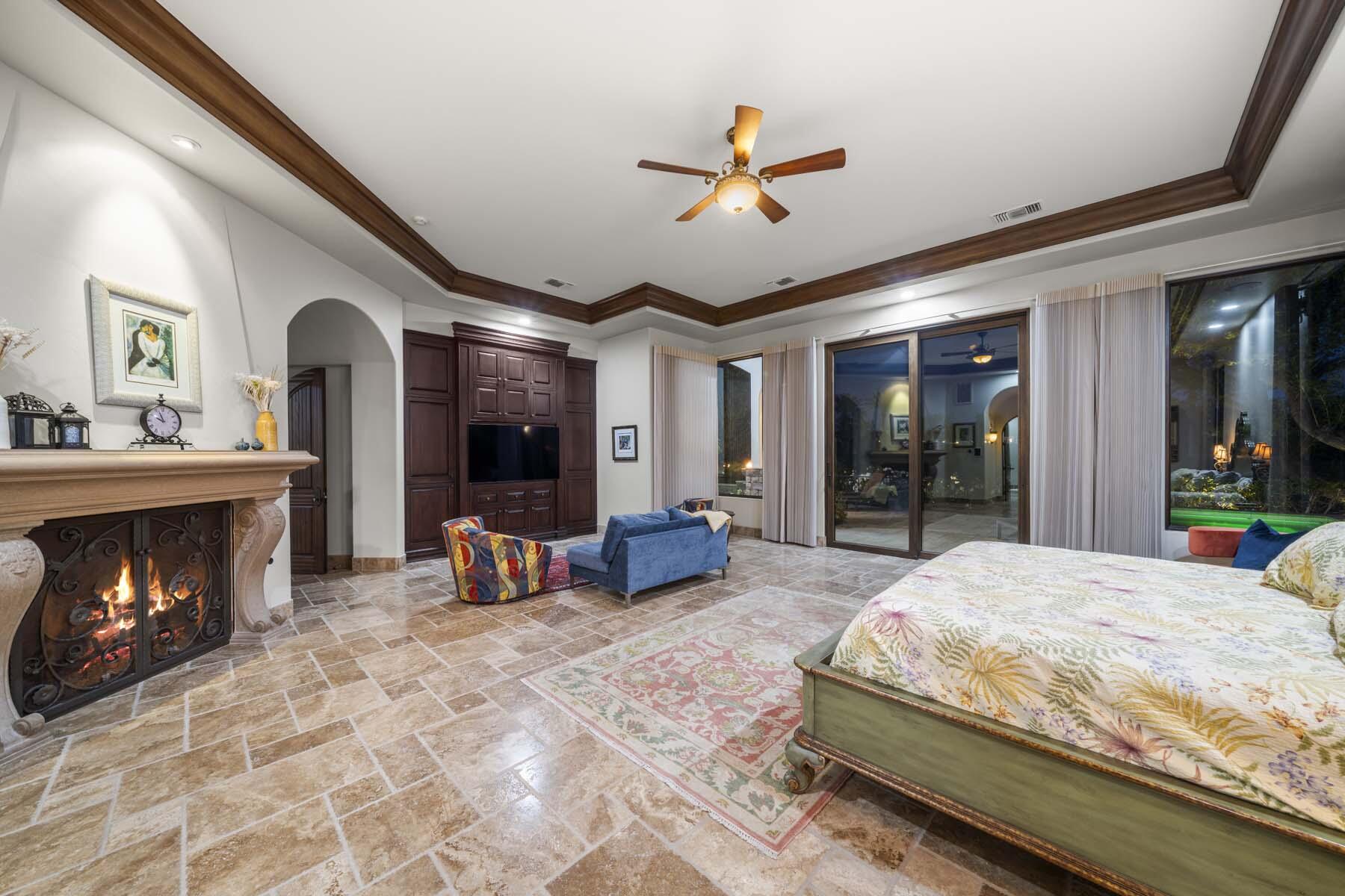 Situated on the 18th hole of Toscana's coveted South Course, this custom estate offers breathtaking panoramic views of the fairway and surrounding mountains. Designed for seamless indoor-outdoor living, the home features travertine floors, elegant crown molding, and two sets of pocketing glass sliders that open to a stunning backyard retreat. The outdoor space is a true showstopper, complete with a custom pool showcasing water and fire features, a built-in barbecue, new landscaping, and decorative wrought iron fencing--perfect for both relaxing and entertaining. A detached two-bedroom guest house with a sitting area and kitchenette provides luxurious accommodations for visitors. The versatile floor plan includes a bonus room that can serve as a fifth bedroom or a media room, offering flexible living space to suit your needs. Recent enhancements include four new high-efficiency HVAC systems with NEST thermostats--three serving the main residence and one for the guest house--plus ductless mini-split systems in both garages. A new refrigeration system with advanced controls supports the temperature-controlled wine cellar. The home is fully outfitted with recessed LED smart lighting, Lutron switches and outlets, and a 14-zone audio system with 16 speaker pairs, all managed through four wall-mounted iPads offering integrated SMART control of lighting, pool features, cameras, thermostats, and audio. Additional features include full interior and exterior paint, dual COVE dishwashers, LG washer and dryer, and owned solar for maximum energy efficiency.Interested in this Listing?