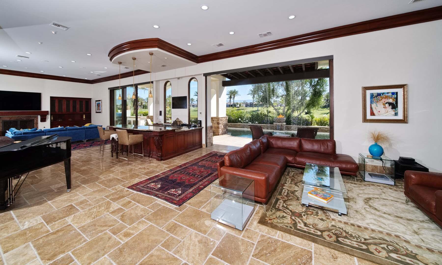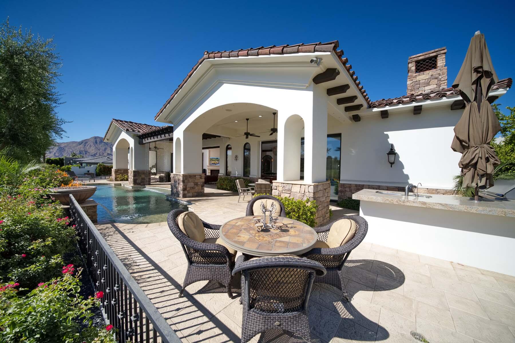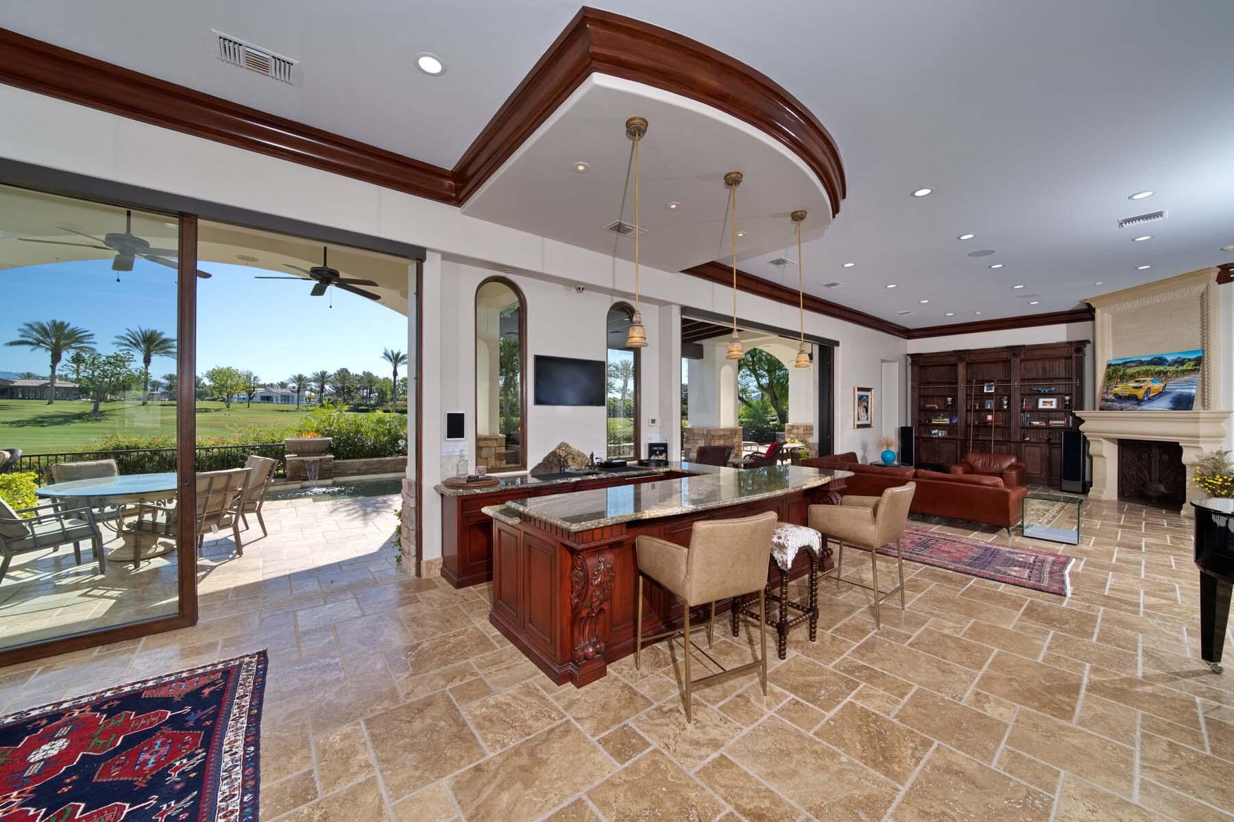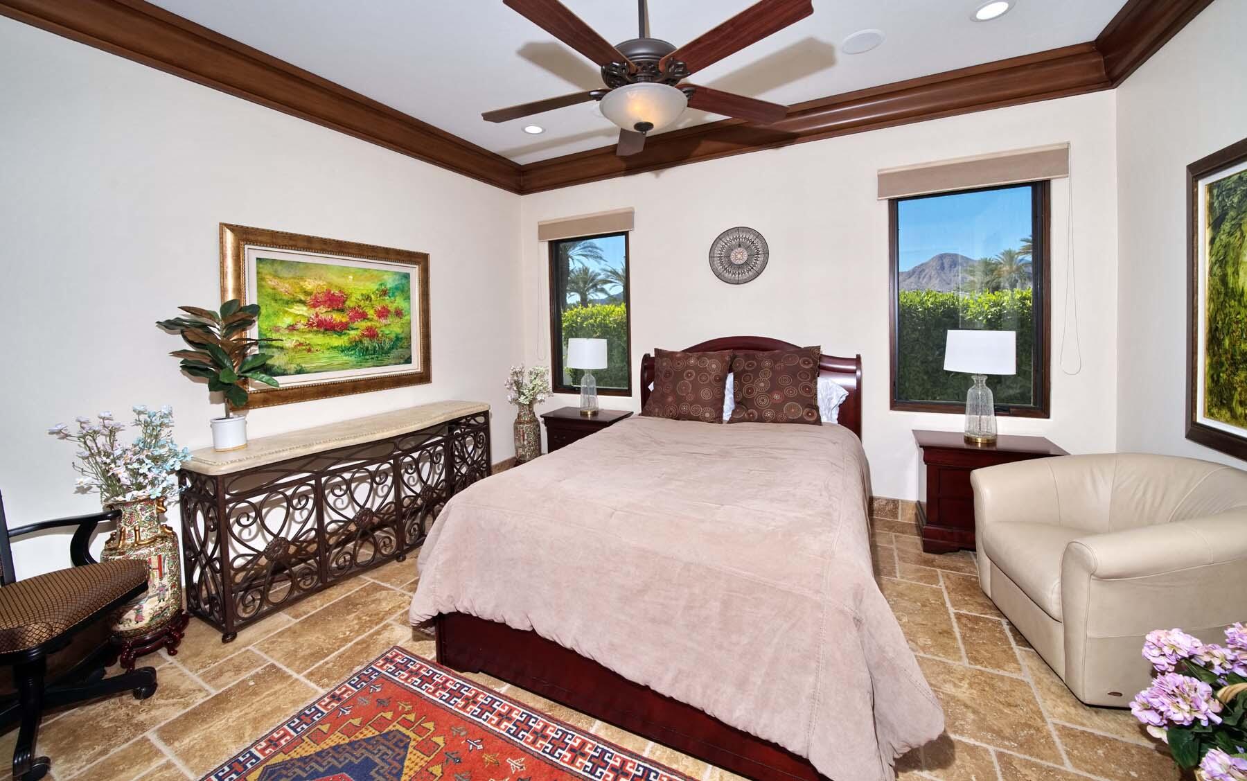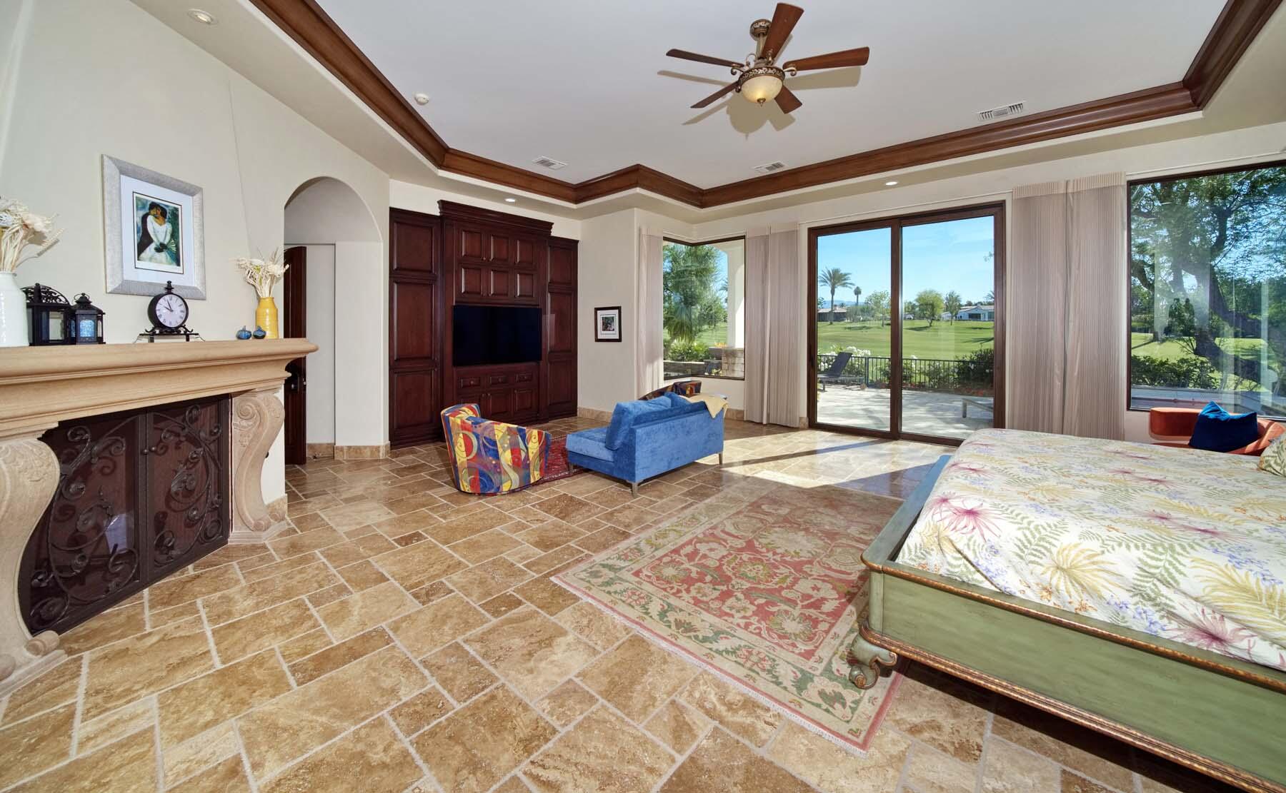 Situated on the 18th hole of Toscana's coveted South Course, this custom estate offers breathtaking panoramic views of the fairway and surrounding mountains. Designed for seamless indoor-outdoor living, the home features travertine floors, elegant crown molding, and two sets of pocketing glass sliders that open to a stunning backyard retreat. The outdoor space is a true showstopper, complete with a custom pool showcasing water and fire features, a built-in barbecue, new landscaping, and decorative wrought iron fencing--perfect for both relaxing and entertaining. A detached two-bedroom guest house with a sitting area and kitchenette provides luxurious accommodations for visitors. The versatile floor plan includes a bonus room that can serve as a fifth bedroom or a media room, offering flexible living space to suit your needs. Recent enhancements include four new high-efficiency HVAC systems with NEST thermostats--three serving the main residence and one for the guest house--plus ductless mini-split systems in both garages. A new refrigeration system with advanced controls supports the temperature-controlled wine cellar. The home is fully outfitted with recessed LED smart lighting, Lutron switches and outlets, and a 14-zone audio system with 16 speaker pairs, all managed through four wall-mounted iPads offering integrated SMART control of lighting, pool features, cameras, thermostats, and audio. Additional features include full interior and exterior paint, dual COVE dishwashers, LG washer and dryer, and owned solar for maximum energy efficiency.Interested in this Listing?