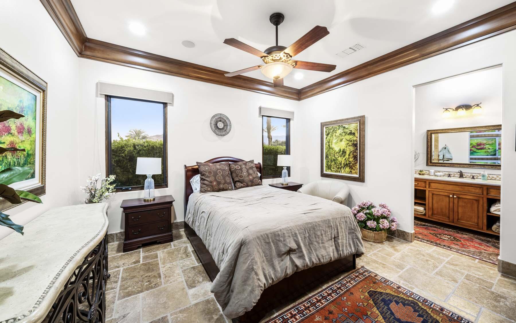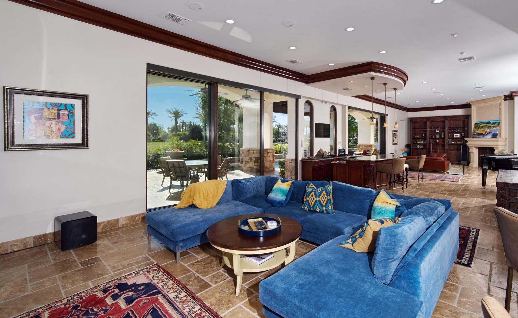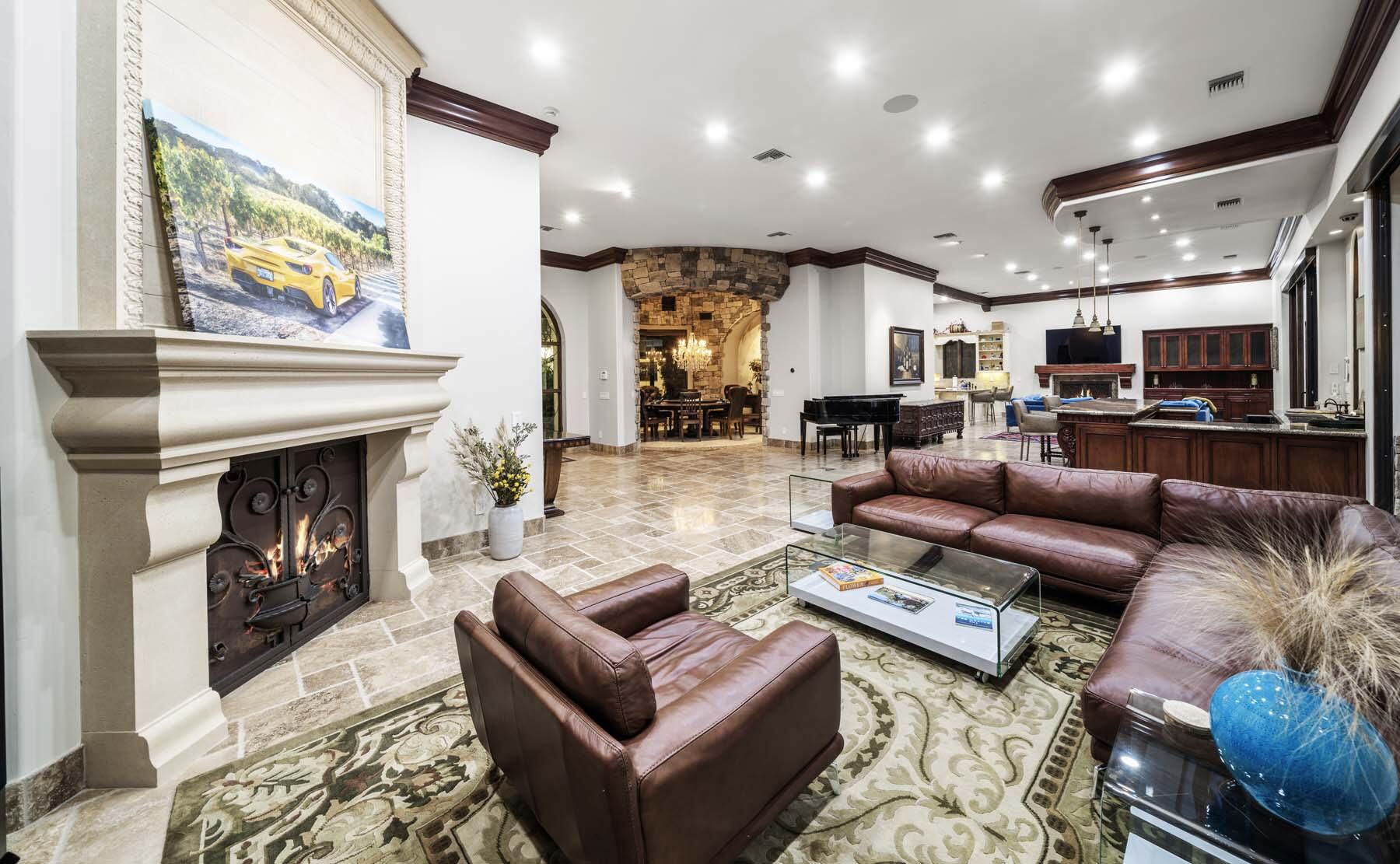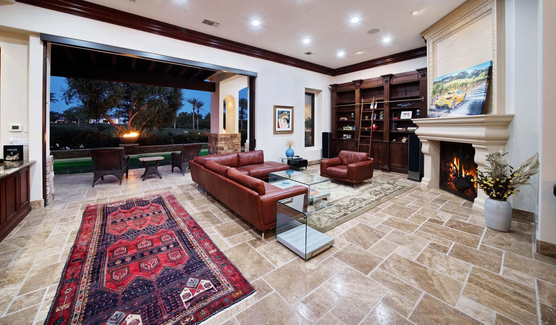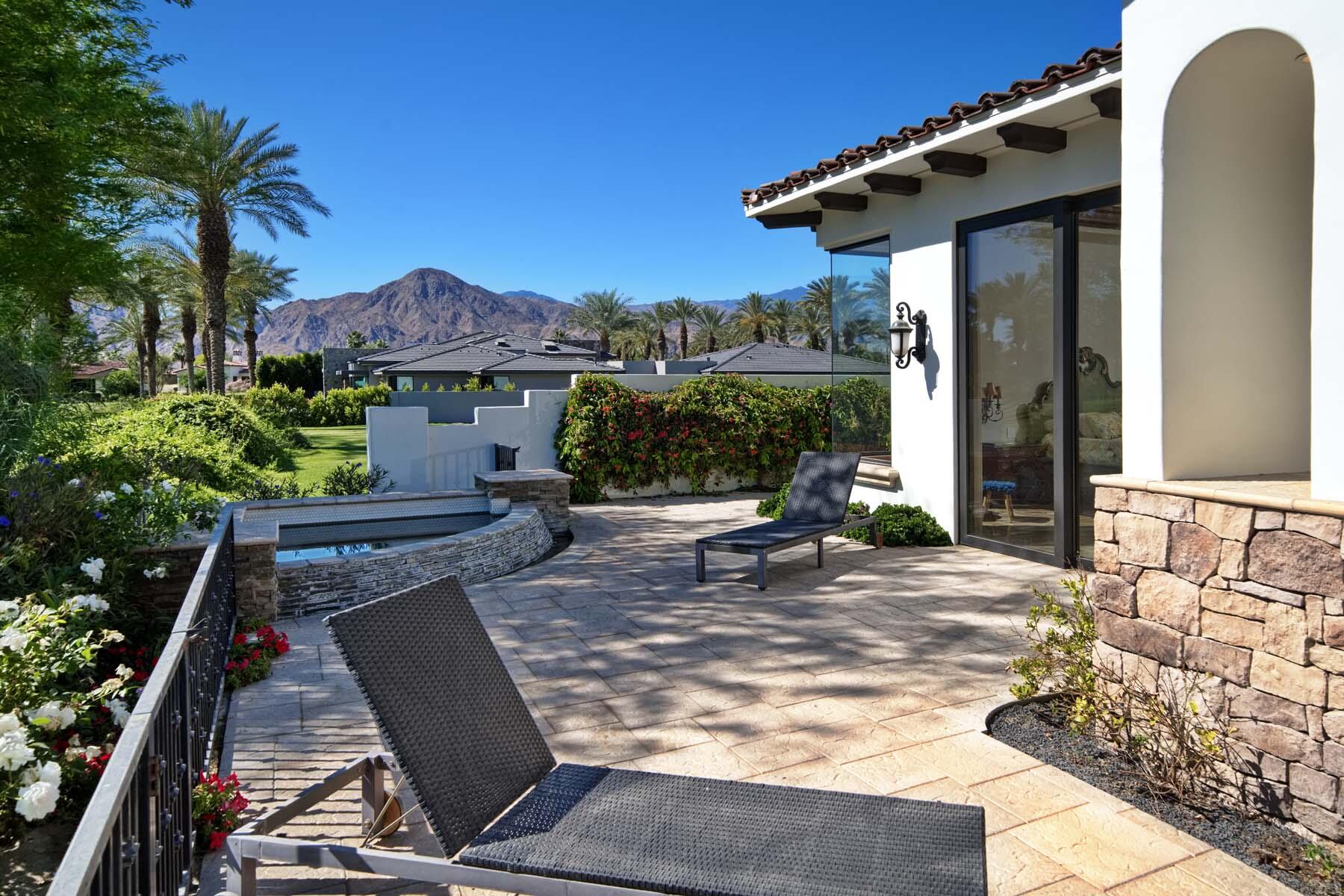 Situated on the 18th hole of Toscana's coveted South Course, this custom estate offers breathtaking panoramic views of the fairway and surrounding mountains. Designed for seamless indoor-outdoor living, the home features travertine floors, elegant crown molding, and two sets of pocketing glass sliders that open to a stunning backyard retreat. The outdoor space is a true showstopper, complete with a custom pool showcasing water and fire features, a built-in barbecue, new landscaping, and decorative wrought iron fencing--perfect for both relaxing and entertaining. A detached two-bedroom guest house with a sitting area and kitchenette provides luxurious accommodations for visitors. The versatile floor plan includes a bonus room that can serve as a fifth bedroom or a media room, offering flexible living space to suit your needs. Recent enhancements include four new high-efficiency HVAC systems with NEST thermostats--three serving the main residence and one for the guest house--plus ductless mini-split systems in both garages. A new refrigeration system with advanced controls supports the temperature-controlled wine cellar. The home is fully outfitted with recessed LED smart lighting, Lutron switches and outlets, and a 14-zone audio system with 16 speaker pairs, all managed through four wall-mounted iPads offering integrated SMART control of lighting, pool features, cameras, thermostats, and audio. Additional features include full interior and exterior paint, dual COVE dishwashers, LG washer and dryer, and owned solar for maximum energy efficiency.Interested in this Listing?