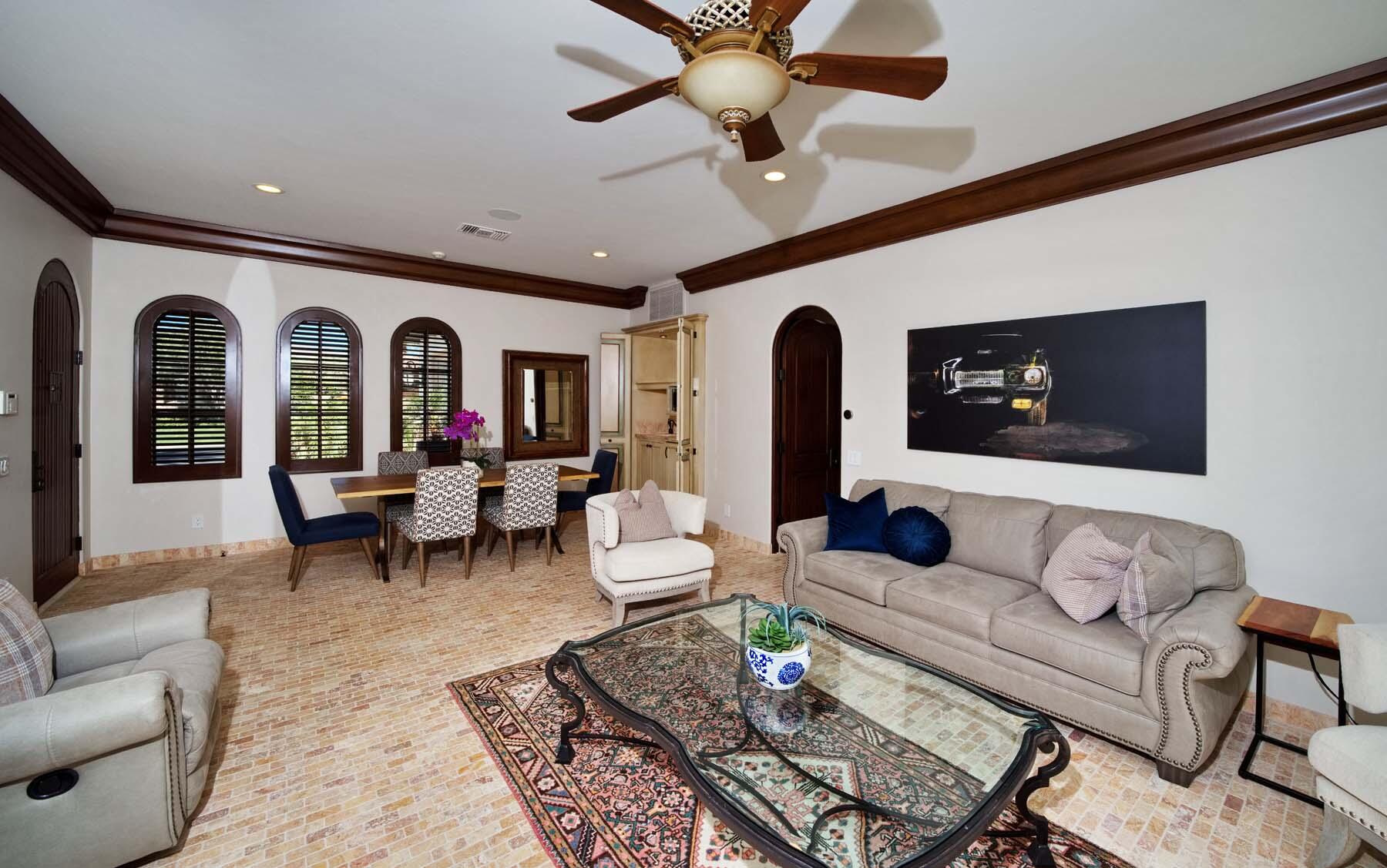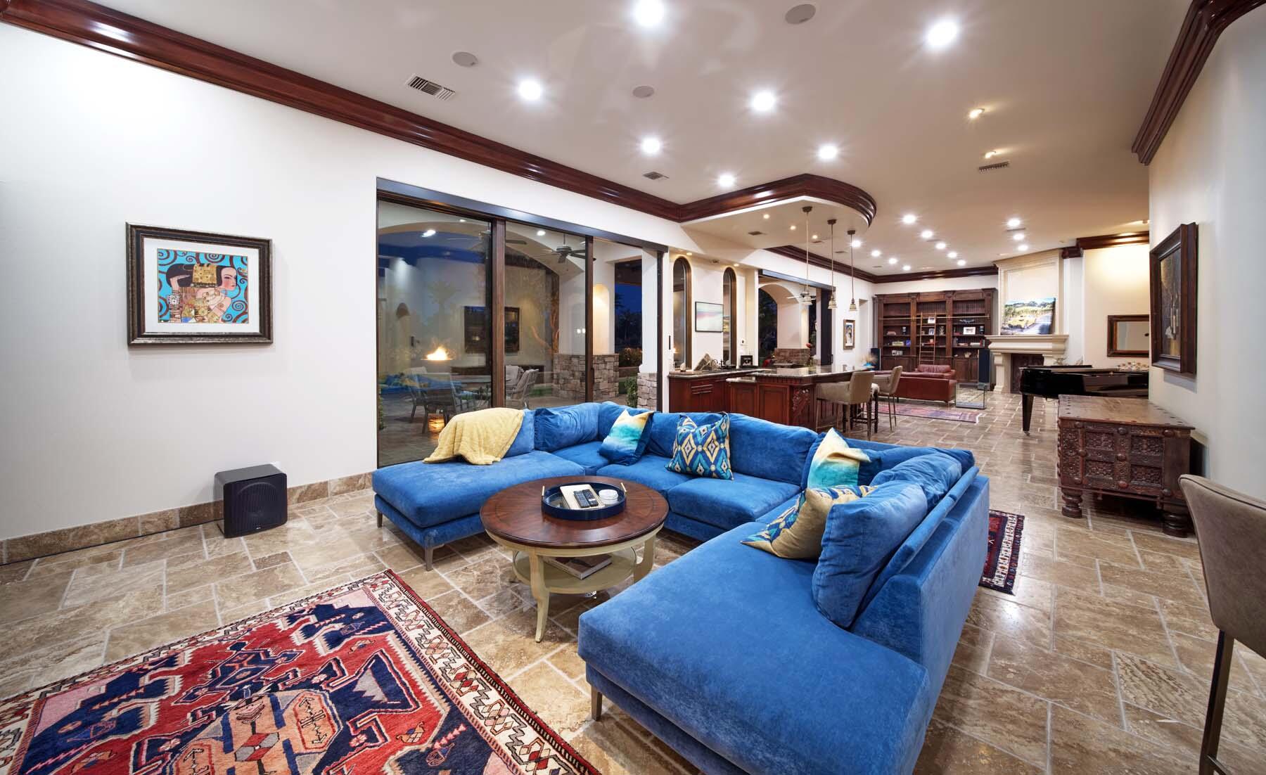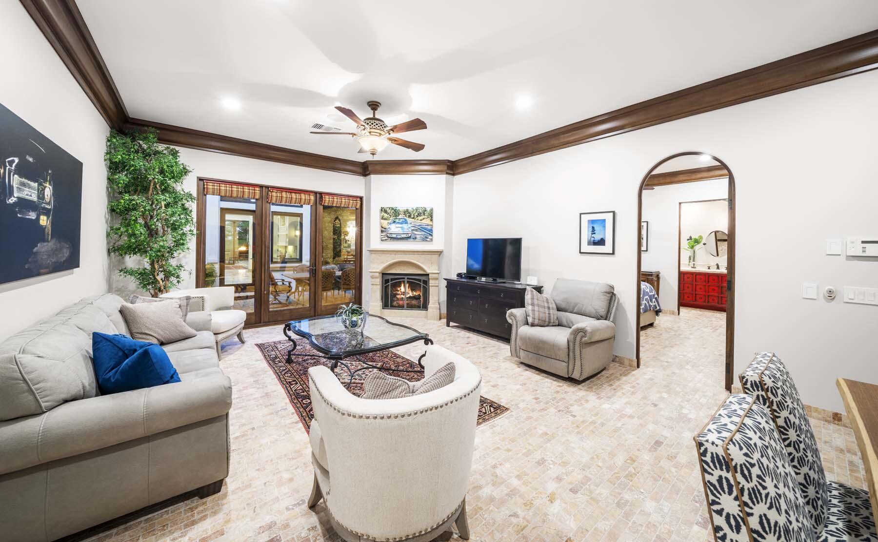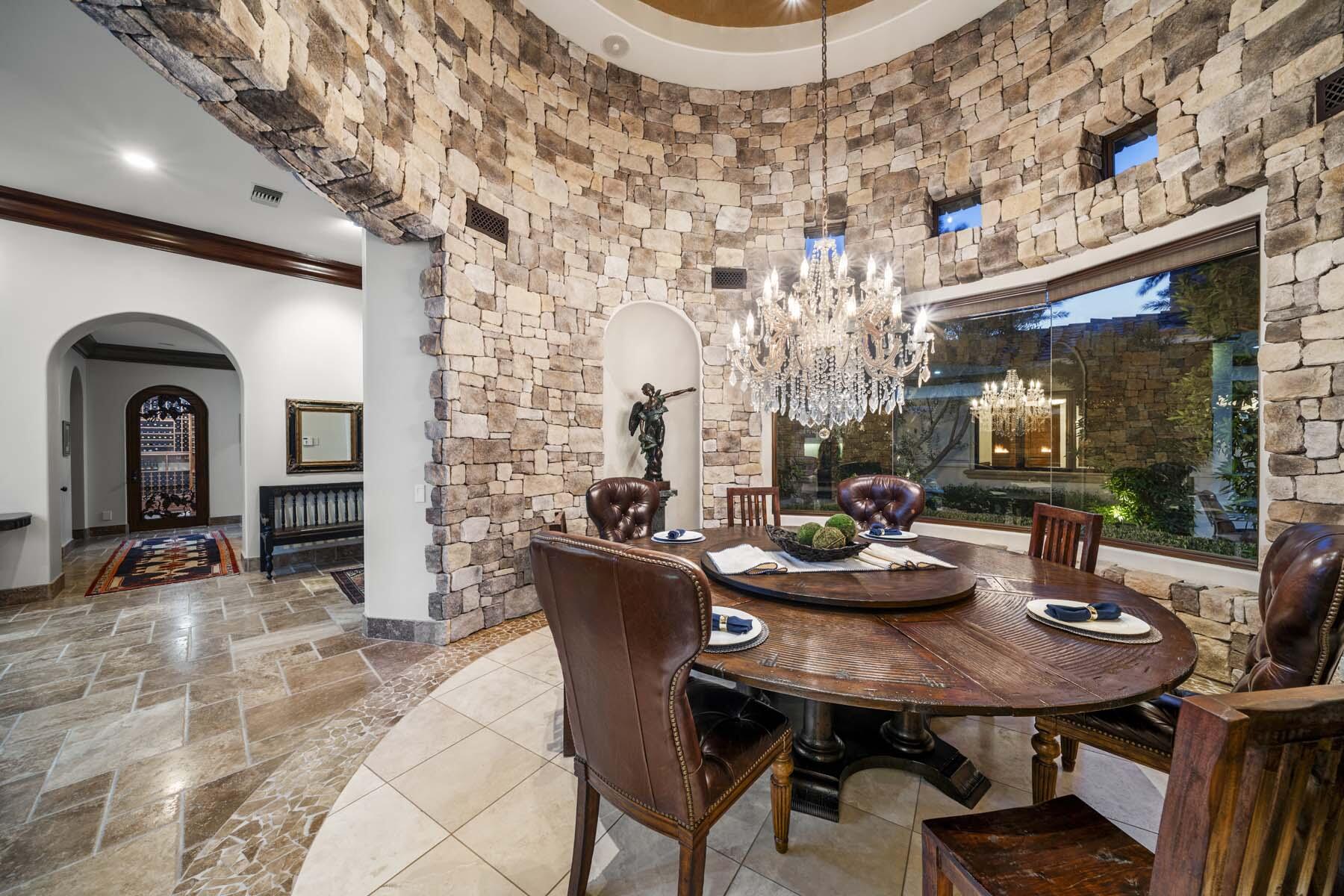 Situated on the 18th hole of Toscana's coveted South Course, this custom estate offers breathtaking panoramic views of the fairway and surrounding mountains. Designed for seamless indoor-outdoor living, the home features travertine floors, elegant crown molding, and two sets of pocketing glass sliders that open to a stunning backyard retreat. The outdoor space is a true showstopper, complete with a custom pool showcasing water and fire features, a built-in barbecue, new landscaping, and decorative wrought iron fencing--perfect for both relaxing and entertaining. A detached two-bedroom guest house with a sitting area and kitchenette provides luxurious accommodations for visitors. The versatile floor plan includes a bonus room that can serve as a fifth bedroom or a media room, offering flexible living space to suit your needs. Recent enhancements include four new high-efficiency HVAC systems with NEST thermostats--three serving the main residence and one for the guest house--plus ductless mini-split systems in both garages. A new refrigeration system with advanced controls supports the temperature-controlled wine cellar. The home is fully outfitted with recessed LED smart lighting, Lutron switches and outlets, and a 14-zone audio system with 16 speaker pairs, all managed through four wall-mounted iPads offering integrated SMART control of lighting, pool features, cameras, thermostats, and audio. Additional features include full interior and exterior paint, dual COVE dishwashers, LG washer and dryer, and owned solar for maximum energy efficiency.Interested in this Listing?