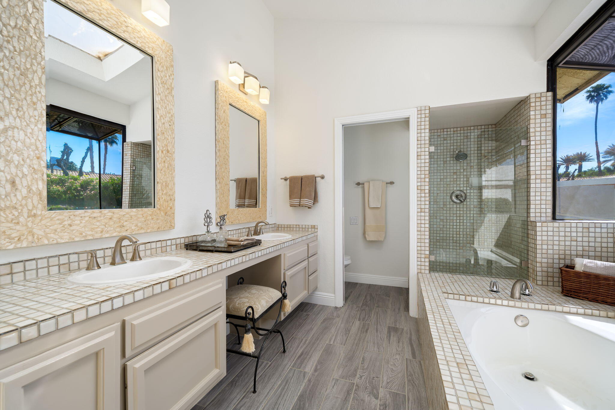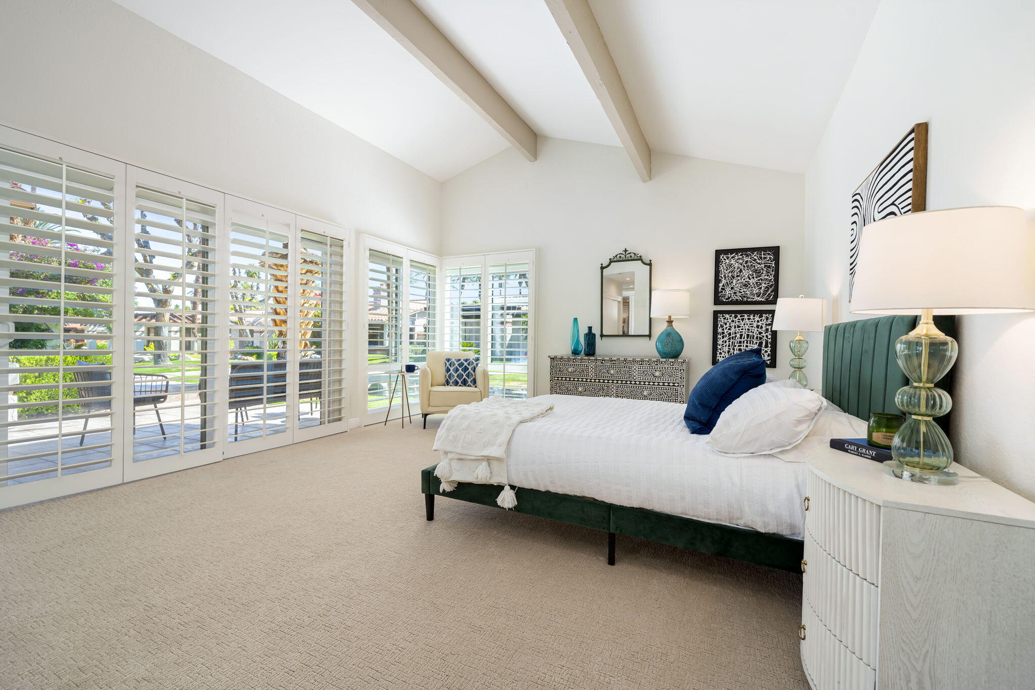 Opportunity awaits! Back on the market for immediate move in. Come explore the tranquility that is lovely Los Lagos. This is your chance to own a truly exceptional home, a rare and spacious floor plan! Featuring two luxurious primary suites and a third bedroom, this residence offers unparalleled comfort and style. Interior highlights include vaulted ceilings, new energy saving windows throughout, beautiful shutters, updated kitchen, dining area with a bar and a breakfast nook. Situated on a peaceful cul-de-sac, the abundance of windows floods the home with natural light, creating an inviting atmosphere. The expansive side yard, one of the largest in the community, is a private retreat, complete with a large awning for shaded lounging. Enjoy resort-style amenities including four pools, spas, tennis courts, and picturesque waterways, all within a secure, gated community. This is your chance to live the Indian Wells dream!Interested in this Listing?
