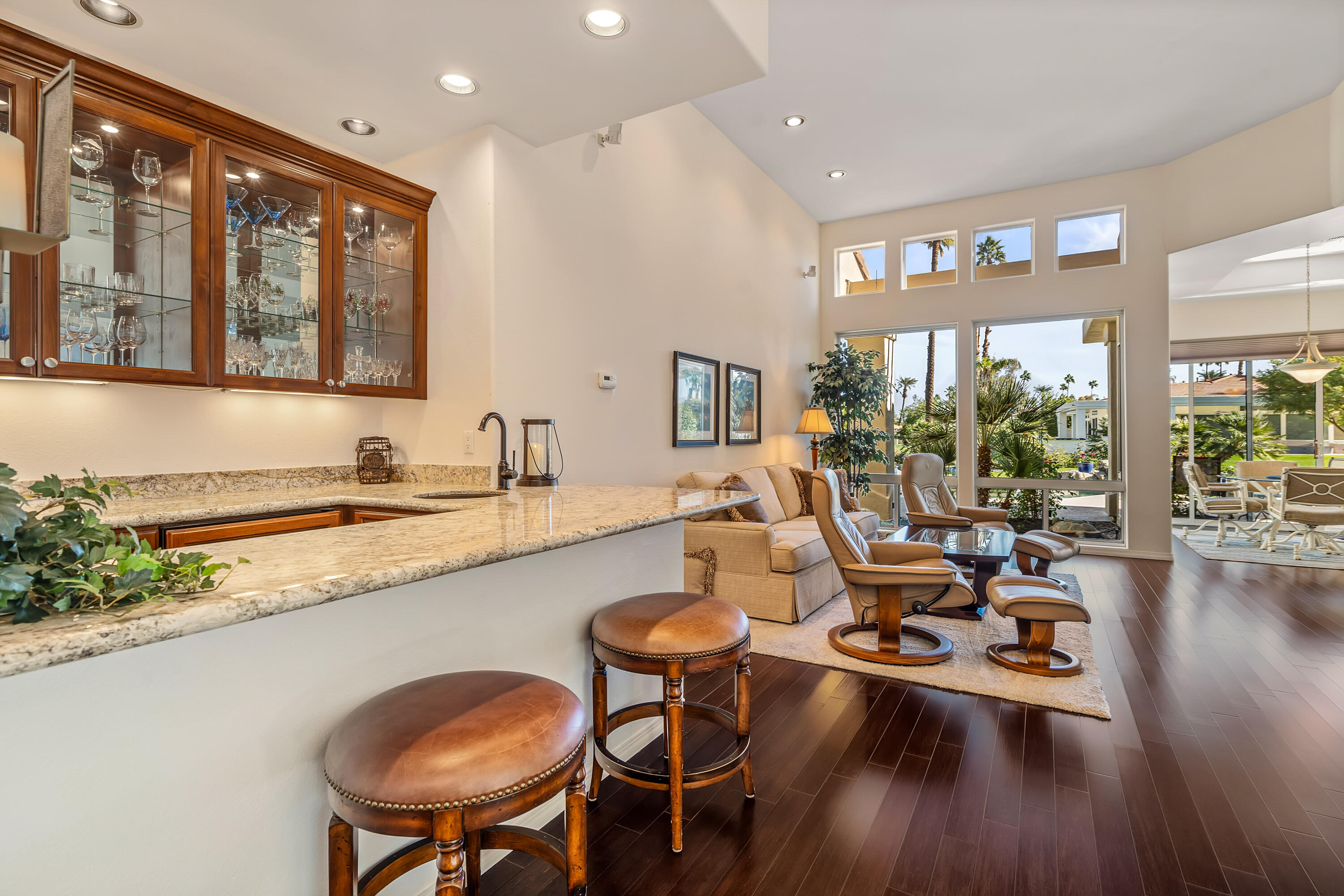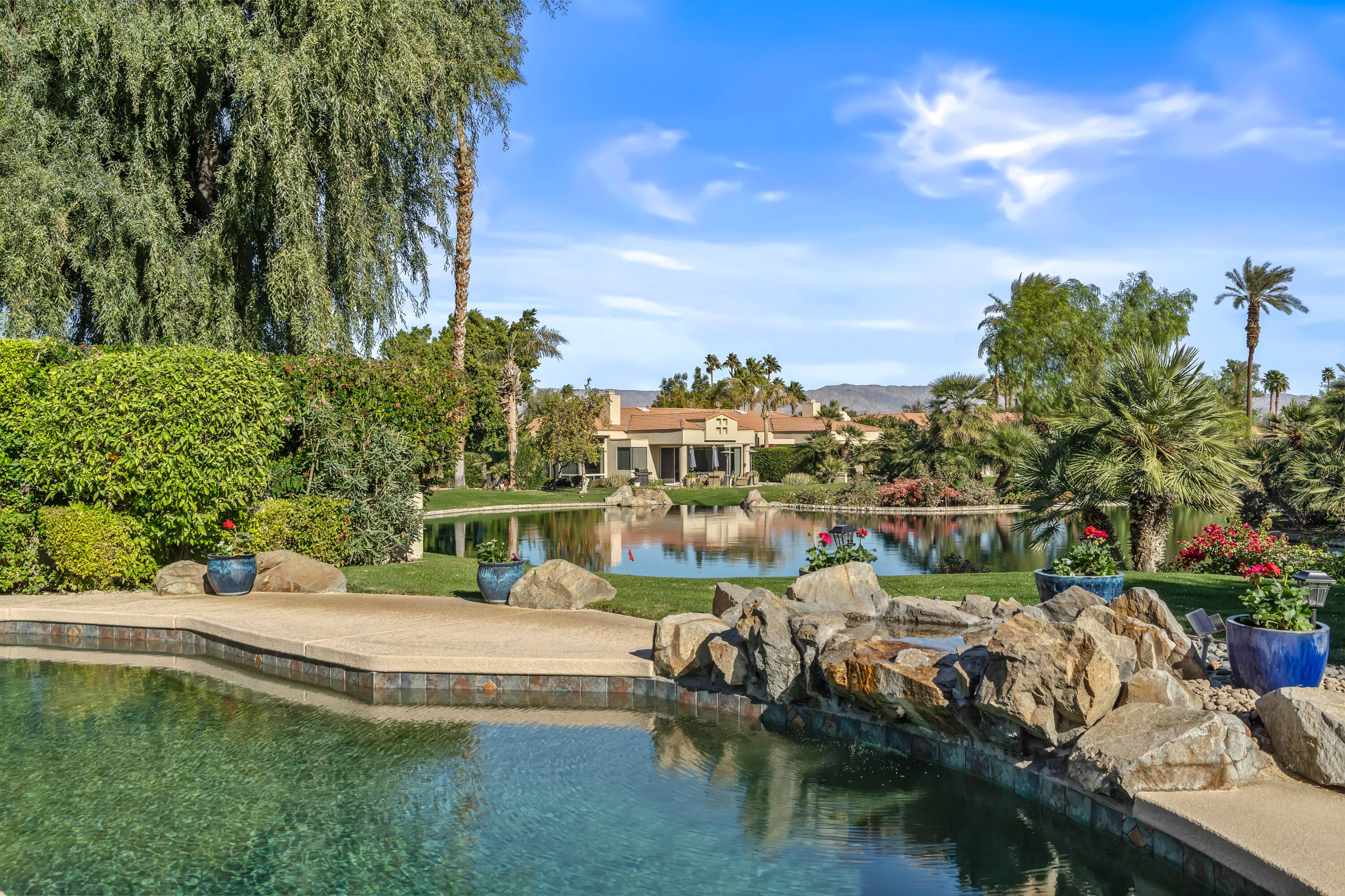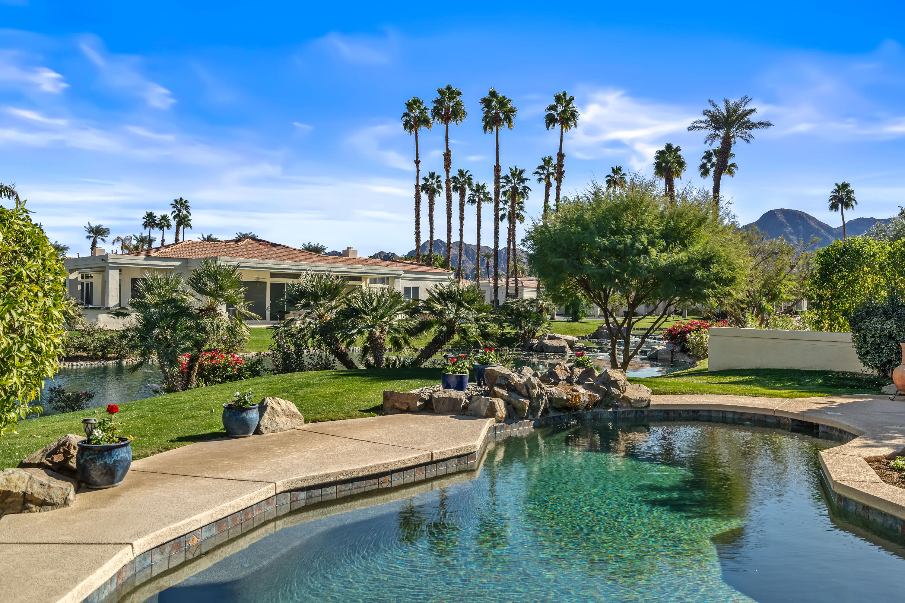 Tranquil and private setting overlooking the PebbleTec pool/spa, lagoon, waterfall as well as beautiful mountain views. Popular Spyglass floor plan offers 3 en-suites and and a powder room. Beautifully updated featuring hardwood flooring, white custom cabinetry and granite slab counter tops. This sought-after floor plan includes a formal living and dining room, separate family room, see through fireplace and eat-in kitchen. The high ceilings and abundance of windows a light & bright airy living space. Located in the heart of Indian Wells this home is desert living at it's best.Interested in this Listing?