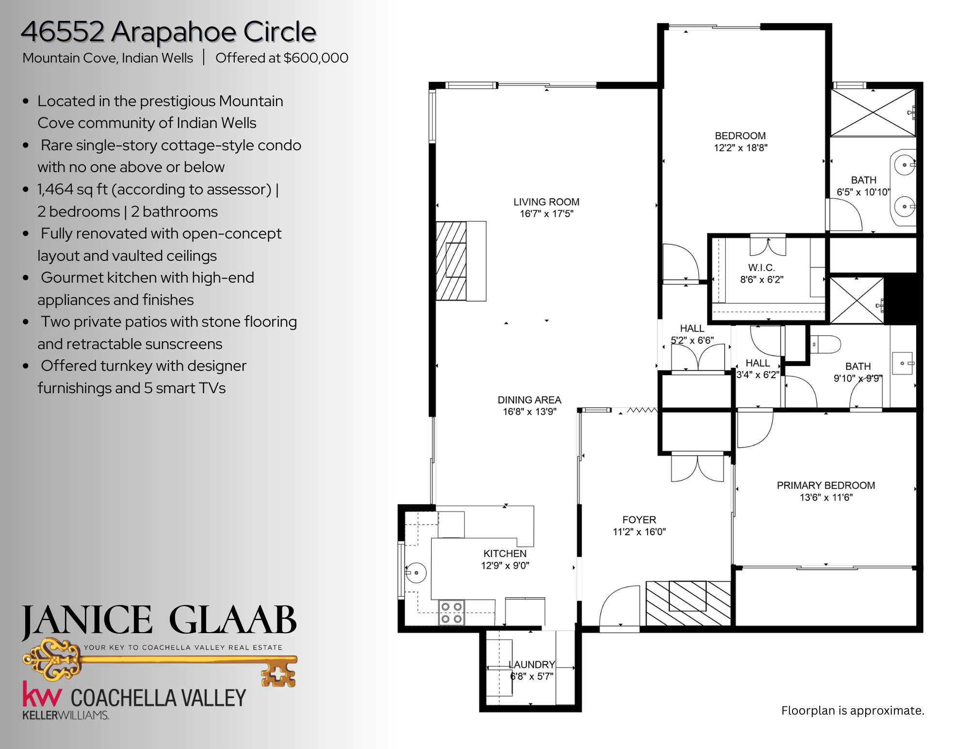 Welcome to the sought after Indian Wells community of Mountain cove. Discover the pinnacle of luxury living in this exceptional residence, designed with custom features and impeccable craftsmanship. Nestled within the prestigious community, this home is set against a breathtaking mountain backdrop, offering both privacy and serenity.This ''cottage style'' condo with no one above or below is one of just a few single-story condos in the community that almost never come on the market, so don't miss your chance! Completely reimagined inside and out, the open-concept design boasts high-end upgrades and remodeling, soaring vaulted ceilings and a stunning 24-inch custom stone fireplace that extends to the ceiling. High end appliances and upgrades provide you with a gourmet kitchen for all your entertainment. The open floor plan living room looks out onto one of two patios with the Indian Wells mountains in the background. Two beautiful bathrooms. The laundry room/pantry is a separate room just off the kitchen, making living and entertaining easy and convenient.Two private outdoor patios with elegant stone flooring and retractable sunscreens create the perfect setting for entertaining or unwinding while taking in the spectacular views.Offered fully turnkey, this one-of-a-kind home includes high-end furnishings and five smart LED TVs, ensuring a seamless move-in experience. As a resident of Indian Wells, you'll enjoy 20% discounts at select restaurants, spas, and hotels, plus the opportunity to play golf at the renowned Indian Wells Country Club at a deep discount. Very close to shopping, dining and entertainment in both Palm Desert and La Quinta.This is your chance to own a truly extraordinary desert retreat!Interested in this Listing?