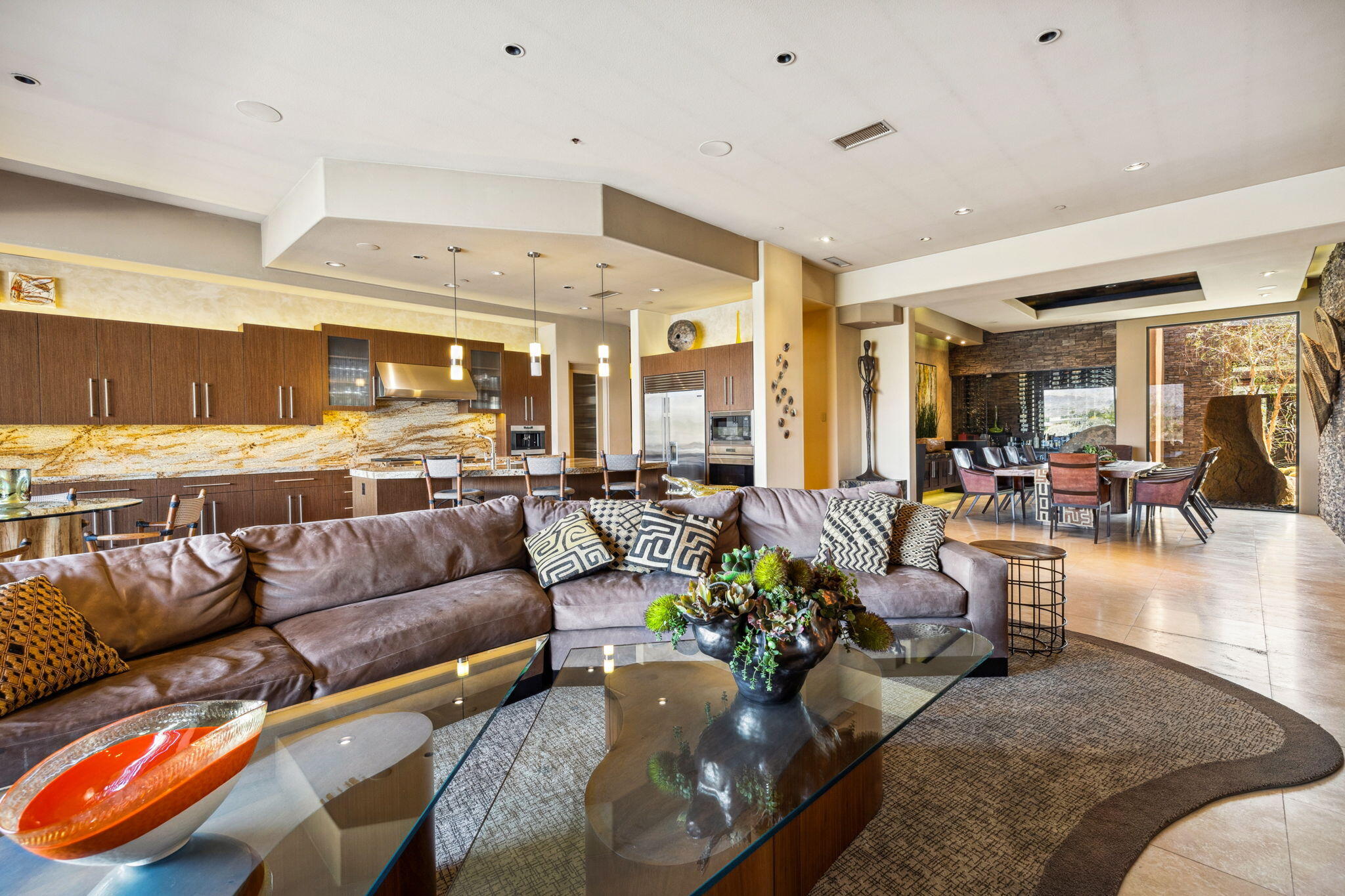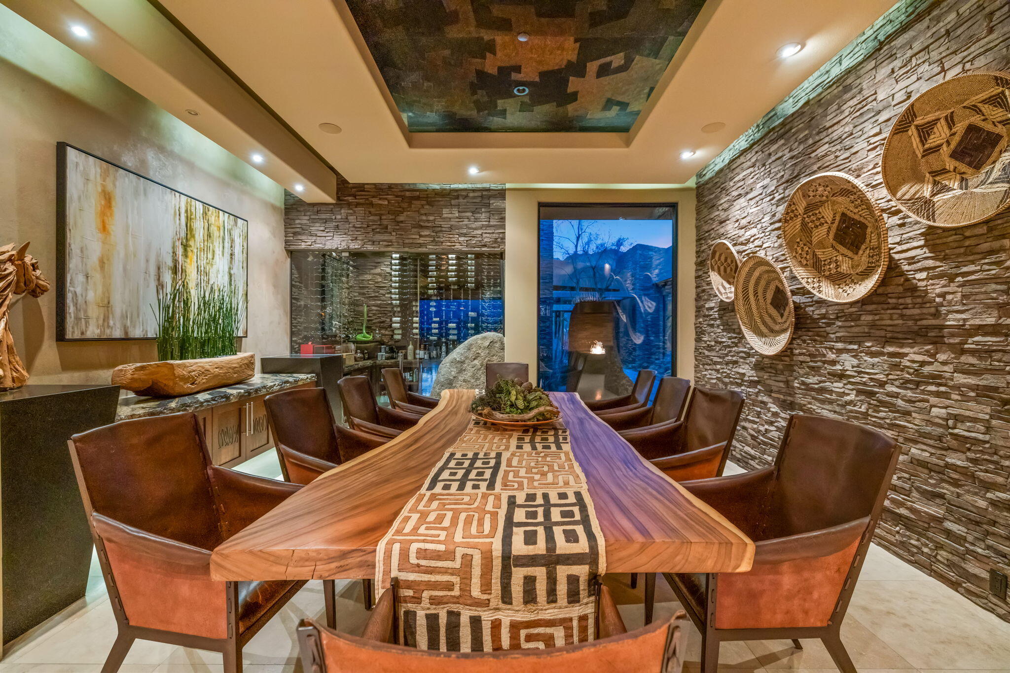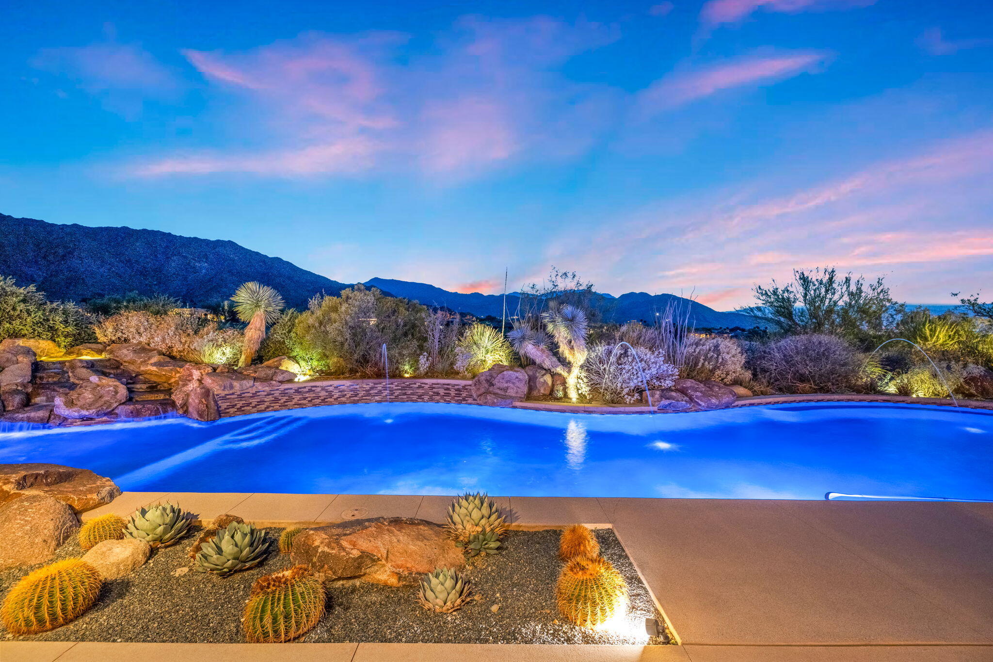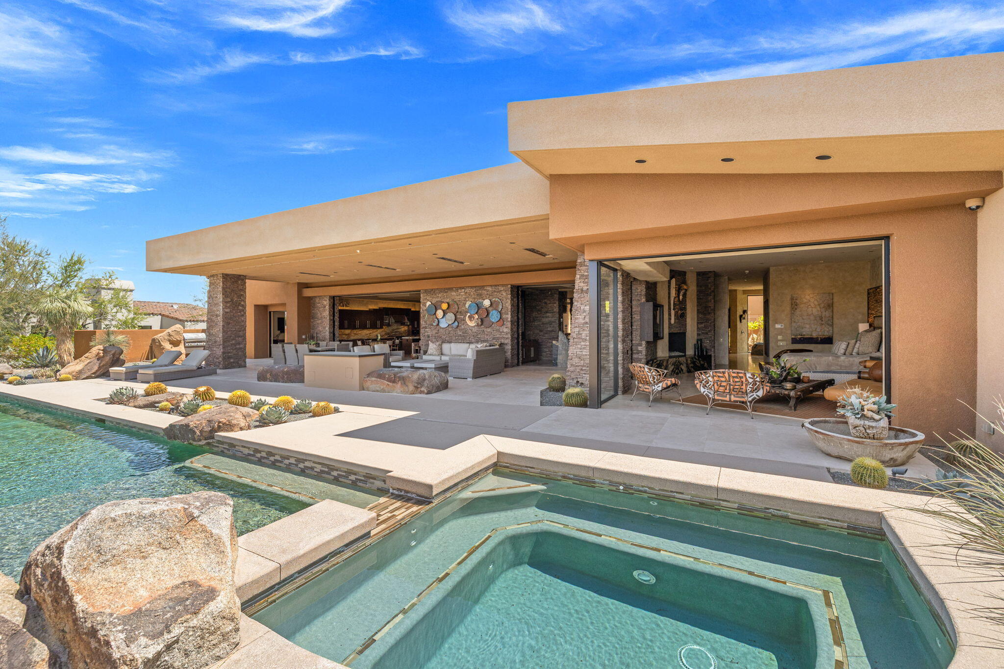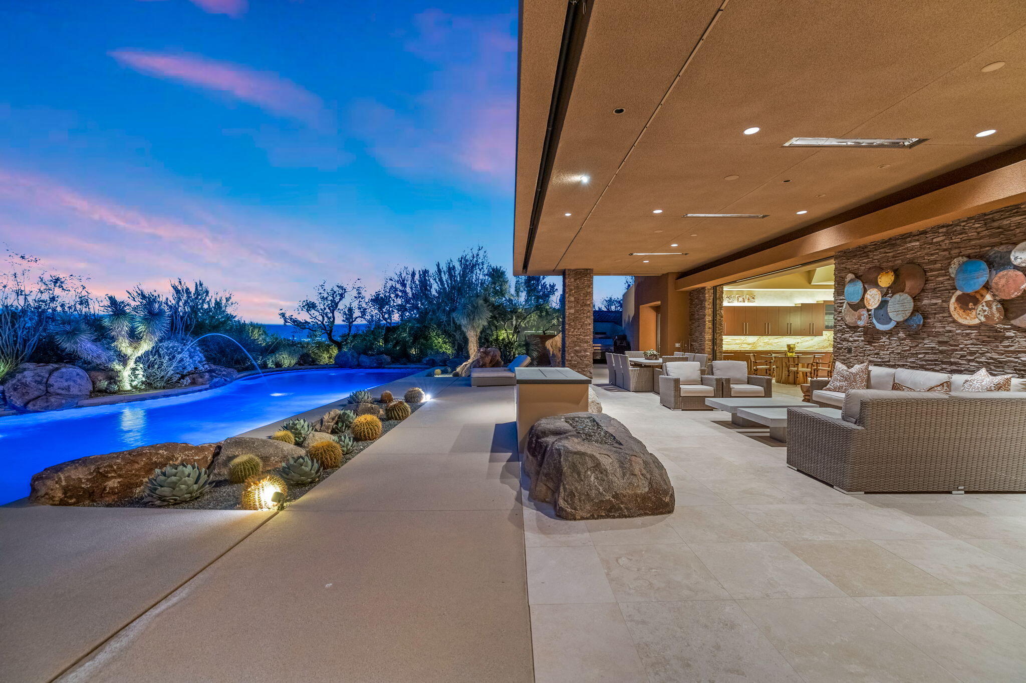 Welcome to a stunning architectural masterpiece by acclaimed luxury builder Foxx Constuction Company, with visionary design by Angela Wells. Perfectly situated on a 22,651 sq ft lot overlooking the 13th hole of the exclusive Reserve Club in Indian Wells, this custom 6,135 sq ft estate offers the pinnacle of desert luxury.Inside, you'll find five expansive en suite bedrooms and five and a half bathrooms, all set against a backdrop of elegant travertine tile flooring. Celebrated in multiple design publications for its bold architecture and integration of natural elements, this home is both a serene sanctuary and a sculptural work of art.At its core, a dramatic fireplace carved from a single, massive boulder creates a commanding focal point, anchoring the home's organic aesthetic. In the primary bath, an exquisite stone soaking tub--also carved from a natural boulder--offers a spa-like escape steeped in earthy tranquility.Thoughtfully designed for both relaxation and entertainment, the home features a soundproof theater, a temperature-controlled wine room, and a sleek wet bar. Expansive retractable doors blend indoor and outdoor living, opening to a private resort-style backyard.Outside, take in sweeping west-facing mountain views beside a spectacular lap pool with waterfall features, pop-up TV, dual fire pits, and a built-in gas BBQ. A misting system and built-in patio heaters ensure year-round comfort, while a secluded outdoor shower just off the primary suite provides the ultimate retreat.Residents of The Reserve Club enjoy an unmatched lifestyle with access to a world-class, 18-hole championship golf course designed by Tom Weiskopf & Jay Morrish, an award-winning clubhouse, a premier fitness and wellness center, tennis and pickleball courts, and a vibrant social scene--all within a private, guard-gated community.This is more than a residence--it's a refined expression of luxury, design, and desert serenity.Interested in this Listing?