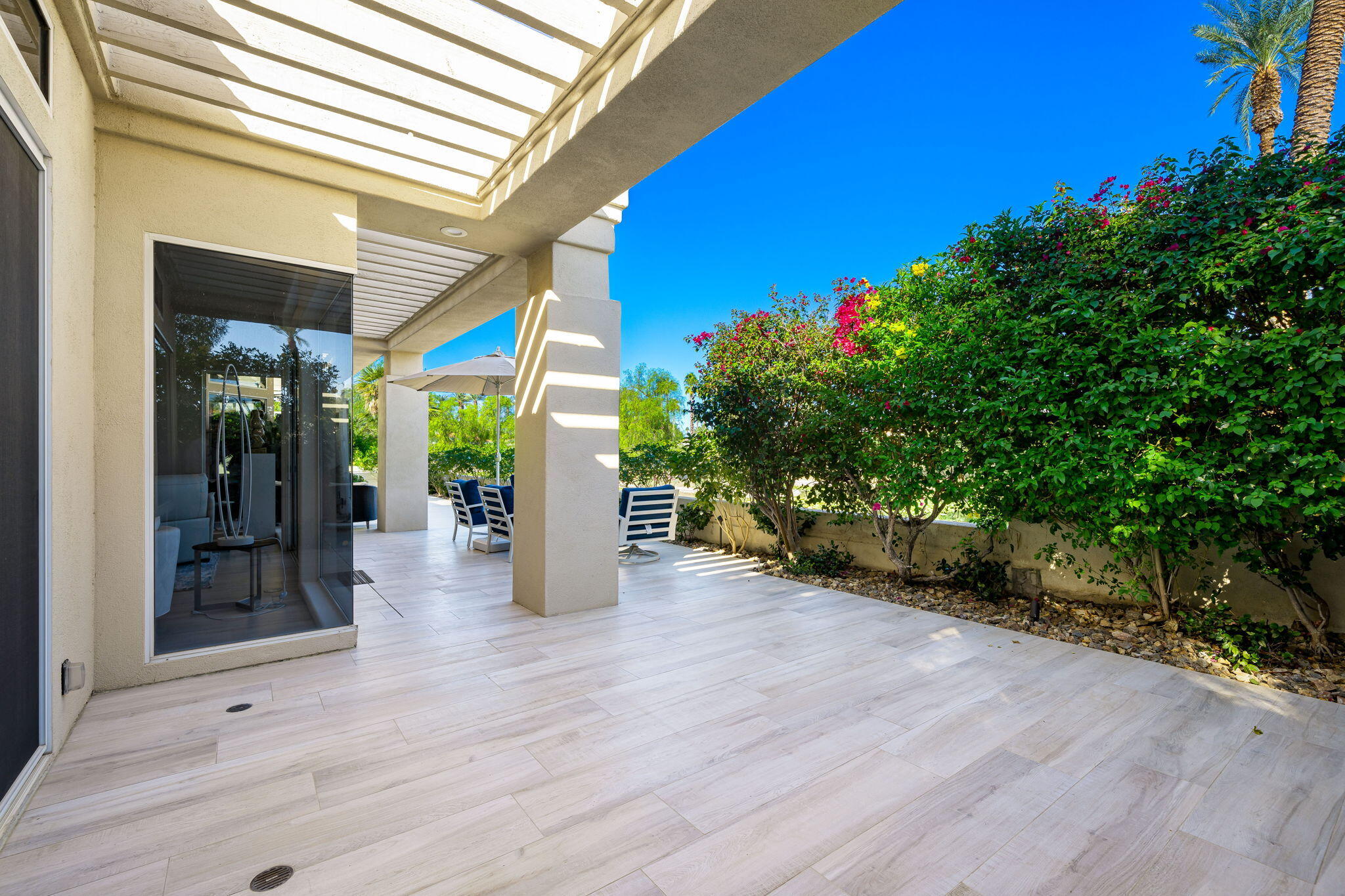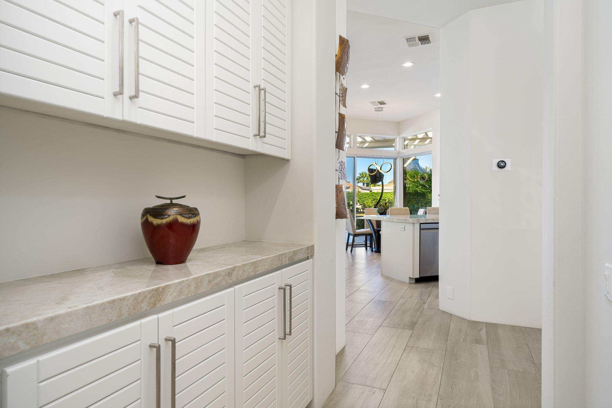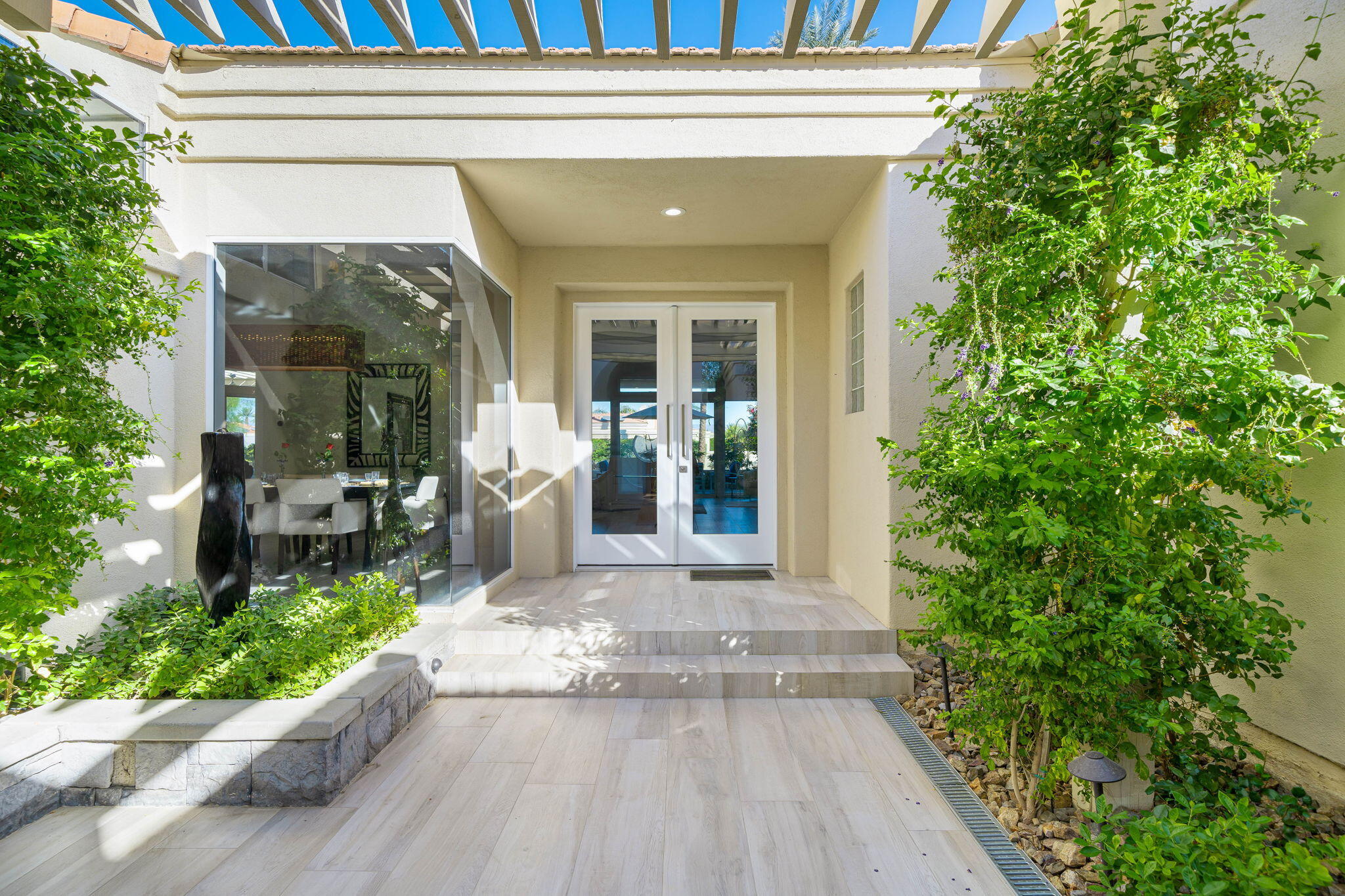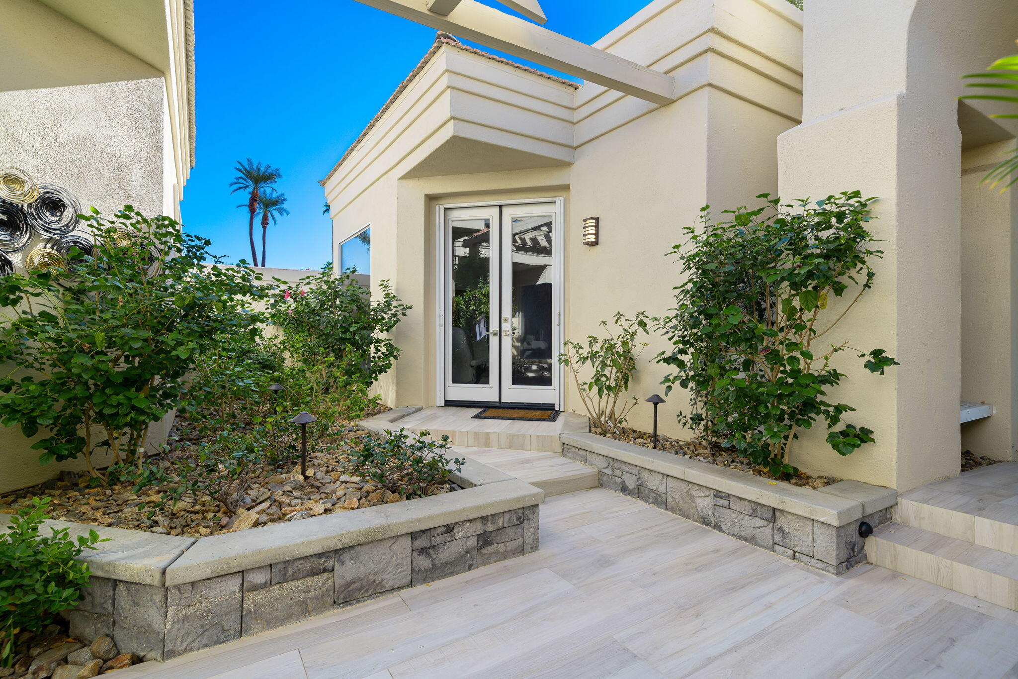 Experience Desert Sophistication in this Stunning, fully Owned Solar Home within prestigious Desert Horizons Country Club. Welcome to this beautifully remodeled 4-Bedroom/5 Bath Home, including a Casita, spans 3,380 sq. ft. on an expansive 11,325 sq. ft. Corner Lot, this Riviera plan offers tranquil Lake Views and exceptional design touches throughout. Enter through new San Soucie Art Glass Doors into a private Courtyard, adorned with lush Landscaping and a flowing Fountain. Recent Upgrades include new Plumbing, Electrical, LED Lighting, Designer Hardware, and more -- ensuring a light, bright, and modern living space. The Gourmet Kitchen features Taj Mahal Quartzite Countertops, a stylish Backsplash, and an enlarged Center Island that seamlessly connects to the Breakfast Nook and Family Room. The Living Room boasts a built-in Bar with Wine Cooler & Ice Maker and a Formal Dining area, complemented by continuous 12 x 48 porcelain Tile flooring; perfect for entertaining while taking in the views. The luxurious Primary Suite, complete with its own cozy Fireplace, private patio, dual vanities, soaking tub, floor-to-ceiling tiled shower, and a spacious walk-in closet. Unwind on the back patio overlooking water vistas, featuring a fire pit -- ideal for relaxing or entertaining guests. 2 Car Garage plus Golf Cart Garage complete the home. Enjoy exclusive Community Amenities just steps away; including a Community Pool, Newer Clubhouse, private 18-hole Golf Course, State-of-the-Art Fitness Center, Dining options and Sports Court Pavillon, providing the ultimate desert living experience. Don't miss your chance to make it yours!Interested in this Listing?
