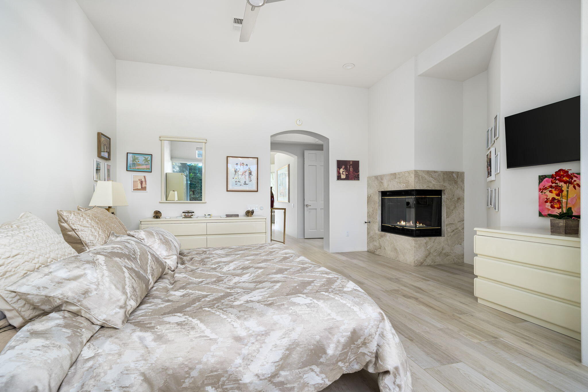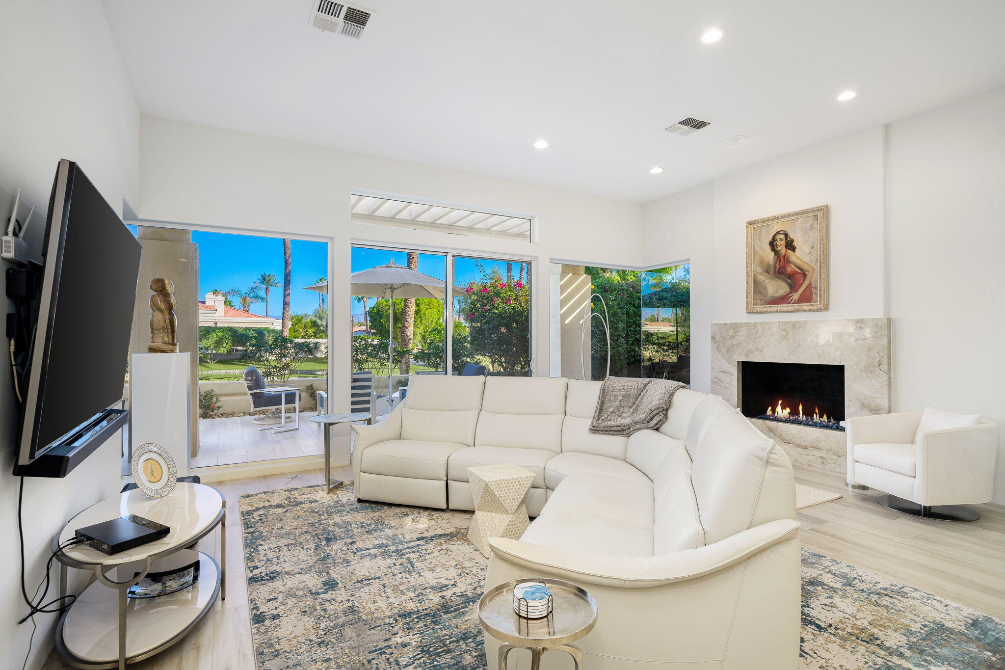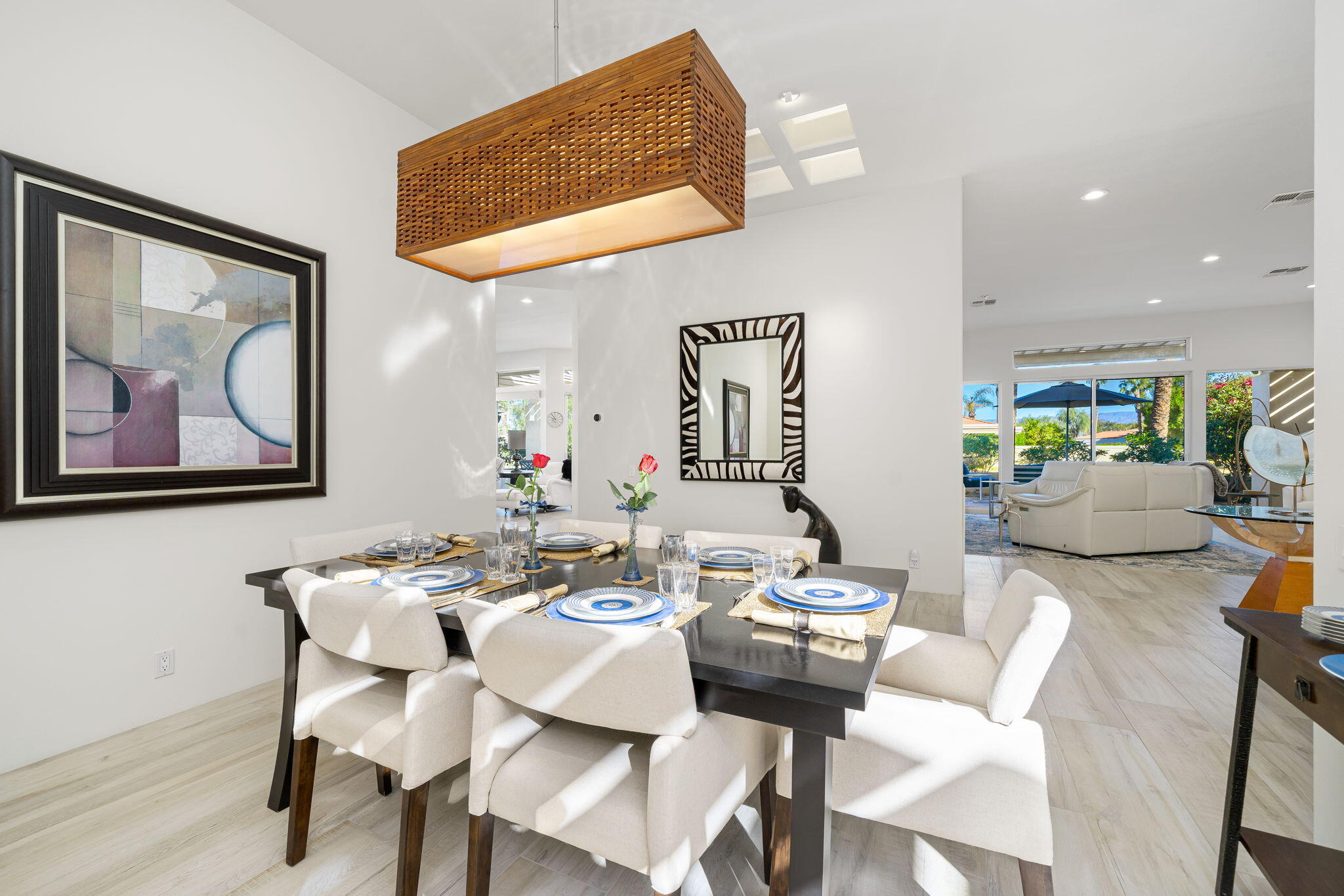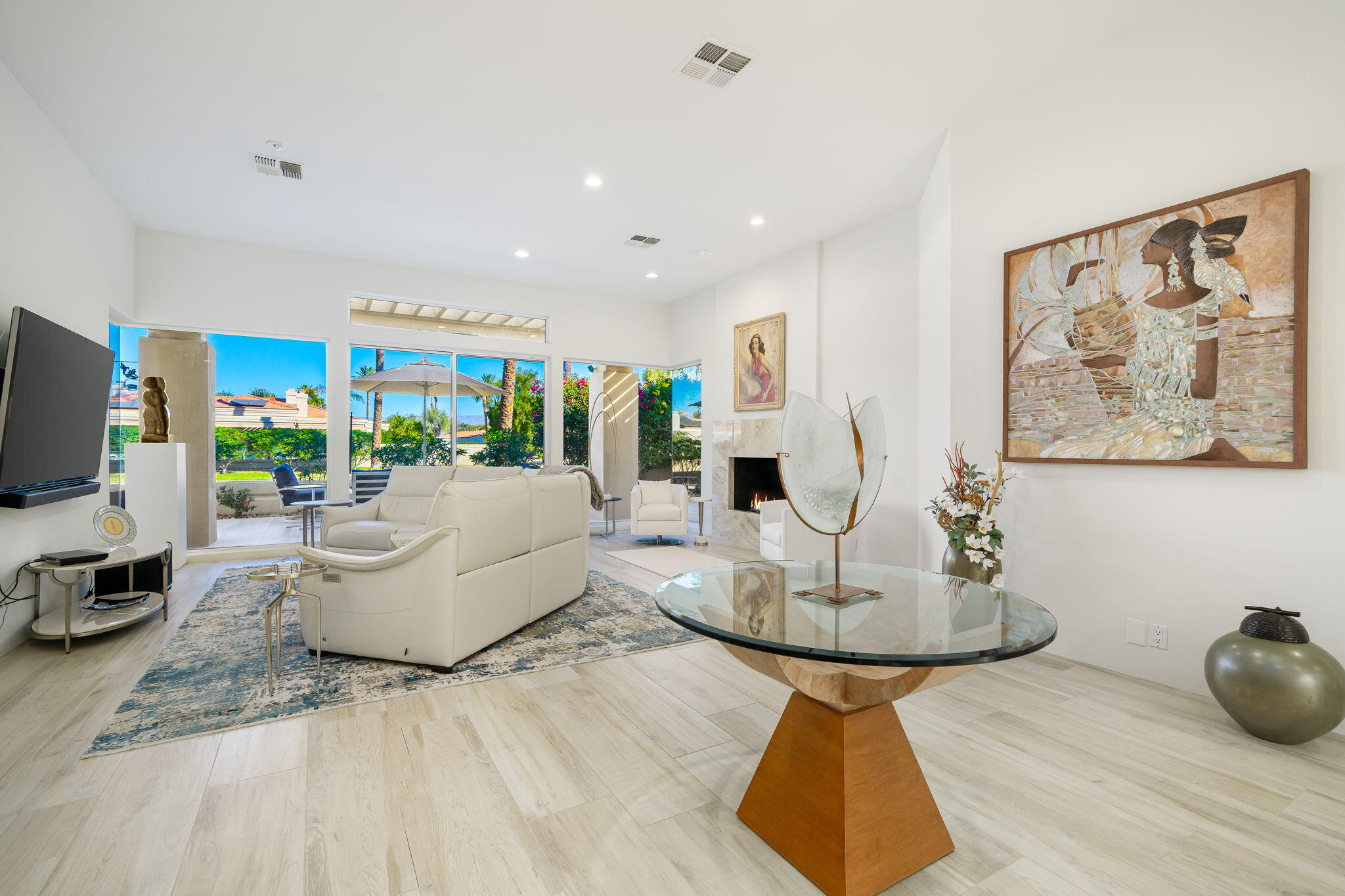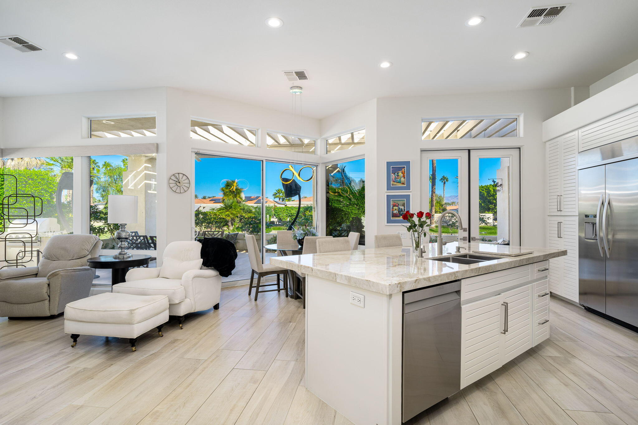 Experience Desert Sophistication in this Stunning, fully Owned Solar Home within prestigious Desert Horizons Country Club. Welcome to this beautifully remodeled 4-Bedroom/5 Bath Home, including a Casita, spans 3,380 sq. ft. on an expansive 11,325 sq. ft. Corner Lot, this Riviera plan offers tranquil Lake Views and exceptional design touches throughout. Enter through new San Soucie Art Glass Doors into a private Courtyard, adorned with lush Landscaping and a flowing Fountain. Recent Upgrades include new Plumbing, Electrical, LED Lighting, Designer Hardware, and more -- ensuring a light, bright, and modern living space. The Gourmet Kitchen features Taj Mahal Quartzite Countertops, a stylish Backsplash, and an enlarged Center Island that seamlessly connects to the Breakfast Nook and Family Room. The Living Room boasts a built-in Bar with Wine Cooler & Ice Maker and a Formal Dining area, complemented by continuous 12 x 48 porcelain Tile flooring; perfect for entertaining while taking in the views. The luxurious Primary Suite, complete with its own cozy Fireplace, private patio, dual vanities, soaking tub, floor-to-ceiling tiled shower, and a spacious walk-in closet. Unwind on the back patio overlooking water vistas, featuring a fire pit -- ideal for relaxing or entertaining guests. 2 Car Garage plus Golf Cart Garage complete the home. Enjoy exclusive Community Amenities just steps away; including a Community Pool, Newer Clubhouse, private 18-hole Golf Course, State-of-the-Art Fitness Center, Dining options and Sports Court Pavillon, providing the ultimate desert living experience. Don't miss your chance to make it yours!Interested in this Listing?