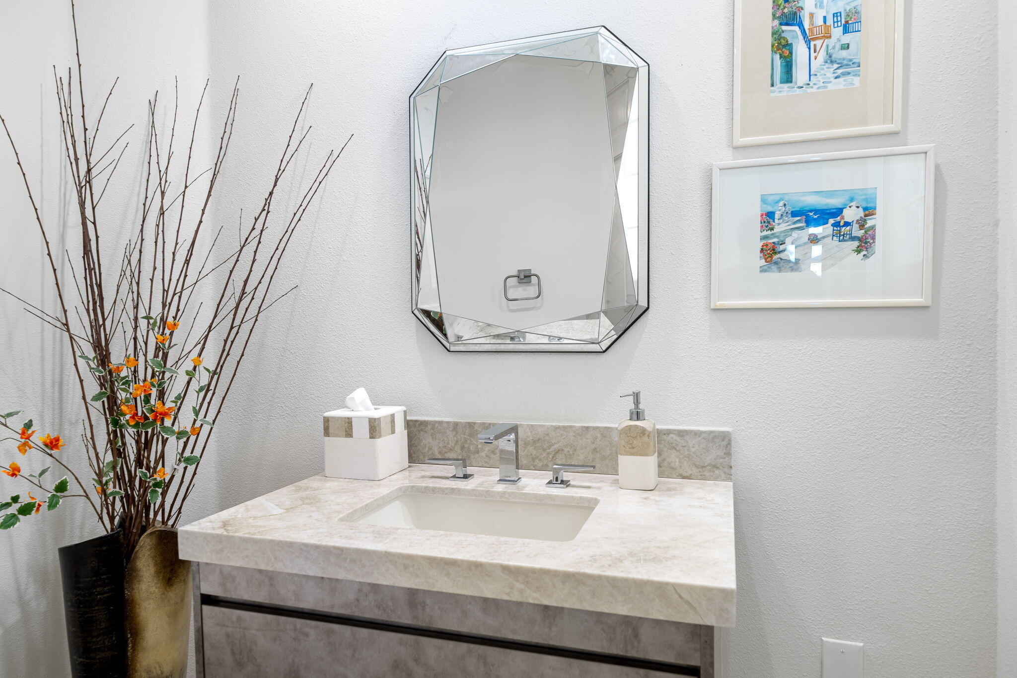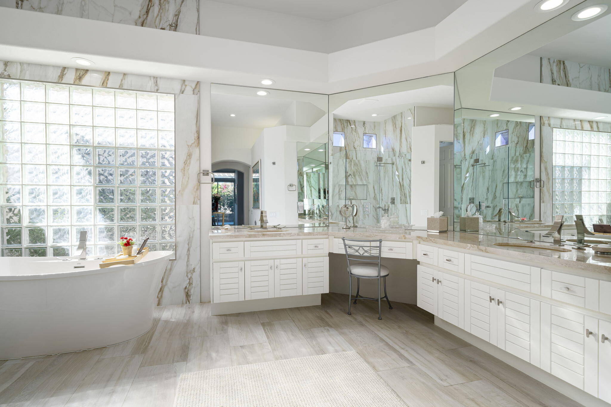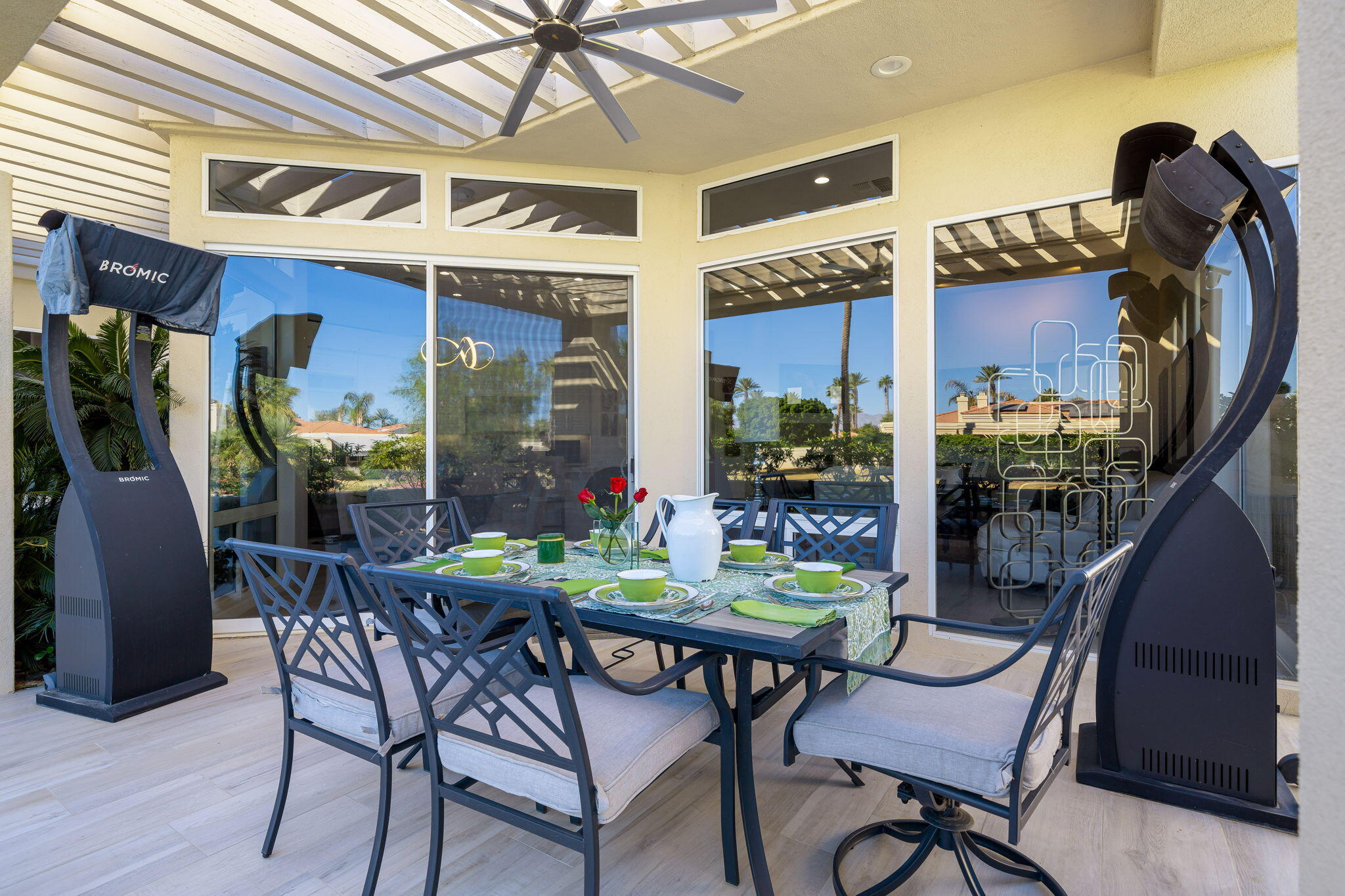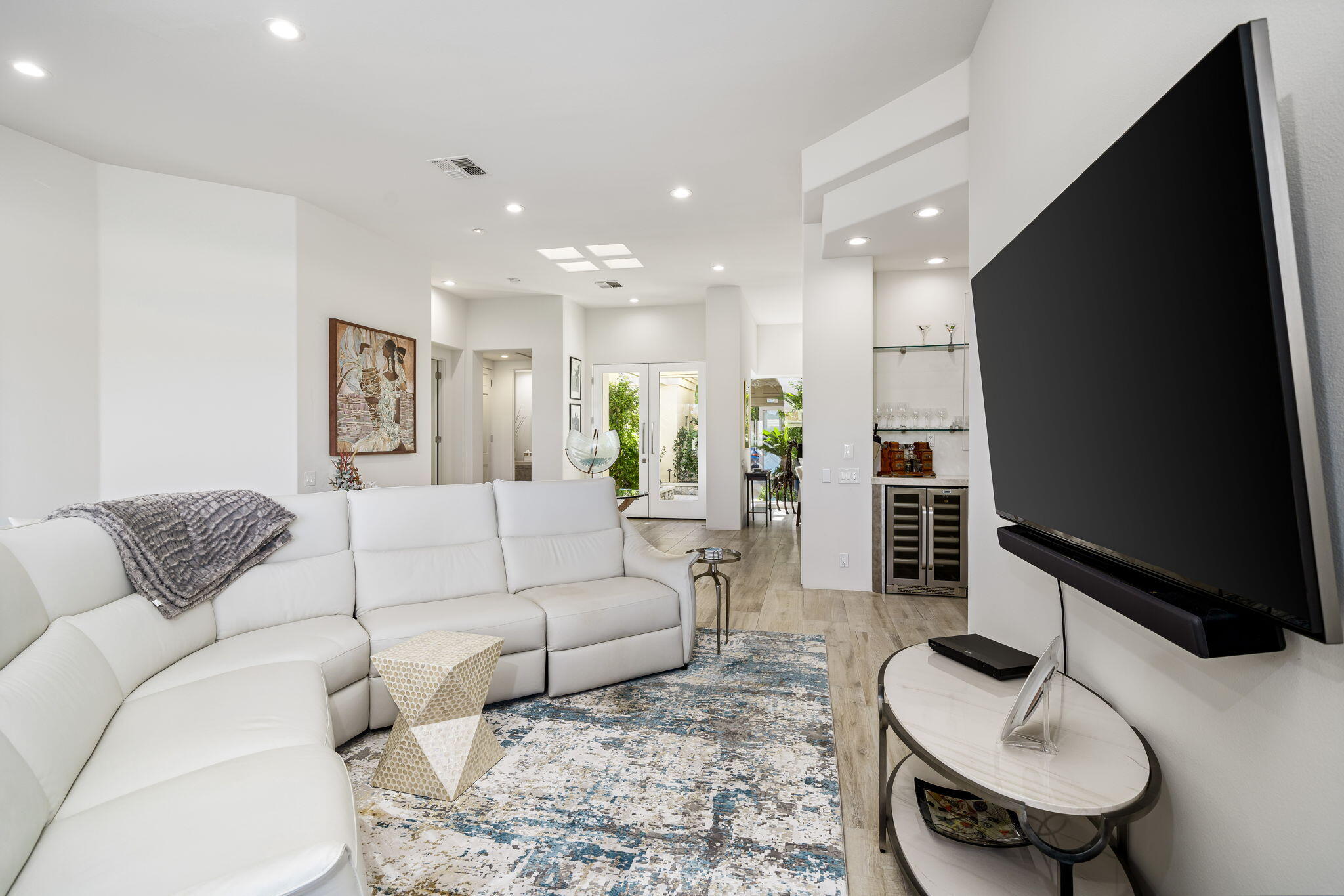 Experience Desert Sophistication in this Stunning, fully Owned Solar Home within prestigious Desert Horizons Country Club. Welcome to this beautifully remodeled 4-Bedroom/5 Bath Home, including a Casita, spans 3,380 sq. ft. on an expansive 11,325 sq. ft. Corner Lot, this Riviera plan offers tranquil Lake Views and exceptional design touches throughout. Enter through new San Soucie Art Glass Doors into a private Courtyard, adorned with lush Landscaping and a flowing Fountain. Recent Upgrades include new Plumbing, Electrical, LED Lighting, Designer Hardware, and more -- ensuring a light, bright, and modern living space. The Gourmet Kitchen features Taj Mahal Quartzite Countertops, a stylish Backsplash, and an enlarged Center Island that seamlessly connects to the Breakfast Nook and Family Room. The Living Room boasts a built-in Bar with Wine Cooler & Ice Maker and a Formal Dining area, complemented by continuous 12 x 48 porcelain Tile flooring; perfect for entertaining while taking in the views. The luxurious Primary Suite, complete with its own cozy Fireplace, private patio, dual vanities, soaking tub, floor-to-ceiling tiled shower, and a spacious walk-in closet. Unwind on the back patio overlooking water vistas, featuring a fire pit -- ideal for relaxing or entertaining guests. 2 Car Garage plus Golf Cart Garage complete the home. Enjoy exclusive Community Amenities just steps away; including a Community Pool, Newer Clubhouse, private 18-hole Golf Course, State-of-the-Art Fitness Center, Dining options and Sports Court Pavillon, providing the ultimate desert living experience. Don't miss your chance to make it yours!Interested in this Listing?