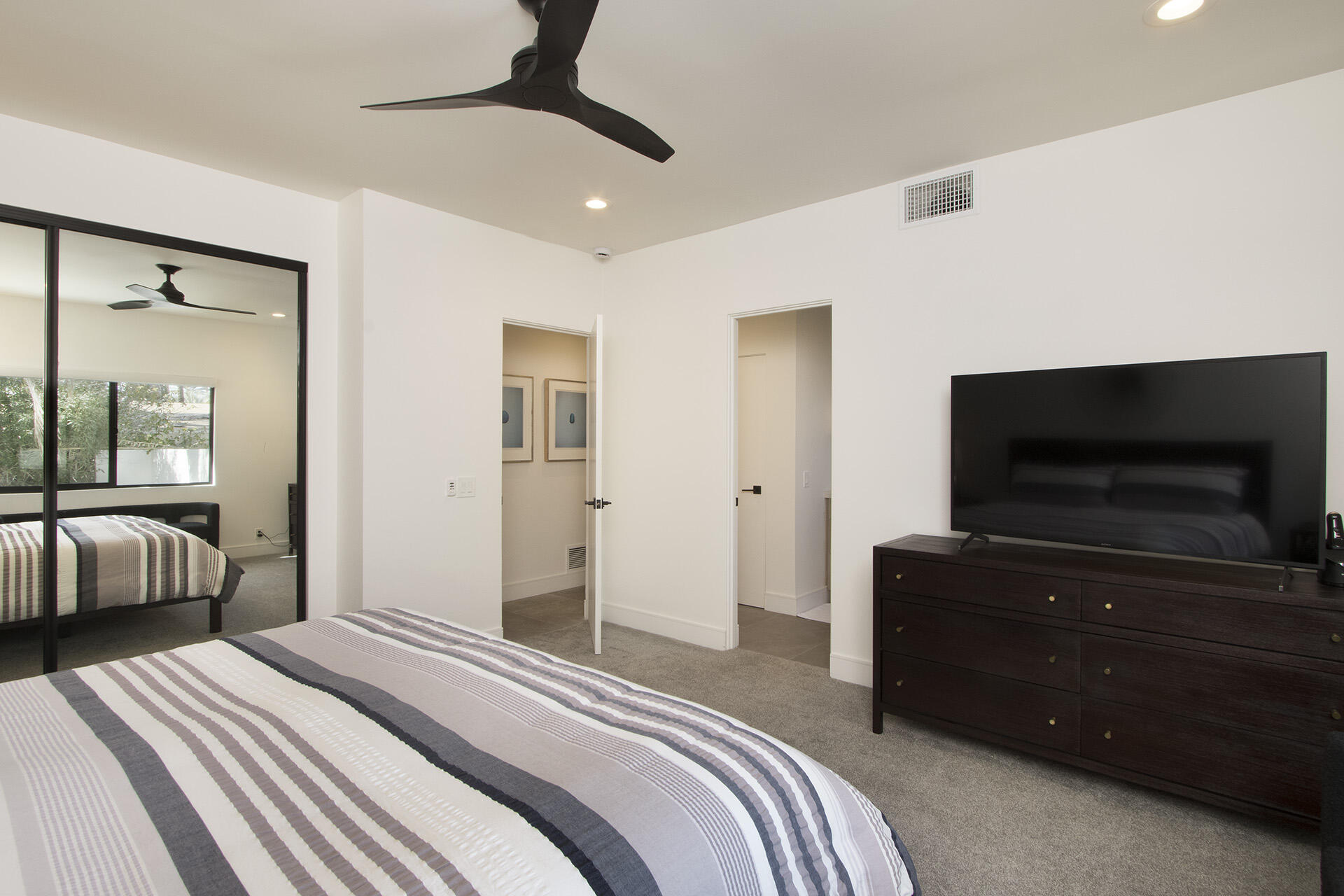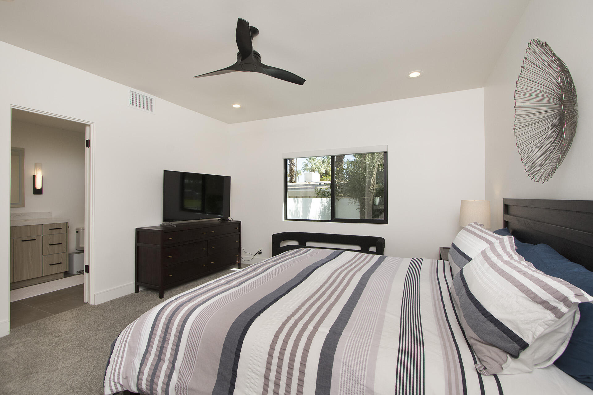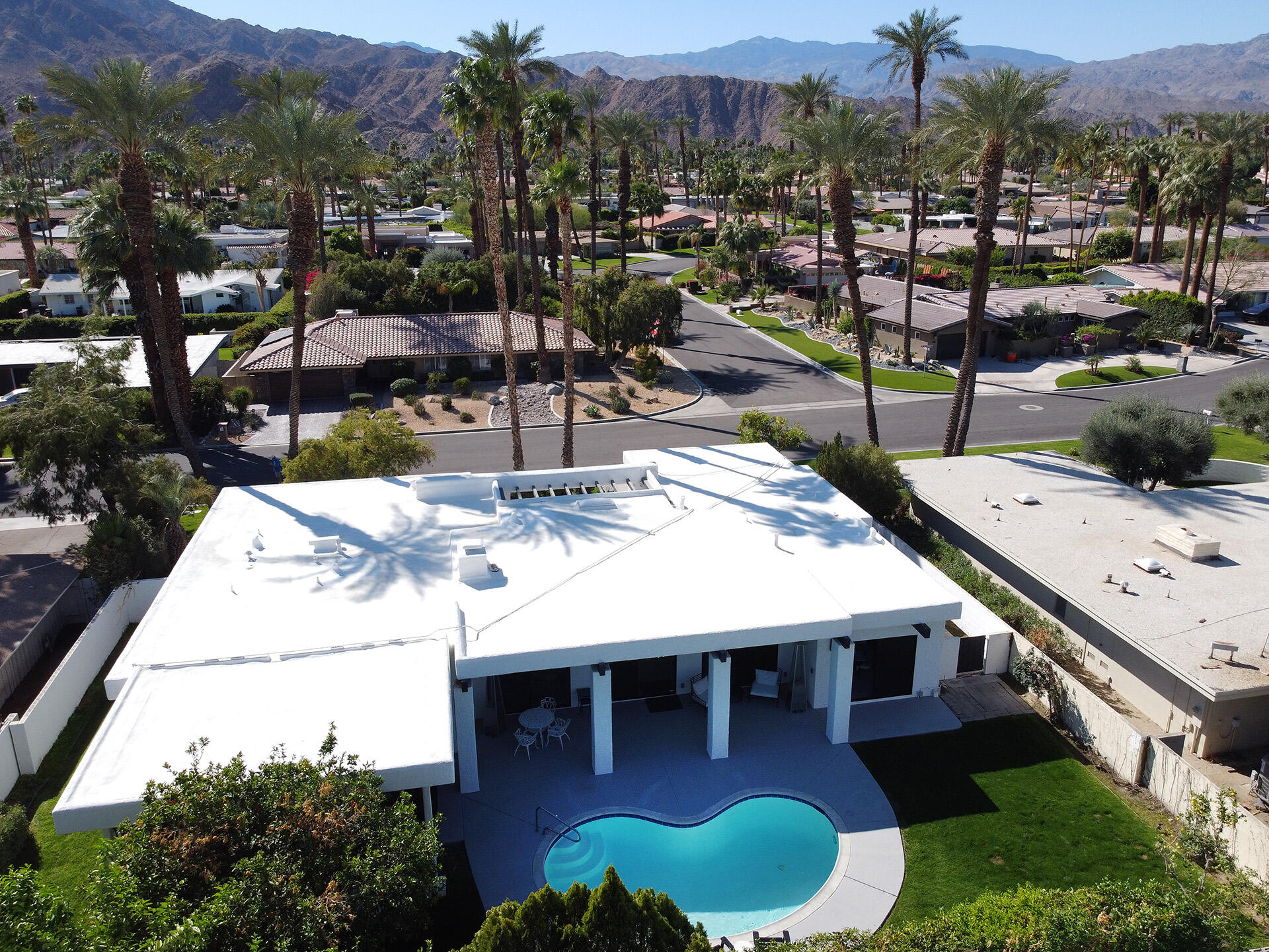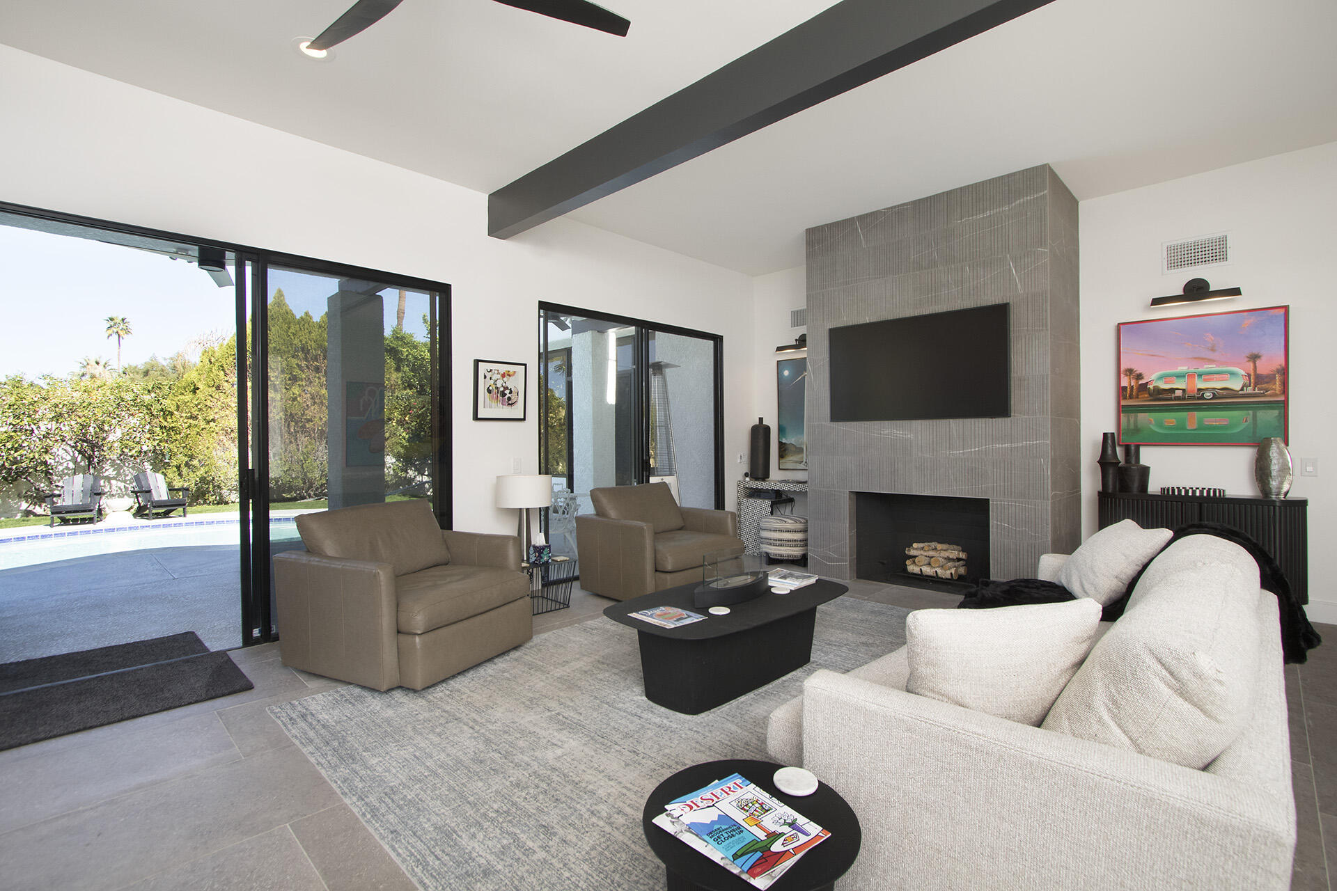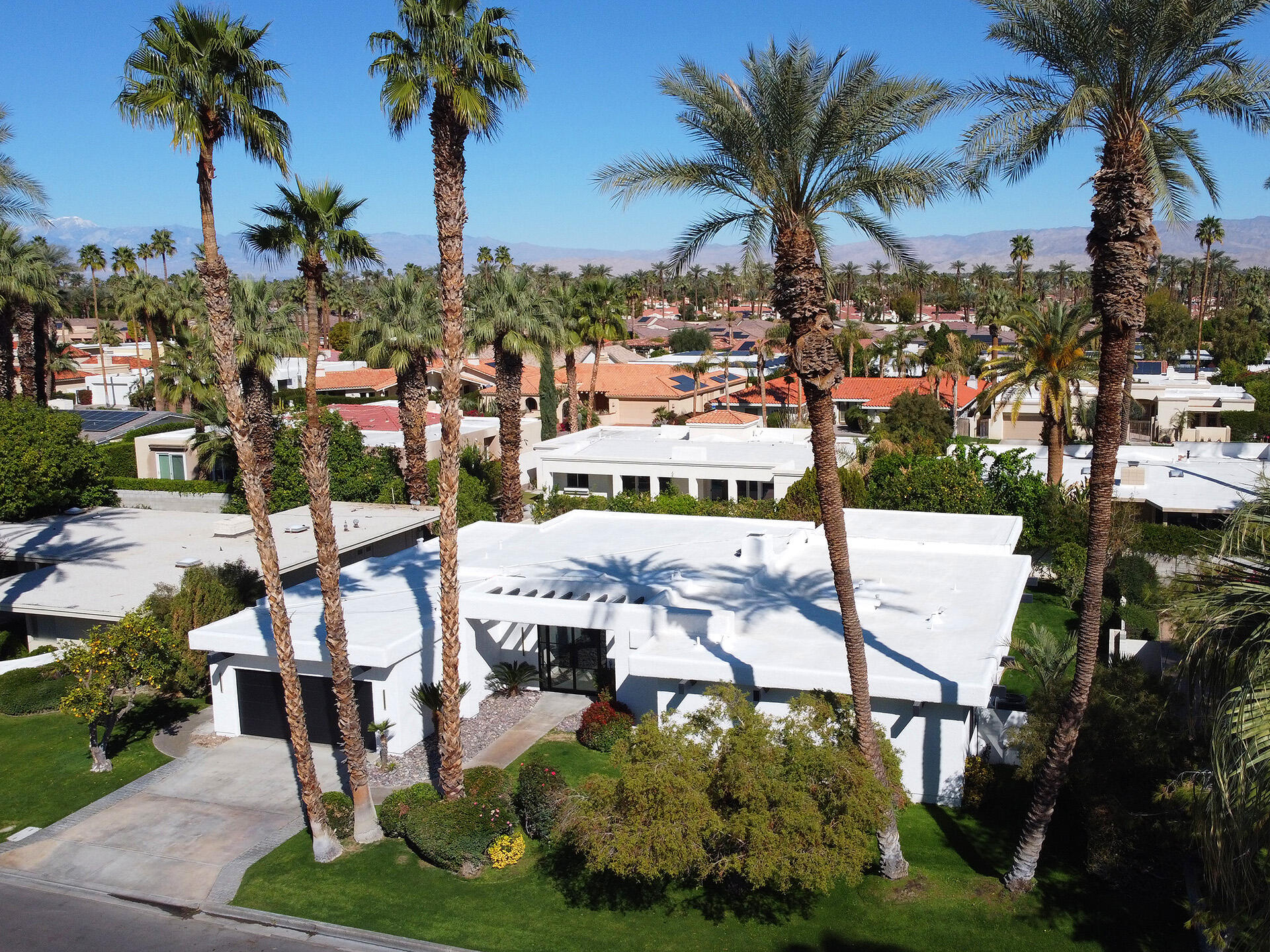 Simply bring your clothes on a hanger to this stunning, floor-up remodel where the works been done for you! From the new custom large glass front doors to the luxury modern floors this nearly 3,000 foot contemporary property has been exquisitely re-worked offering both function and sophistication. A modern, stylish new kitchen sets the palette with high-end appliances, new stone countertops and custom cabinets framed by new lighting and attractive open shelving. A new granite-wrapped bar with wine fridge compliment the large great room anchored by a custom focal fireplace, large painted ceiling beams, multiple sliding step-out windows and plenty of wall space for artwork. The expansive primary suite opens to a bonus, outdoor atrium perfect as an exercise space or art studio. All 3 full baths, along with the entry powder room have been thoughtfully remodeled and/or expanded providing warm luxury and comfort for the spacious, en-suite bedrooms. A newly resurfaced salt-water pool shimmers in the private, lush rear yard where the palm shadows shade the numerous citrus trees. Roof has been fully remodeled with new foam and seal. New windows in all bedrooms. New electrical panel allows for EV charging. Set below the expansive view of Eisenhower mountain, this fully-remodeled modern monument, close to shopping and dining, offers the quintessential light & bright, indoor/outdoor experience that defines desert living!Interested in this Listing?