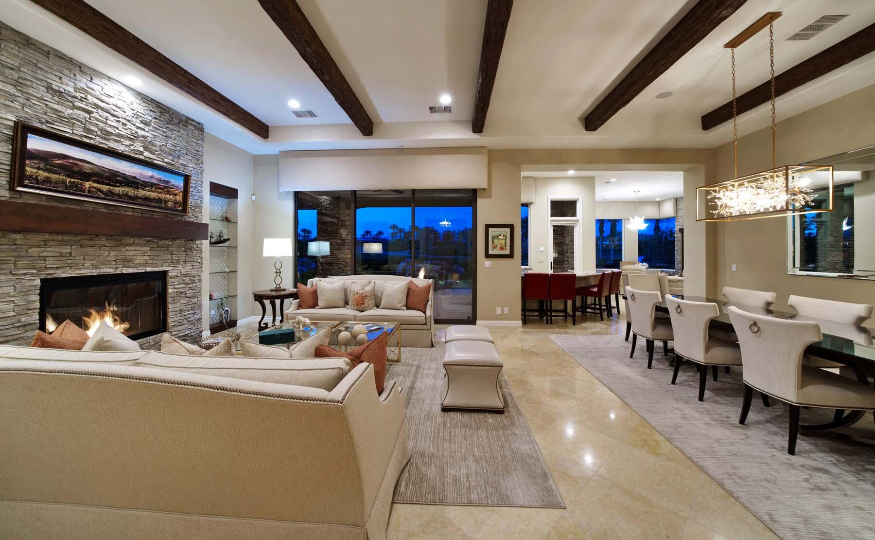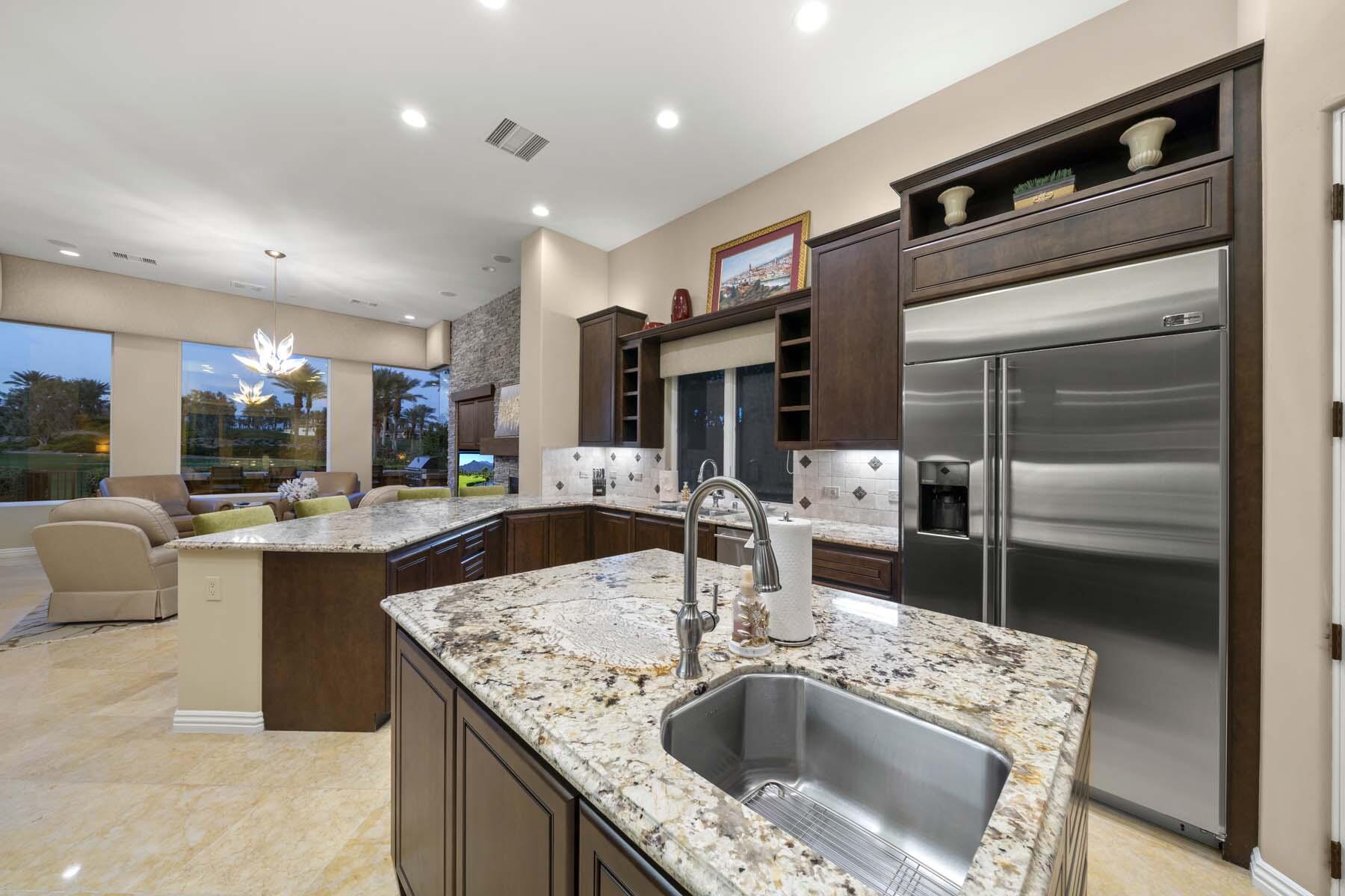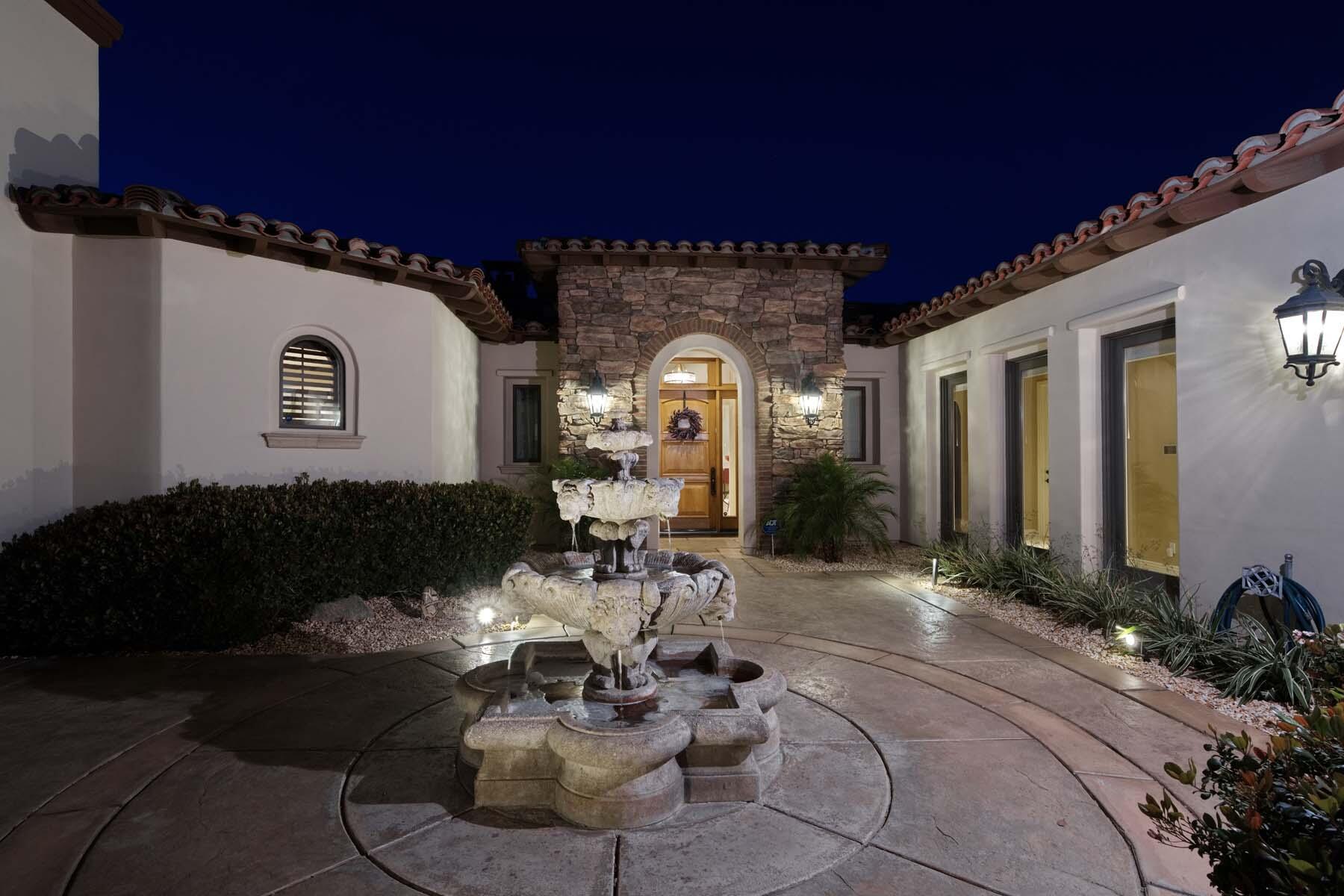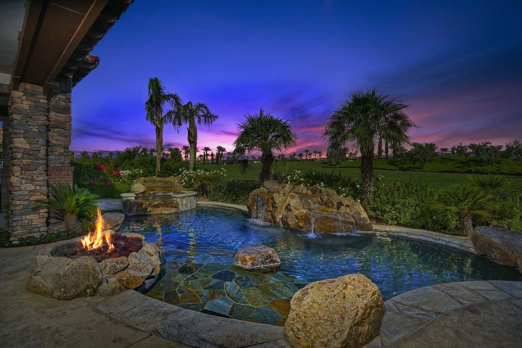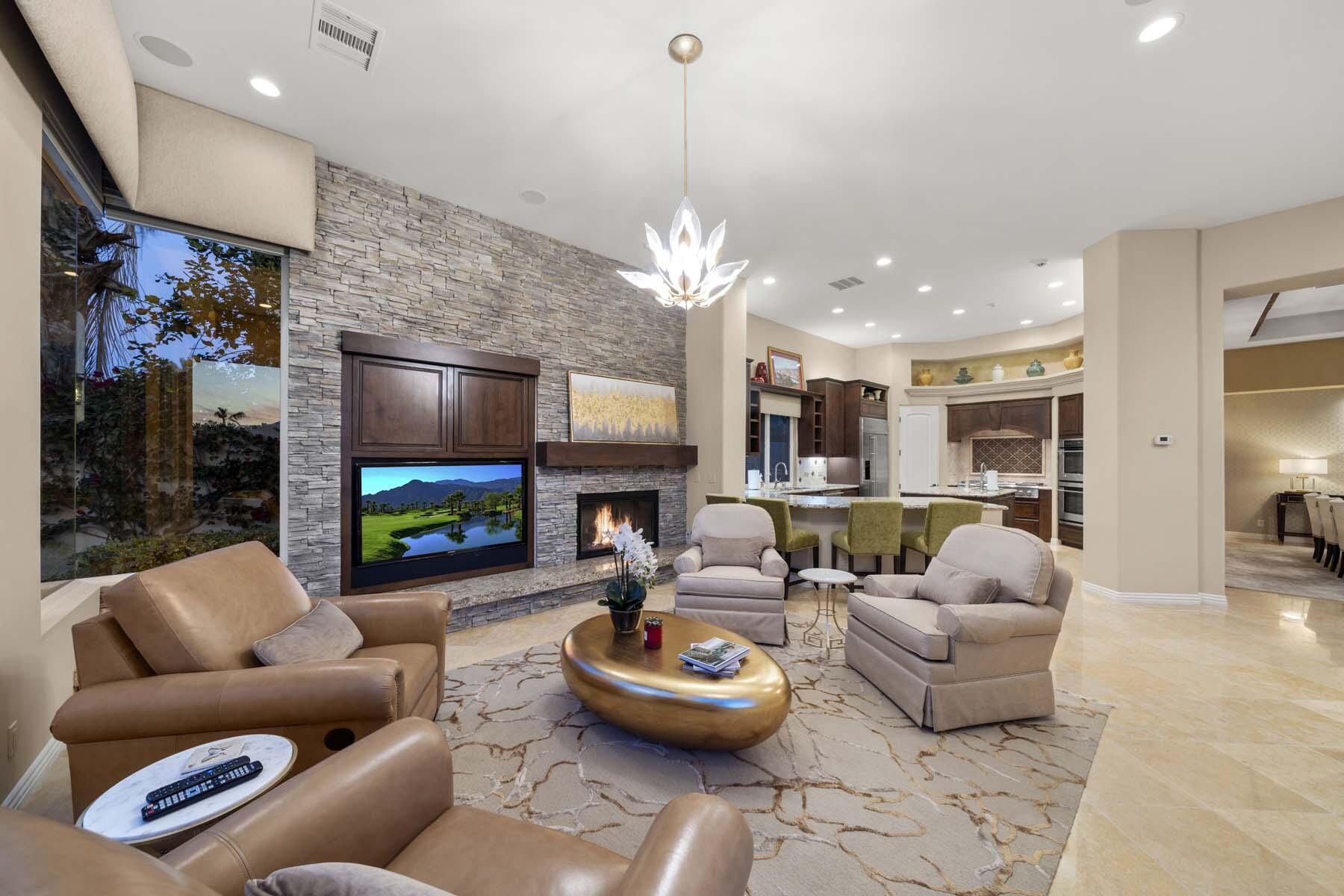 Experience unparalleled desert living in this stunning Plan 721 at Toscana Country Club. With over 4,200 sq.ft. of living space, this elegant home offers breathtaking views of a serene lake and holes 13 and 14 of the Jack Nicklaus South Golf Course.No detail has been overlooked, from the upgraded cedar garage doors to the custom-tiled beach-entry pool with cascading waterfalls, creating a peaceful retreat right in your own backyard. The expansive outdoor living area features a built-in barbecue with bar seating, perfect for entertaining while enjoying the scenic views.Inside, the home boasts upgraded stone tile floors and LED lighting, enhancing the open-concept design. The gourmet kitchen is a chef's dream, with a large breakfast bar peninsula, custom cabinetry, and high-end appliances. The great room, with its two distinct lounge areas and spacious wet bar with wrap-around seating, is ideal for hosting.The luxurious primary suite offers a separate seating area, perfect for taking in the views or staying cozy by the fireplace. The en-suite bathroom includes a fireplace above the soaking tub, separate vanities, and a large walk-in shower. The guest house provides privacy and comfort, featuring a bedroom, en-suite bathroom, seating area and kitchenette.Whether you're relaxing in the primary suite, hosting guests in the gourmet kitchen, or enjoying the stunning outdoor spaces, this home offers an exceptional lifestyle at Toscana Country Club.Interested in this Listing?