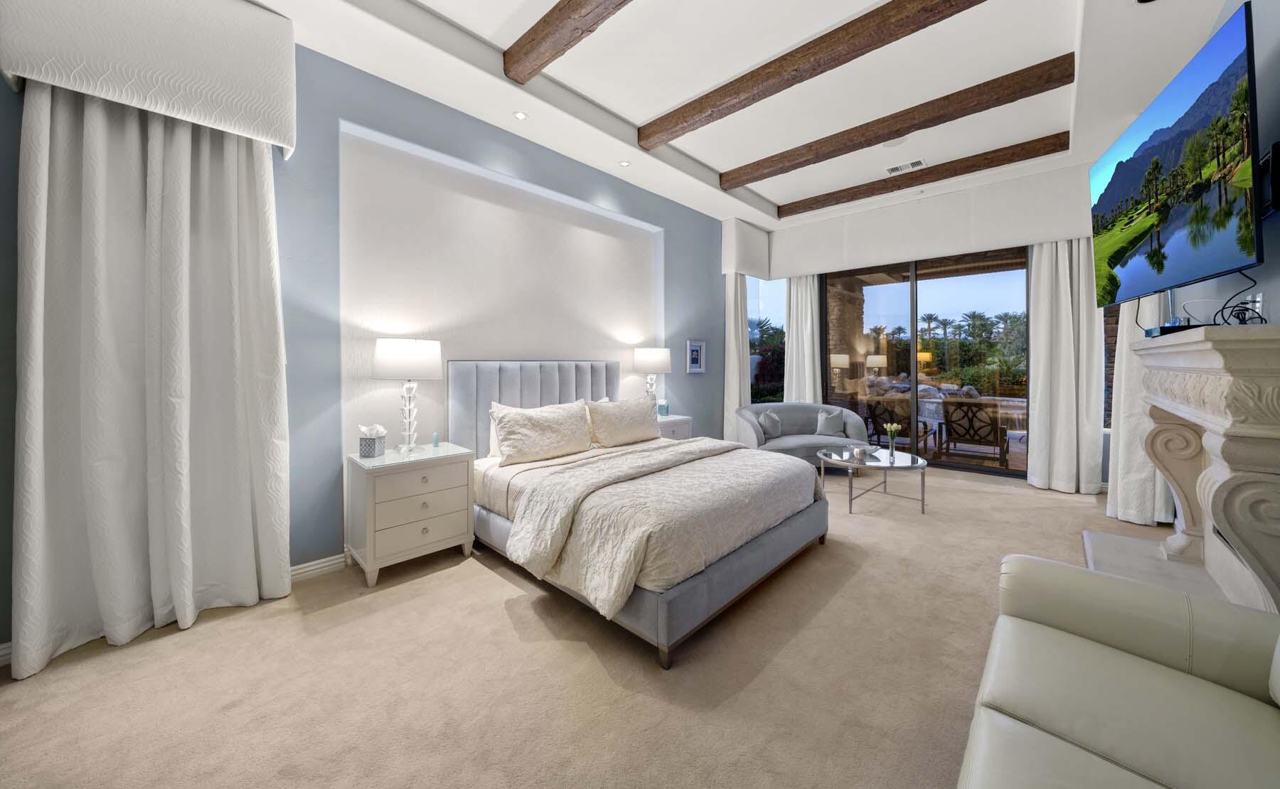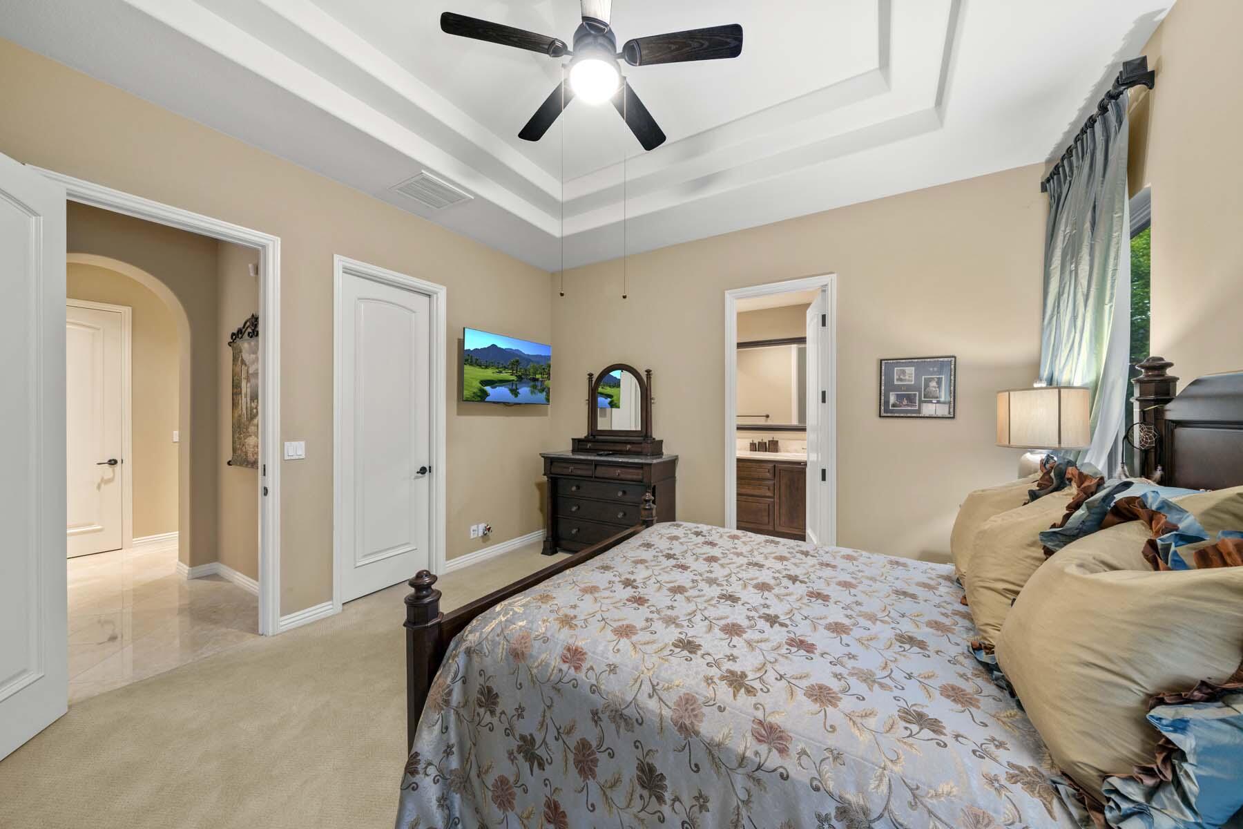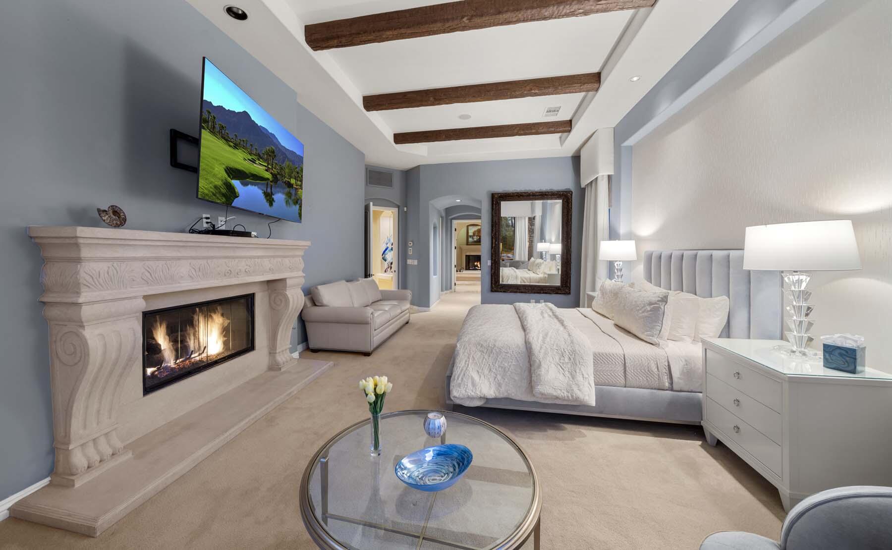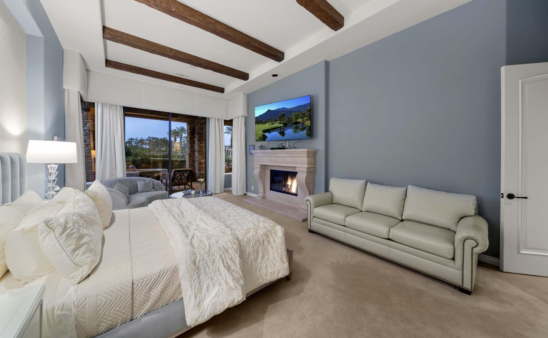 Experience unparalleled desert living in this stunning Plan 721 at Toscana Country Club. With over 4,200 sq.ft. of living space, this elegant home offers breathtaking views of a serene lake and holes 13 and 14 of the Jack Nicklaus South Golf Course.No detail has been overlooked, from the upgraded cedar garage doors to the custom-tiled beach-entry pool with cascading waterfalls, creating a peaceful retreat right in your own backyard. The expansive outdoor living area features a built-in barbecue with bar seating, perfect for entertaining while enjoying the scenic views.Inside, the home boasts upgraded stone tile floors and LED lighting, enhancing the open-concept design. The gourmet kitchen is a chef's dream, with a large breakfast bar peninsula, custom cabinetry, and high-end appliances. The great room, with its two distinct lounge areas and spacious wet bar with wrap-around seating, is ideal for hosting.The luxurious primary suite offers a separate seating area, perfect for taking in the views or staying cozy by the fireplace. The en-suite bathroom includes a fireplace above the soaking tub, separate vanities, and a large walk-in shower. The guest house provides privacy and comfort, featuring a bedroom, en-suite bathroom, seating area and kitchenette.Whether you're relaxing in the primary suite, hosting guests in the gourmet kitchen, or enjoying the stunning outdoor spaces, this home offers an exceptional lifestyle at Toscana Country Club.Interested in this Listing?