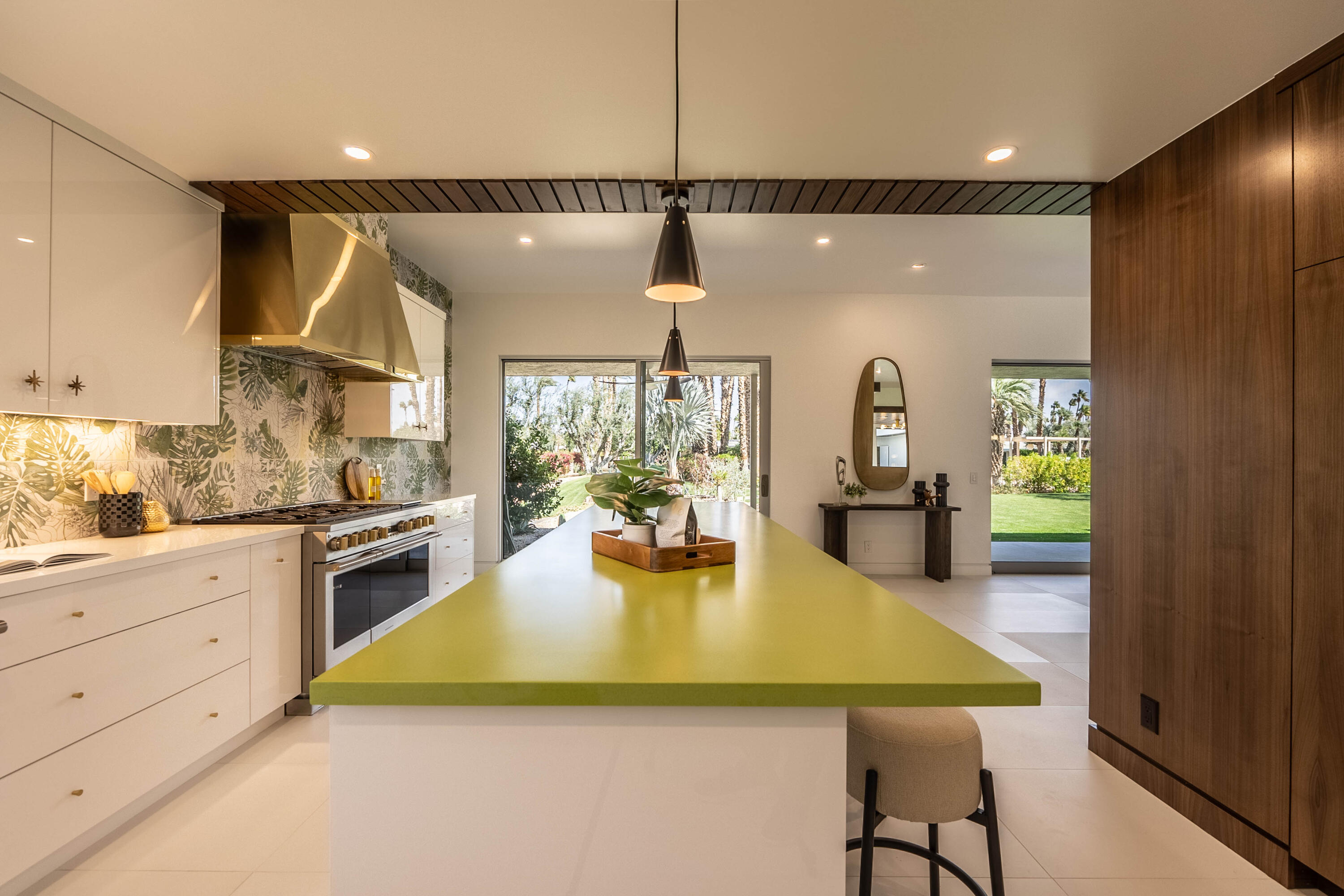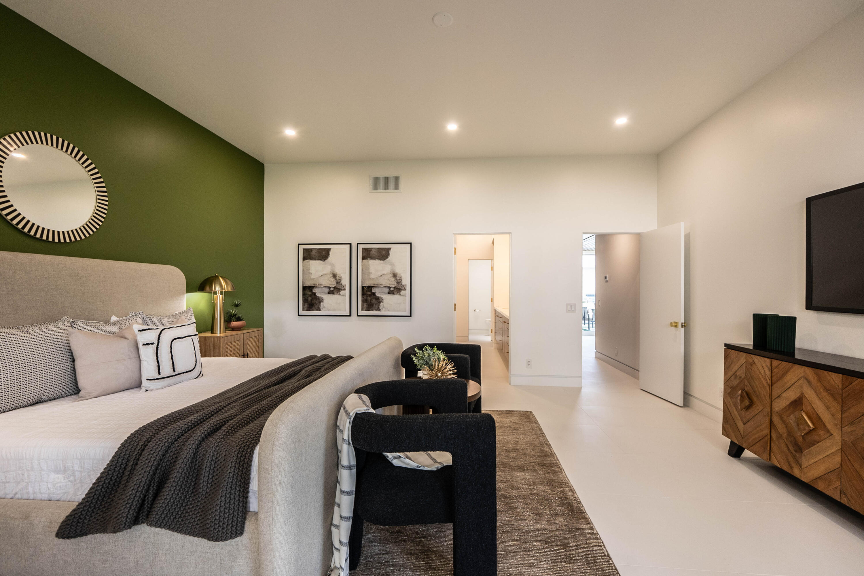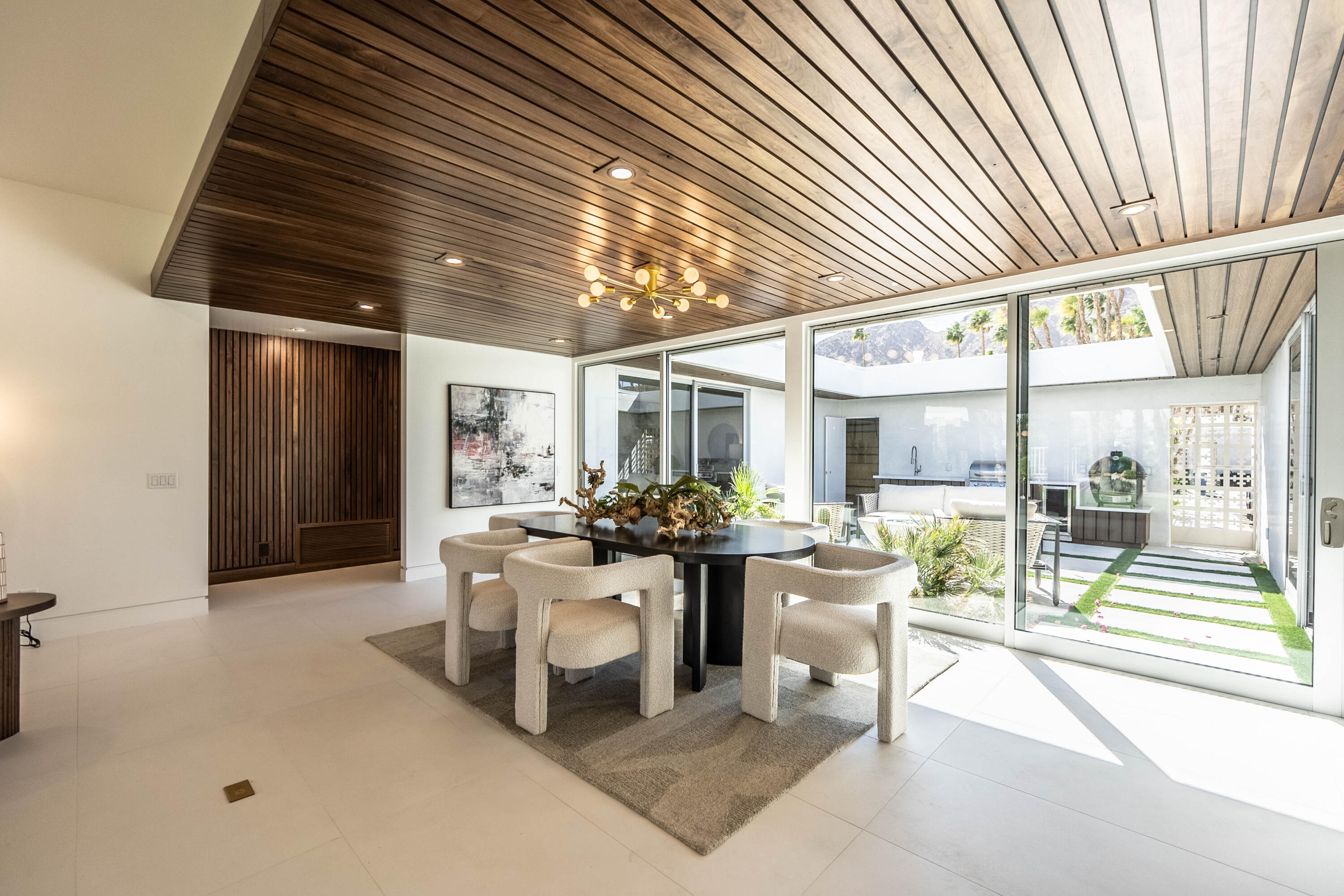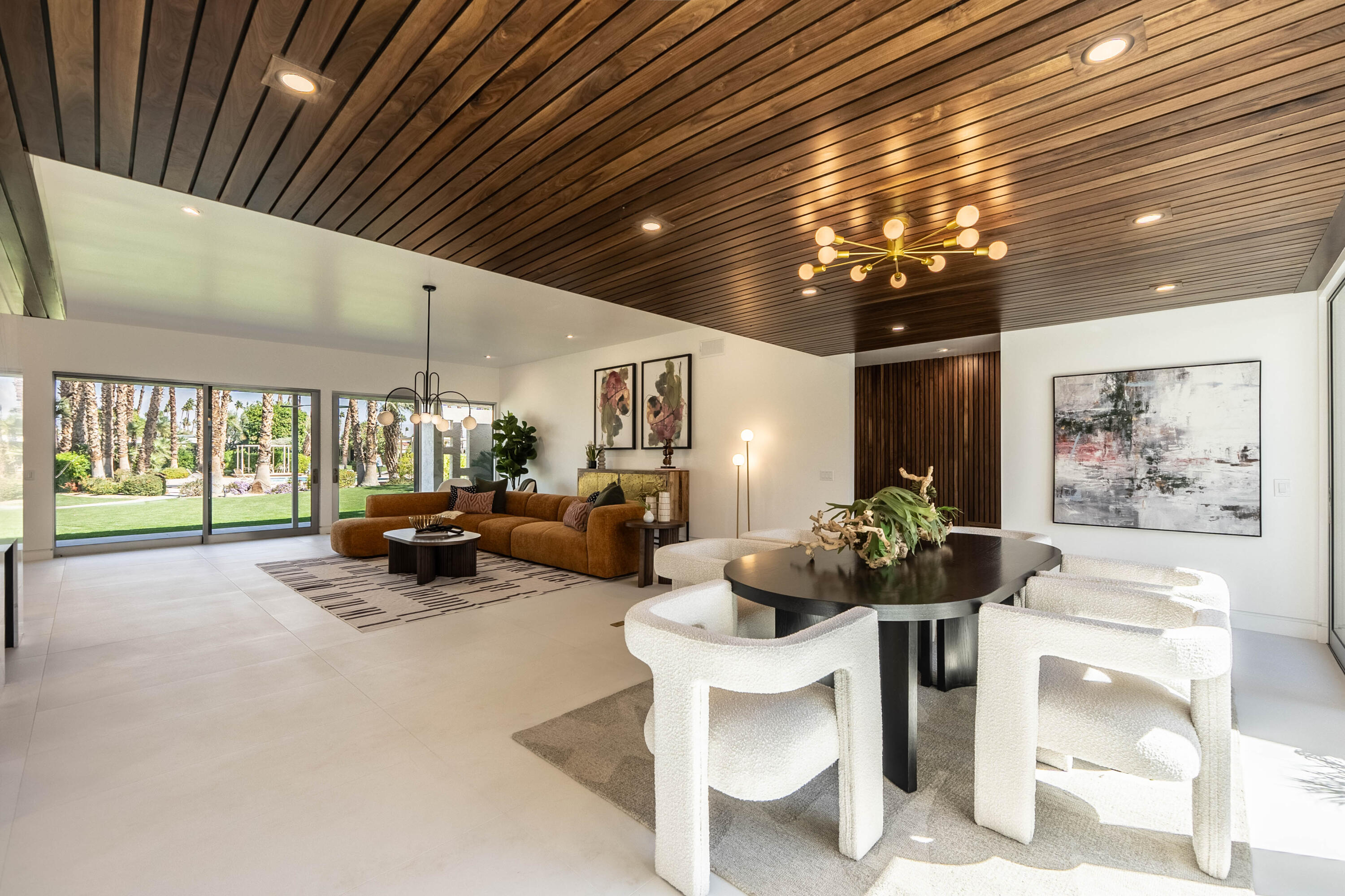 Welcome to this absolutely stunning, completely remodeled William Krisel-designed villa located in the sought-after historical landmark of the Sandpiper Community within Indian Wells Country Club. This exquisite property has been thoughtfully re-imagined, blending modern elegance with amenities while preserving its unique architectural history that embodies the charm of desert living. As you enter through the elegant double-door entry, you'll find yourself in a stunning foyer, complete with a custom-built accent wall that truly stands out. Step into the expansive great room with beautifully-crafted walnut wood-slat detailing & a quartz wall surrounding the fireplace & wet bar, creating a warm inviting atmosphere. The dining room is a masterpiece, framed beneath a suspended ceiling that highlights the same beautiful walnut detailing. The modern & elegant kitchen is a true chef's dream featuring a stainless-steel Dacor full-size individual refrigerator & freezer, along with a glass front wine refrigerator for your favorite vintages. The GE Monogram 6-burner gas range with griddle ensures you have all the tools you need to create culinary masterpieces. Expansive storage & an oversized breakfast counter with seating, complemented by a custom countertop, anchor the room, making the space both functional and stylish. Retreat to the spacious primary suite, where luxury meets comfort. This spa-like oasis features a walk-in shower, a relaxing Roman tub, oversized vanity adorned with quartz countertops plus custom lighting. A large walk-in closet offers ample storage space. Meticulously designed, this retreat is a perfect blend of opulence and functionality.2 additional en-suite bedrooms are equally spacious & luxurious offering a large vanity plus a walk-in shower with elegant glass doors, providing a perfect blend of style and convenience. These beautifully designed spaces ensure comfort and privacy for family or guests.At the heart of the home lies an inviting atrium patioInterested in this Listing?