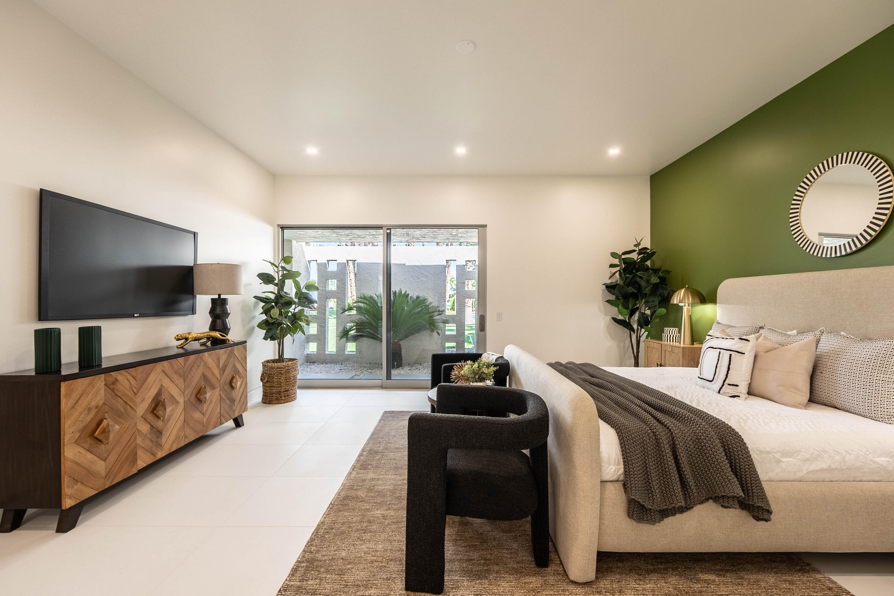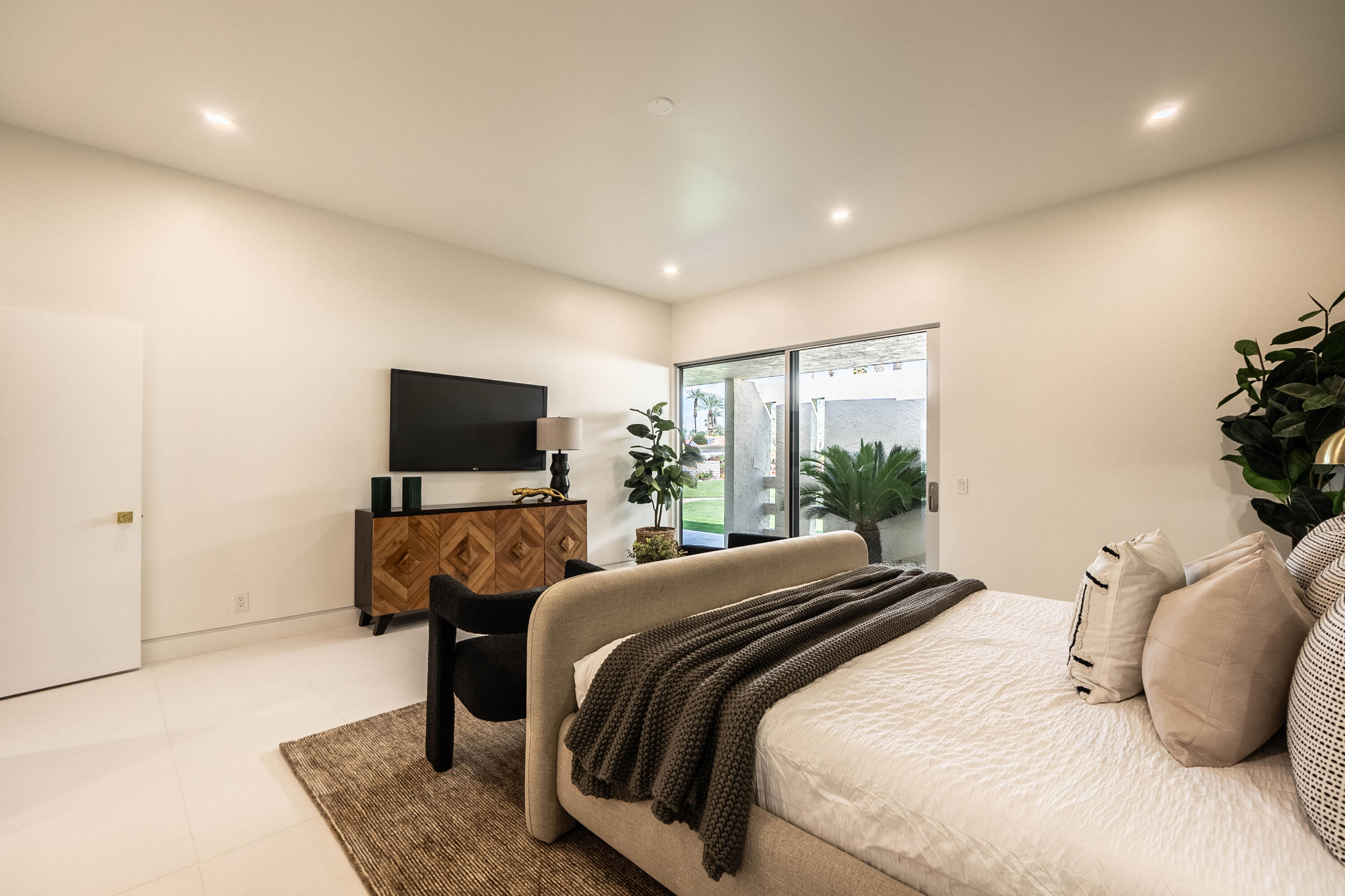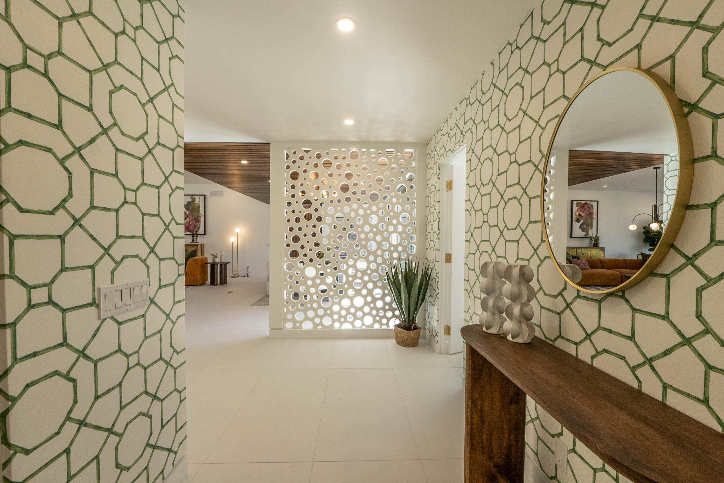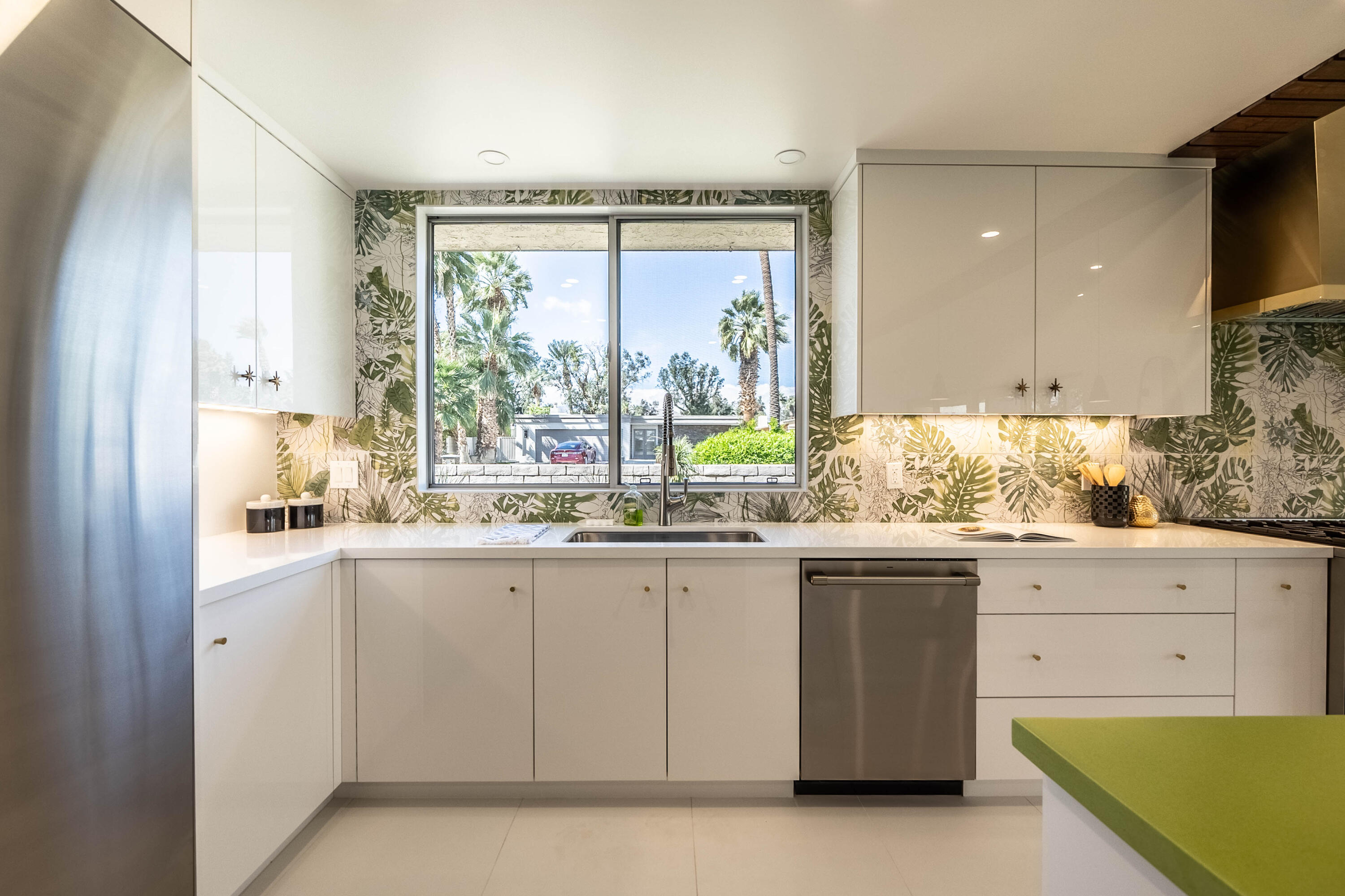 Welcome to this absolutely stunning, completely remodeled William Krisel-designed villa located in the sought-after historical landmark of the Sandpiper Community within Indian Wells Country Club. This exquisite property has been thoughtfully re-imagined, blending modern elegance with amenities while preserving its unique architectural history that embodies the charm of desert living. As you enter through the elegant double-door entry, you'll find yourself in a stunning foyer, complete with a custom-built accent wall that truly stands out. Step into the expansive great room with beautifully-crafted walnut wood-slat detailing & a quartz wall surrounding the fireplace & wet bar, creating a warm inviting atmosphere. The dining room is a masterpiece, framed beneath a suspended ceiling that highlights the same beautiful walnut detailing. The modern & elegant kitchen is a true chef's dream featuring a stainless-steel Dacor full-size individual refrigerator & freezer, along with a glass front wine refrigerator for your favorite vintages. The GE Monogram 6-burner gas range with griddle ensures you have all the tools you need to create culinary masterpieces. Expansive storage & an oversized breakfast counter with seating, complemented by a custom countertop, anchor the room, making the space both functional and stylish. Retreat to the spacious primary suite, where luxury meets comfort. This spa-like oasis features a walk-in shower, a relaxing Roman tub, oversized vanity adorned with quartz countertops plus custom lighting. A large walk-in closet offers ample storage space. Meticulously designed, this retreat is a perfect blend of opulence and functionality.2 additional en-suite bedrooms are equally spacious & luxurious offering a large vanity plus a walk-in shower with elegant glass doors, providing a perfect blend of style and convenience. These beautifully designed spaces ensure comfort and privacy for family or guests.At the heart of the home lies an inviting atrium patioInterested in this Listing?