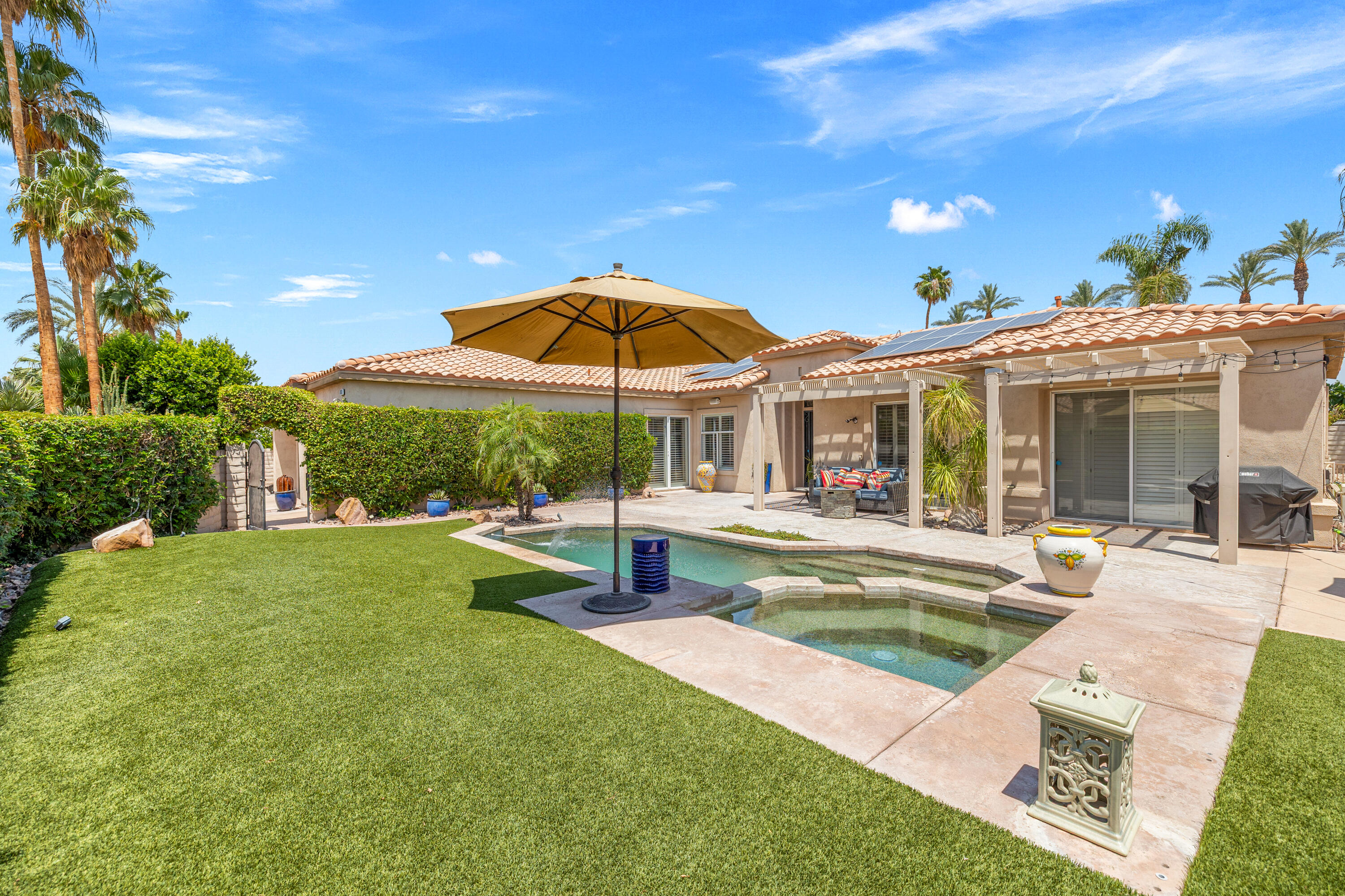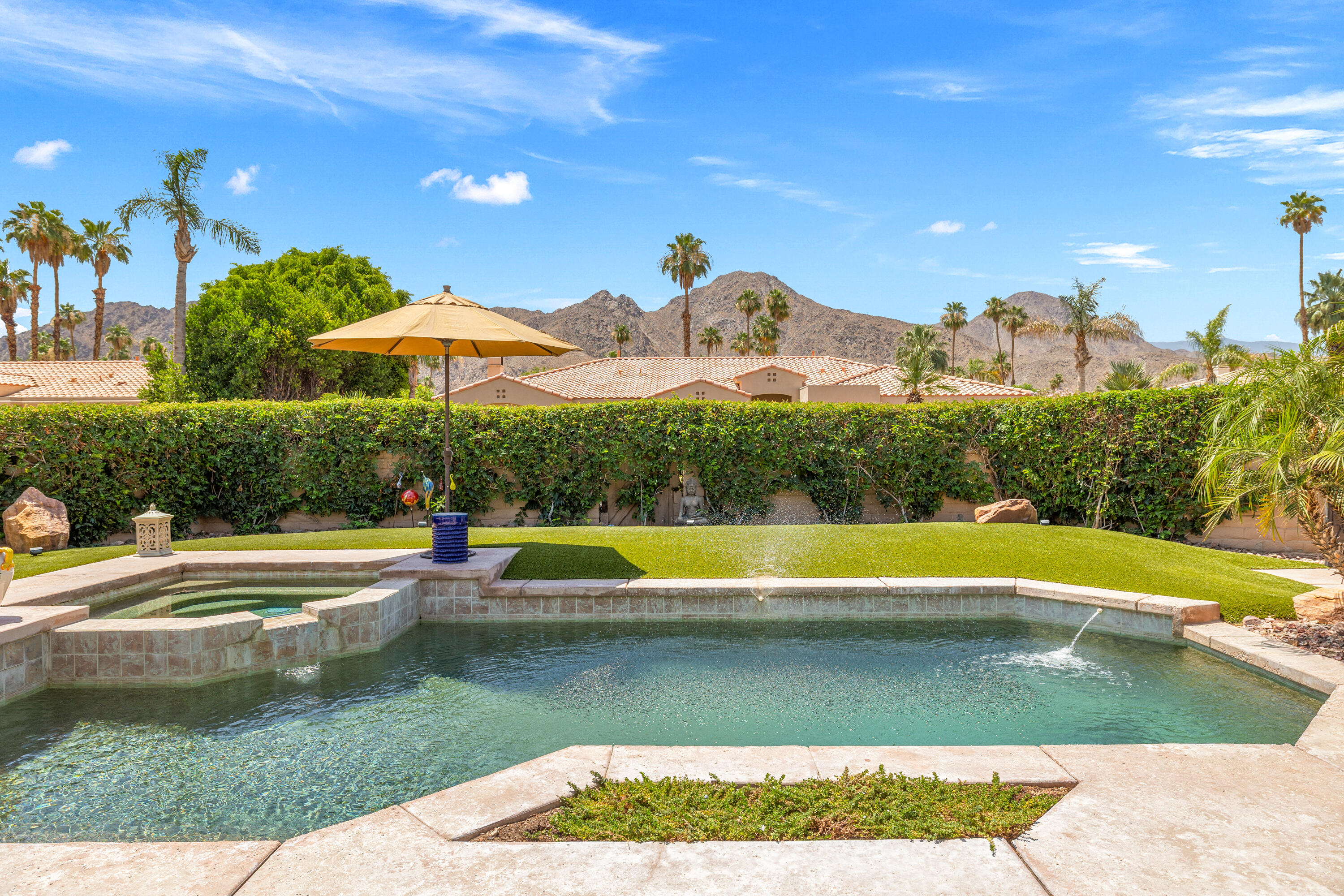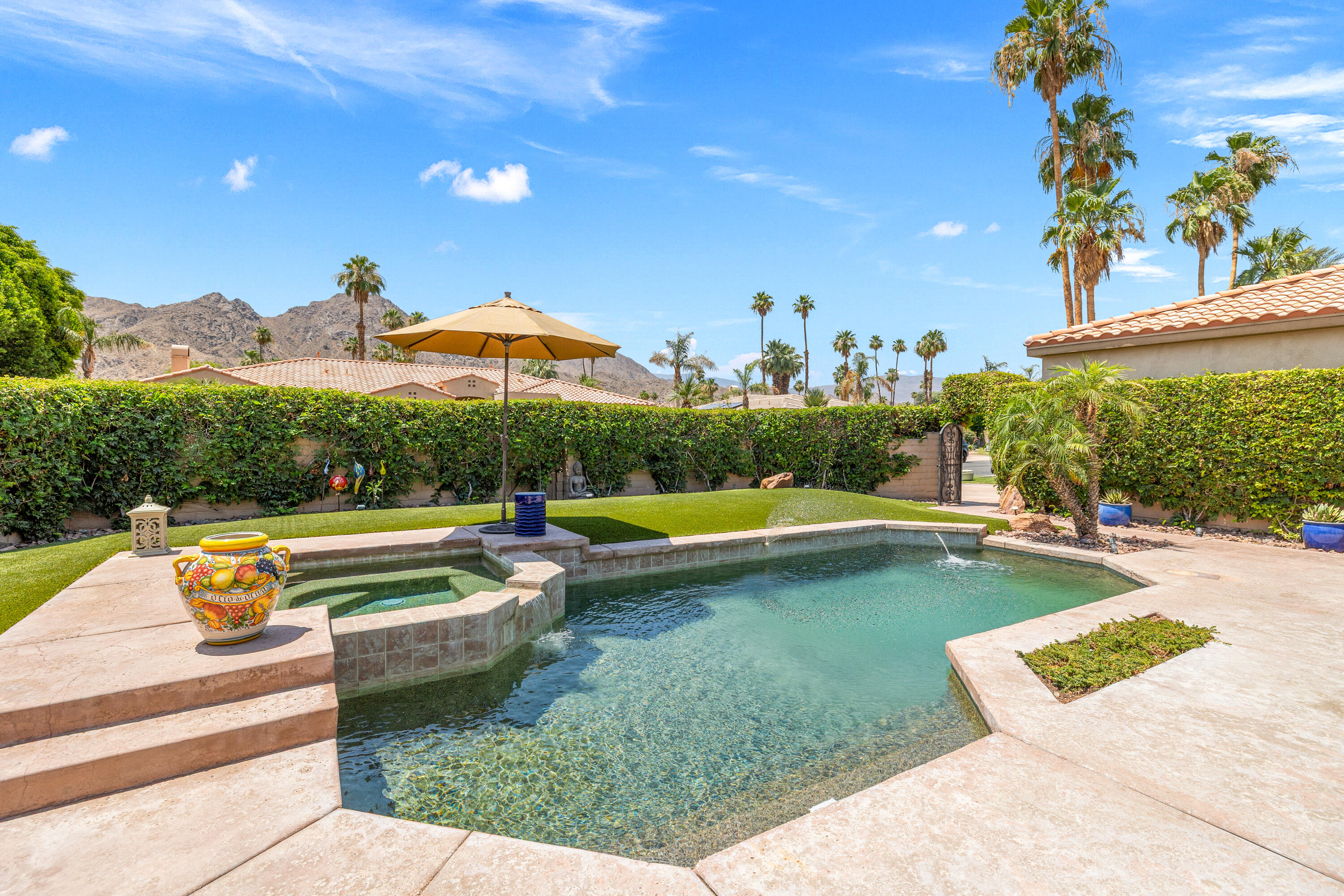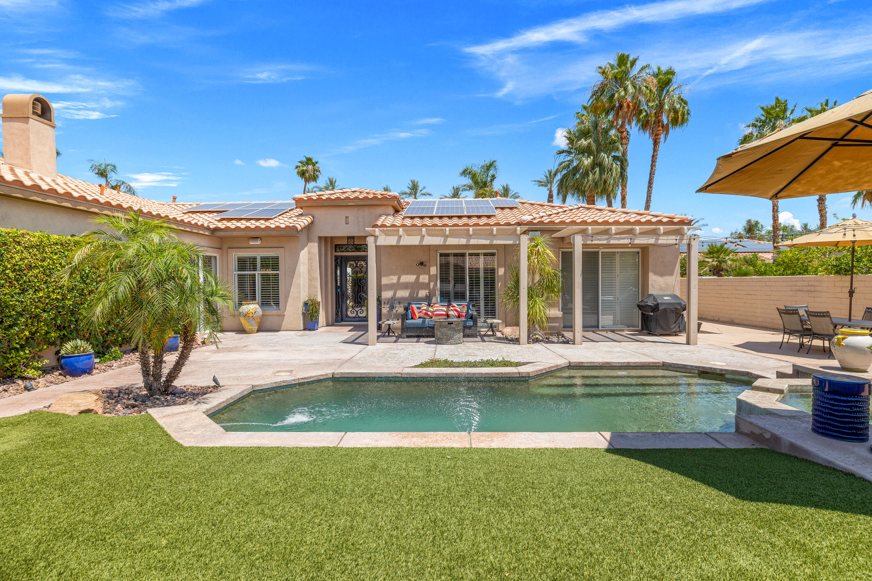 Panoramic mountain views from the home's spacious south facing Courtyard with pool/spa, large green lawn, and extraordinarily large patio for lounging and entertainment. Indoor/Outdoor living at its best, this beautiful, furnished 2544 Sq. Ft., 4 bedrooms, 2.5 baths, 3 car garage home with paid Solar is within the Colony at prestigious Indian Wells Country Club. Beautiful wrought iron gated entry into private Courtyard where pebble tech pool/spa, beautiful palm trees, lawn and south mountain views await you. Front entrance into open Living Room with travertine chiseled stone floors, plantation shutters, high 10' ceilings and beautiful Crown molding throughout. The Fornal Dining area has awesome views, and the Open Kitchen has white cabinets, granite counters, stainless Kitchen Aid appliances including a double oven, bar seating, and a big pantry. The Family Room has a granite fireplace. Primary Bedroom has wonderful views with direct access to pool/spa. Primary Bath has a jet tub, large shower, dual sinks, and big walk-in closet with custom cabinetry. One Guest Bedroom is used as home office and overlooks the pool/spa. Another Guest Bedroom has ensuite Bath with granite countertops, and a large shower. Powder Bath is spacious with pedestal sink. The Laundry Room has a deep tub sink and lots of storage cabinets. Large back lawn with citrus trees and patio which wraps around on the east side of the house. Truly a gem in Indian Wells!Interested in this Listing?
