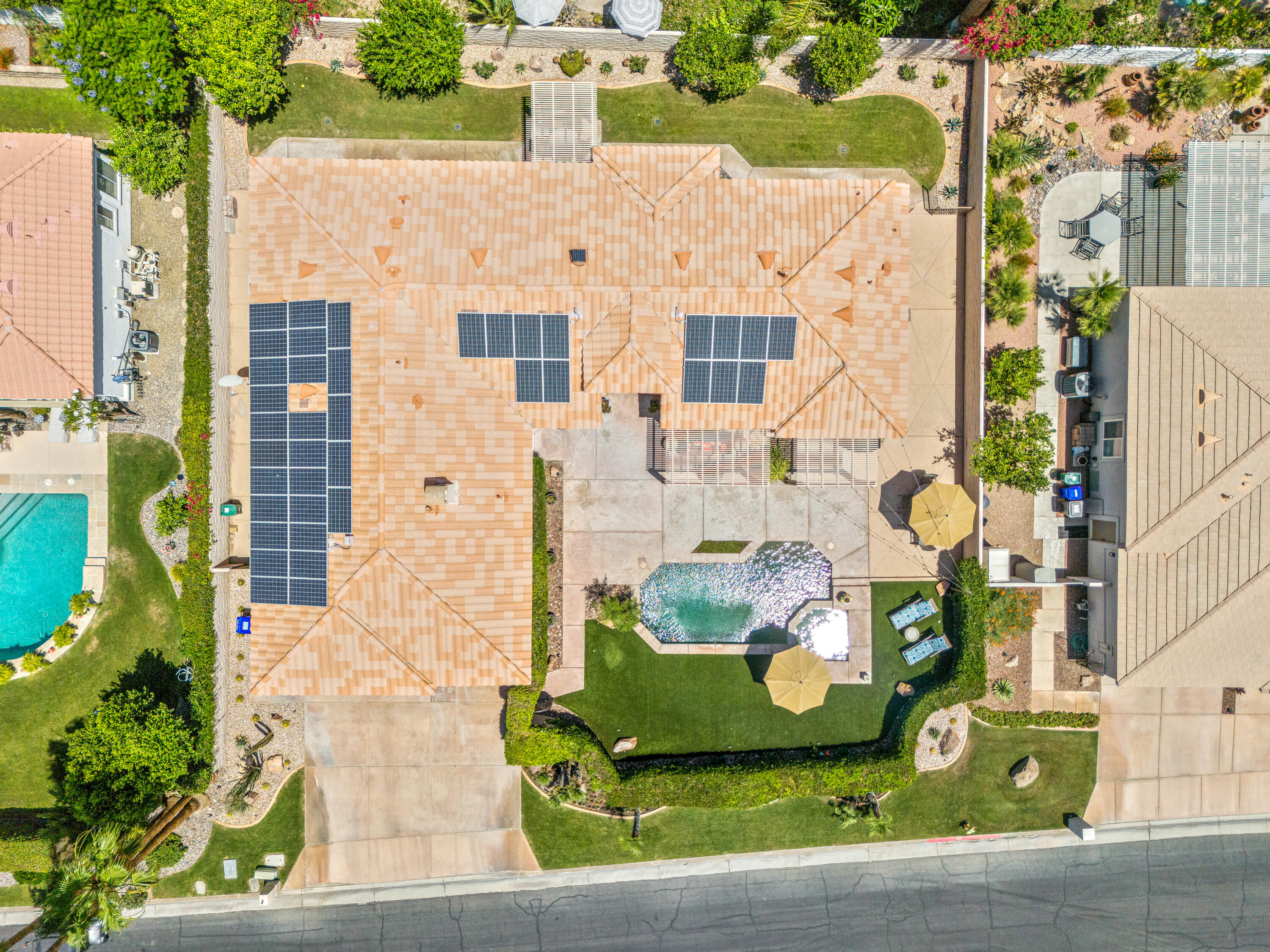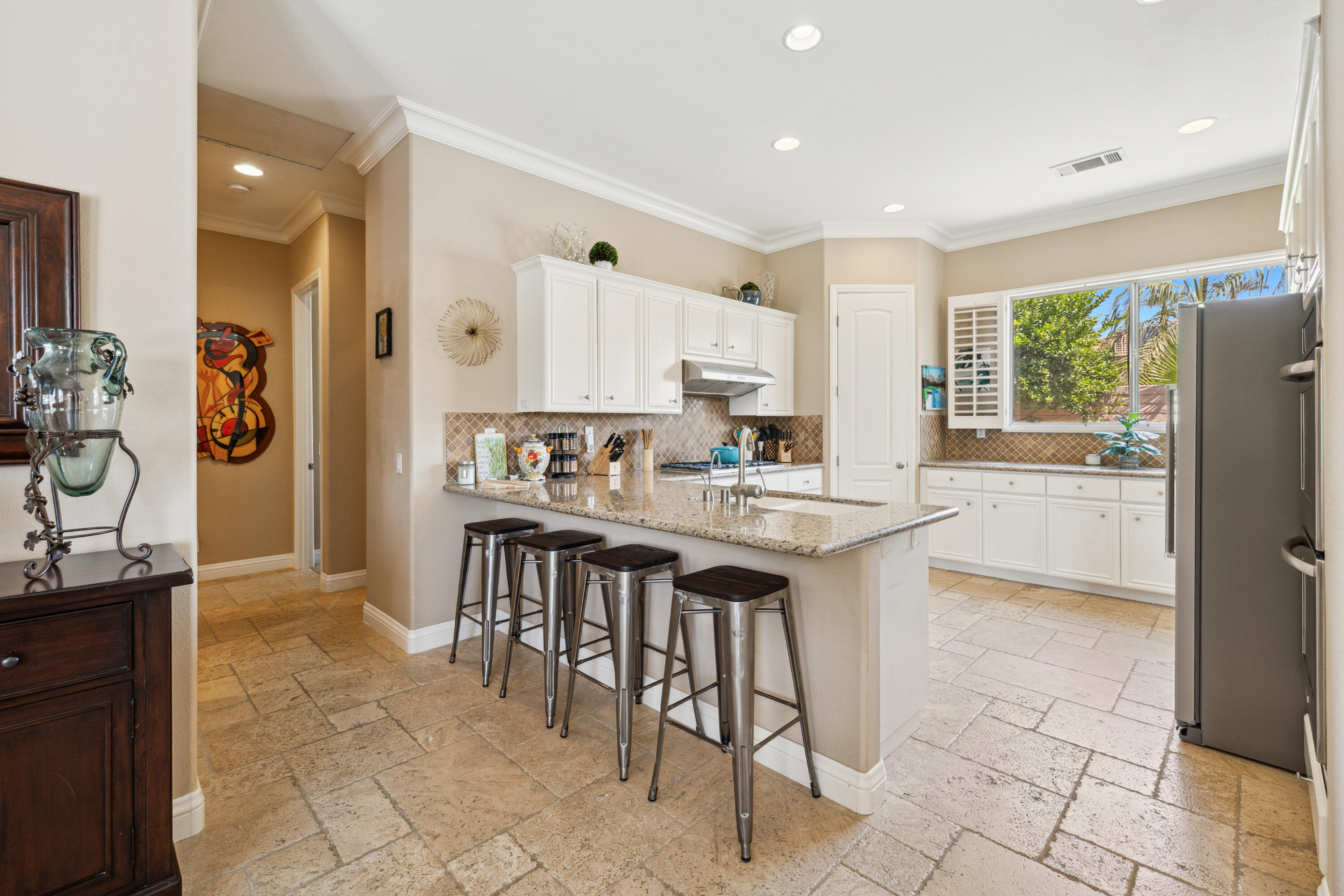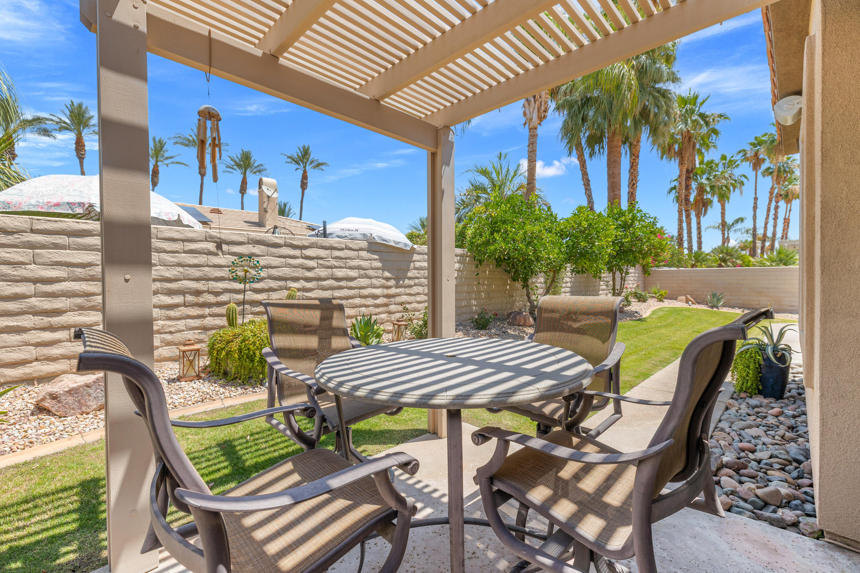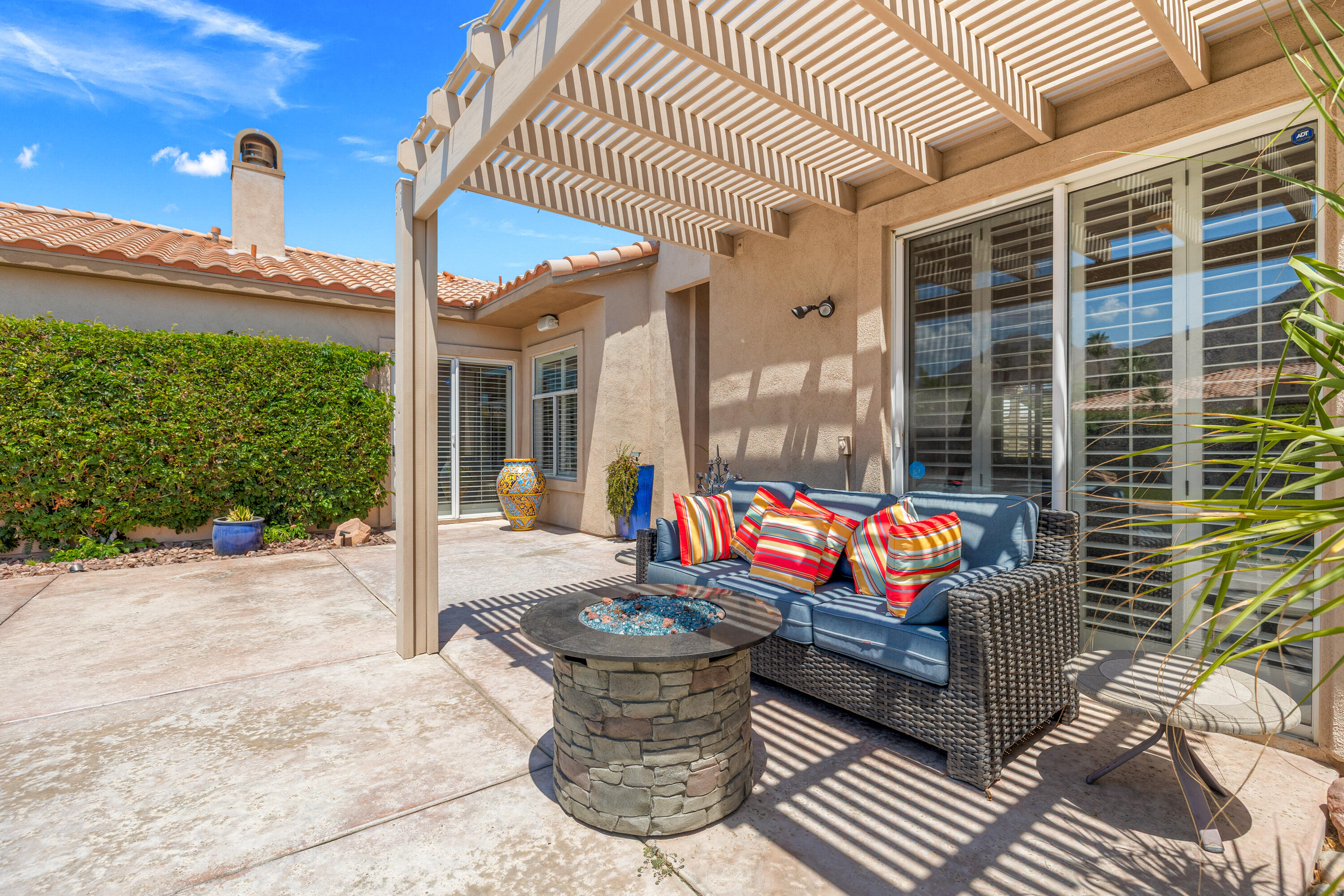 Panoramic mountain views from the home's spacious south facing Courtyard with pool/spa, large green lawn, and extraordinarily large patio for lounging and entertainment. Indoor/Outdoor living at its best, this beautiful, furnished 2544 Sq. Ft., 4 bedrooms, 2.5 baths, 3 car garage home with paid Solar is within the Colony at prestigious Indian Wells Country Club. Beautiful wrought iron gated entry into private Courtyard where pebble tech pool/spa, beautiful palm trees, lawn and south mountain views await you. Front entrance into open Living Room with travertine chiseled stone floors, plantation shutters, high 10' ceilings and beautiful Crown molding throughout. The Fornal Dining area has awesome views, and the Open Kitchen has white cabinets, granite counters, stainless Kitchen Aid appliances including a double oven, bar seating, and a big pantry. The Family Room has a granite fireplace. Primary Bedroom has wonderful views with direct access to pool/spa. Primary Bath has a jet tub, large shower, dual sinks, and big walk-in closet with custom cabinetry. One Guest Bedroom is used as home office and overlooks the pool/spa. Another Guest Bedroom has ensuite Bath with granite countertops, and a large shower. Powder Bath is spacious with pedestal sink. The Laundry Room has a deep tub sink and lots of storage cabinets. Large back lawn with citrus trees and patio which wraps around on the east side of the house. Truly a gem in Indian Wells!Interested in this Listing?