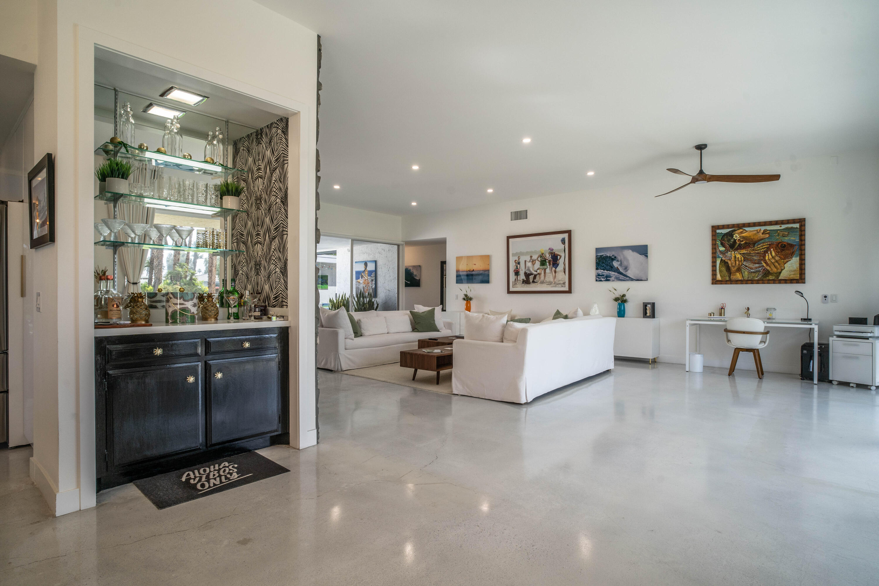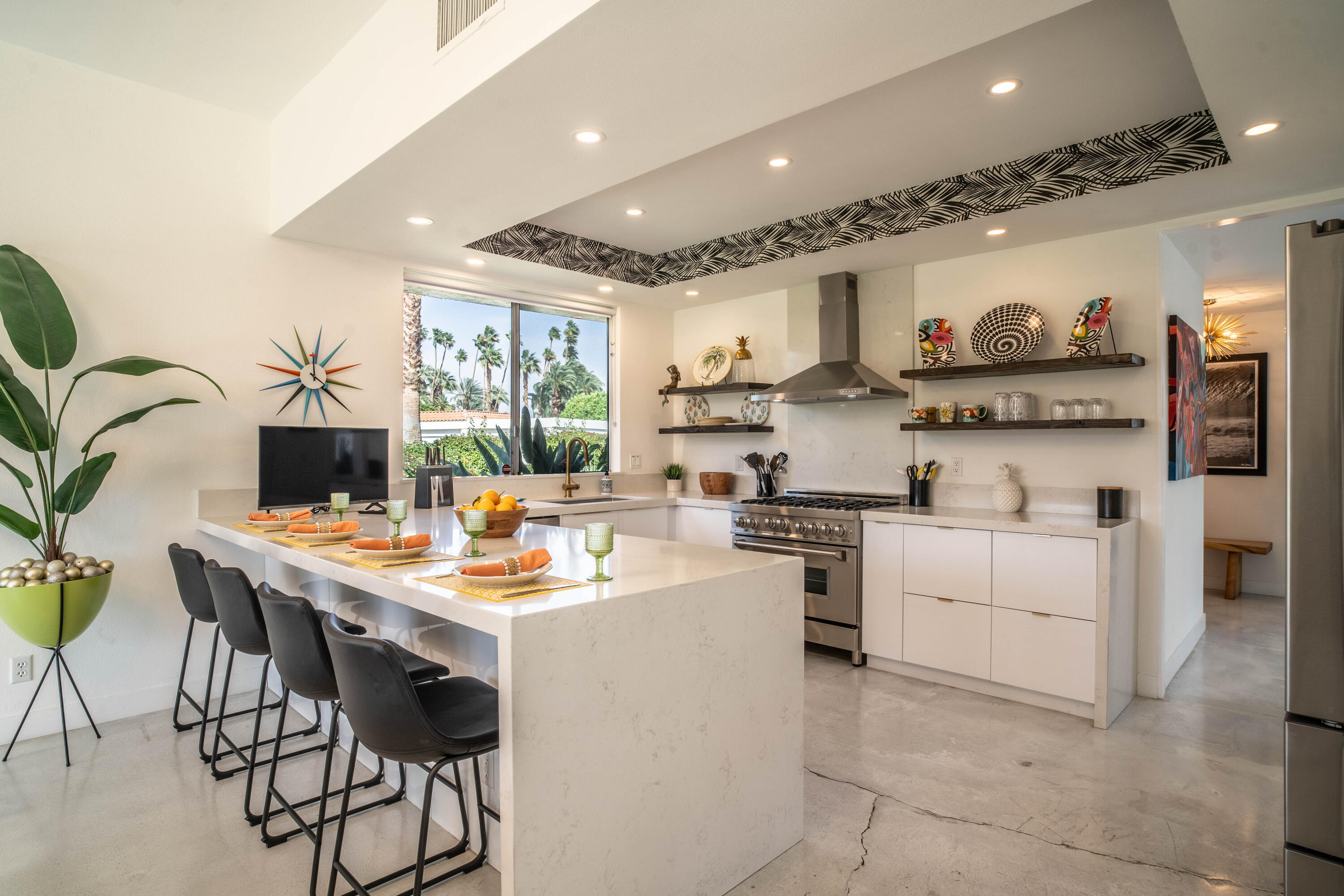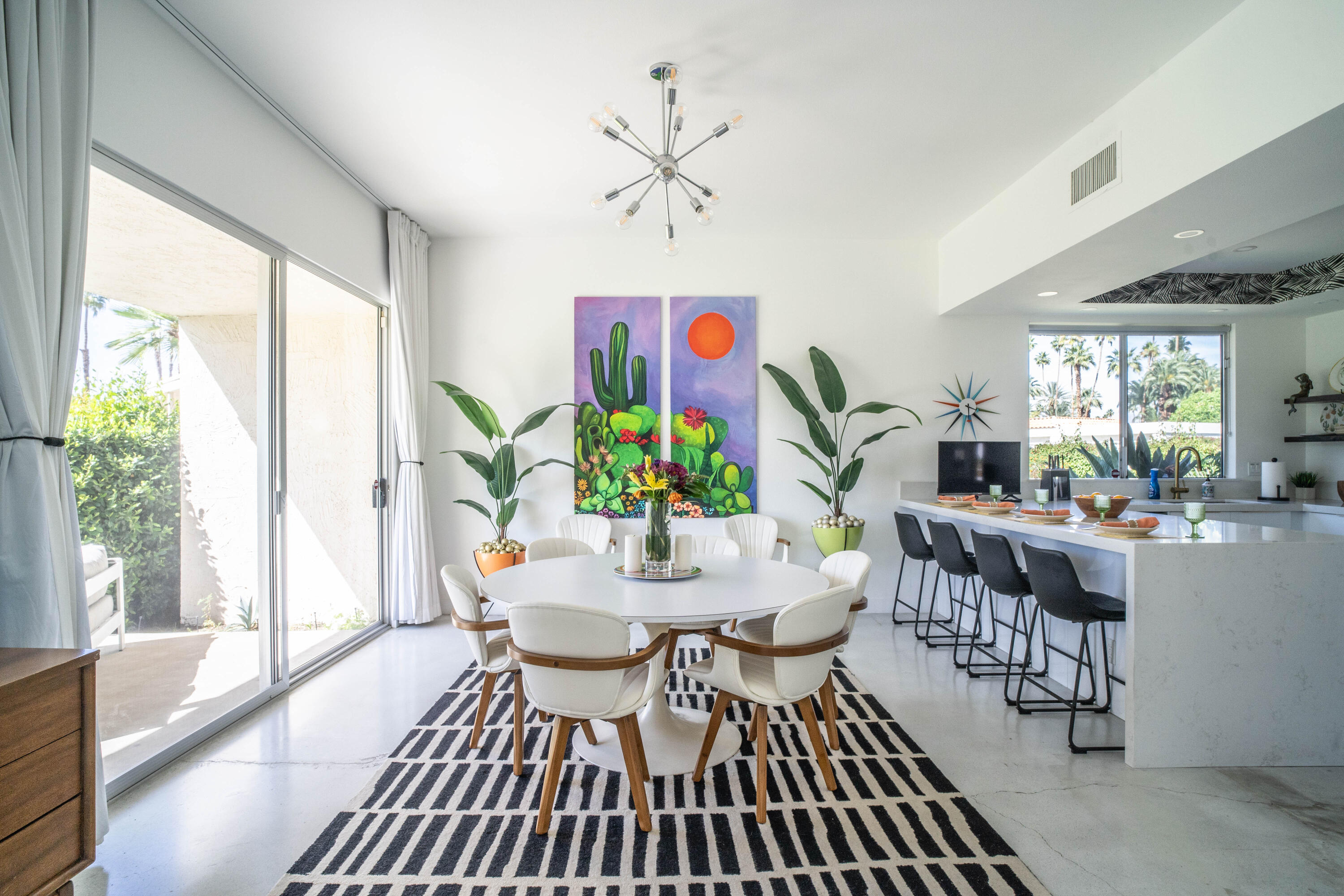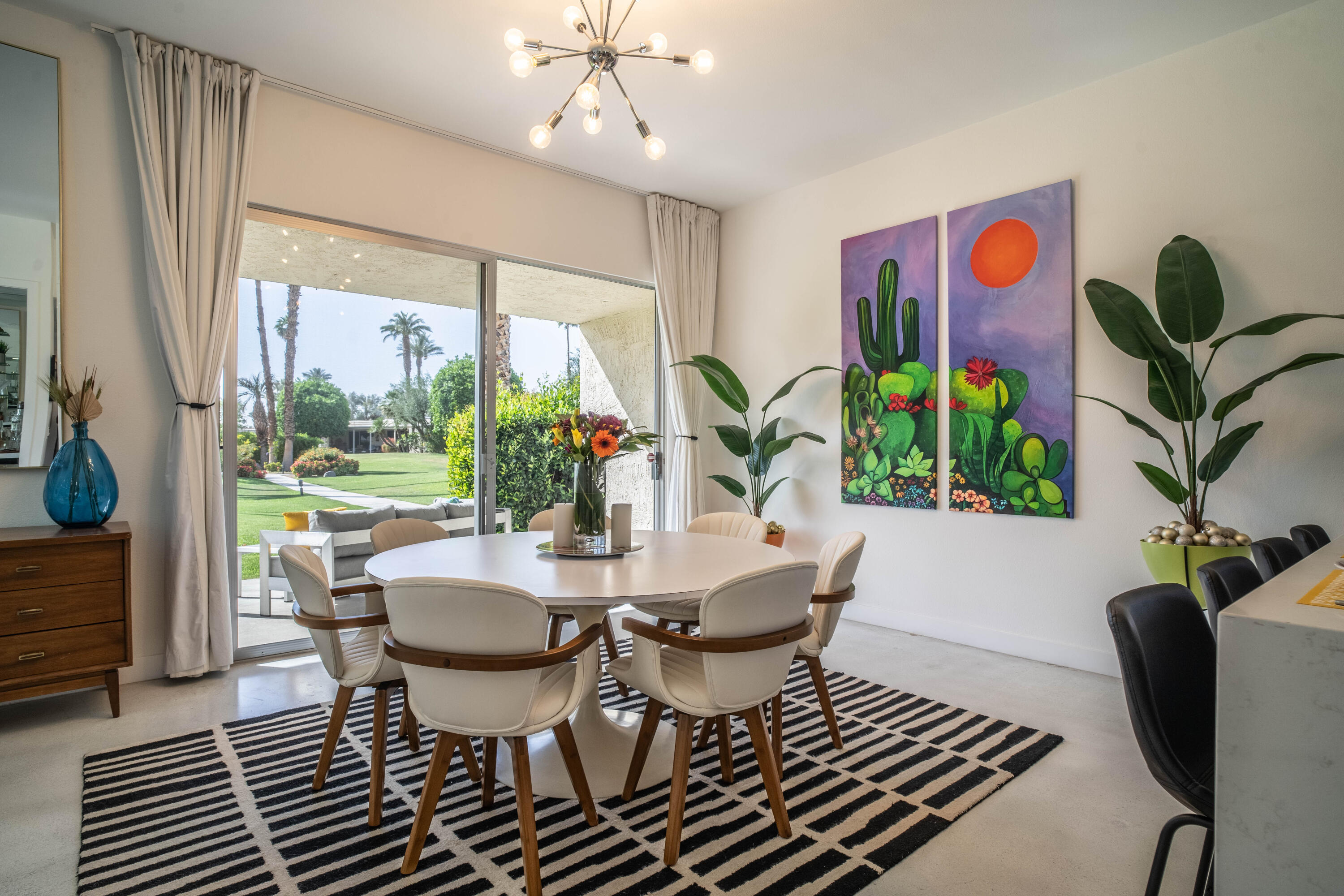 Stunning remodeled William Krisel-designed Mid-Centry Modern Indian Wells Villa located within the highly-sought Sandpiper Community at Indian Wells Country Club. This condo has been tastefully updated to restore the mid-century vibe and honor the history that inspired the allure of desert living. A true masterpiece combining the past with modern luxuries and amenities. The over-sized living room has been enhanced with a floor-to-ceiling stone fireplace and custom lighting updates. The sleek kitchen is complete with stainless steel appliances, quartz countertops, a breakfast bar, custom cabinetry and has been opened to the dining room. Stained & polished concrete flooring blend the spaces throughout the home seamlessly. All bedrooms have ensuite baths, large walk-in closets and open to either the atrium or rear covered patio. The center atrium provides beautiful natural light to the entire floor plan and offers private outdoor gathering space. 2-car garage PLUS golf-cart space with ample storage space. Newer HVAC, on-demand hot water heater and new doors throughout the interior (raised to 8'}. The Laundry room was updated and redone. Located in close proximity to the clubhouse on a lush greenbelt overlooking the community pool surrounded by swaying palm trees.Interested in this Listing?