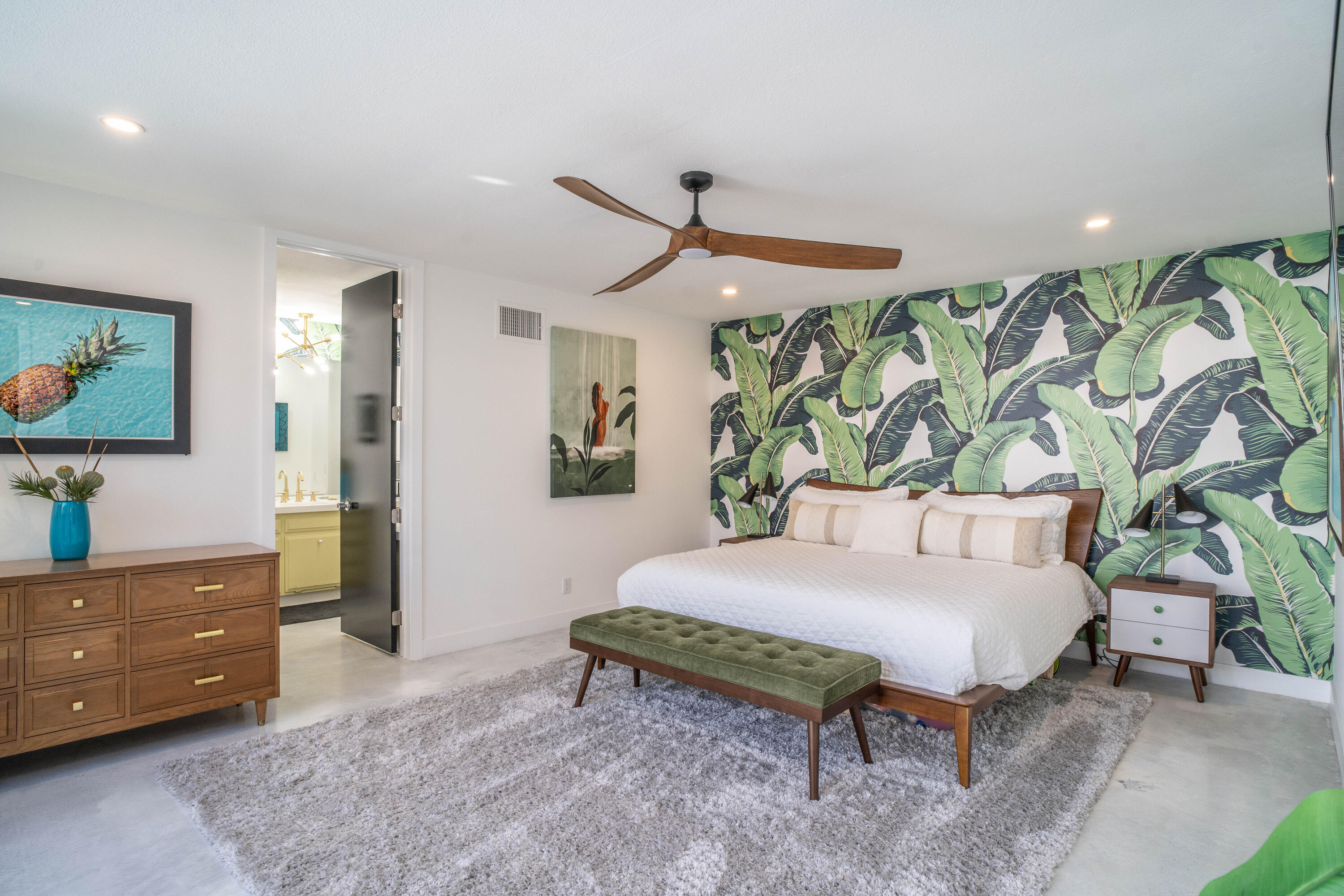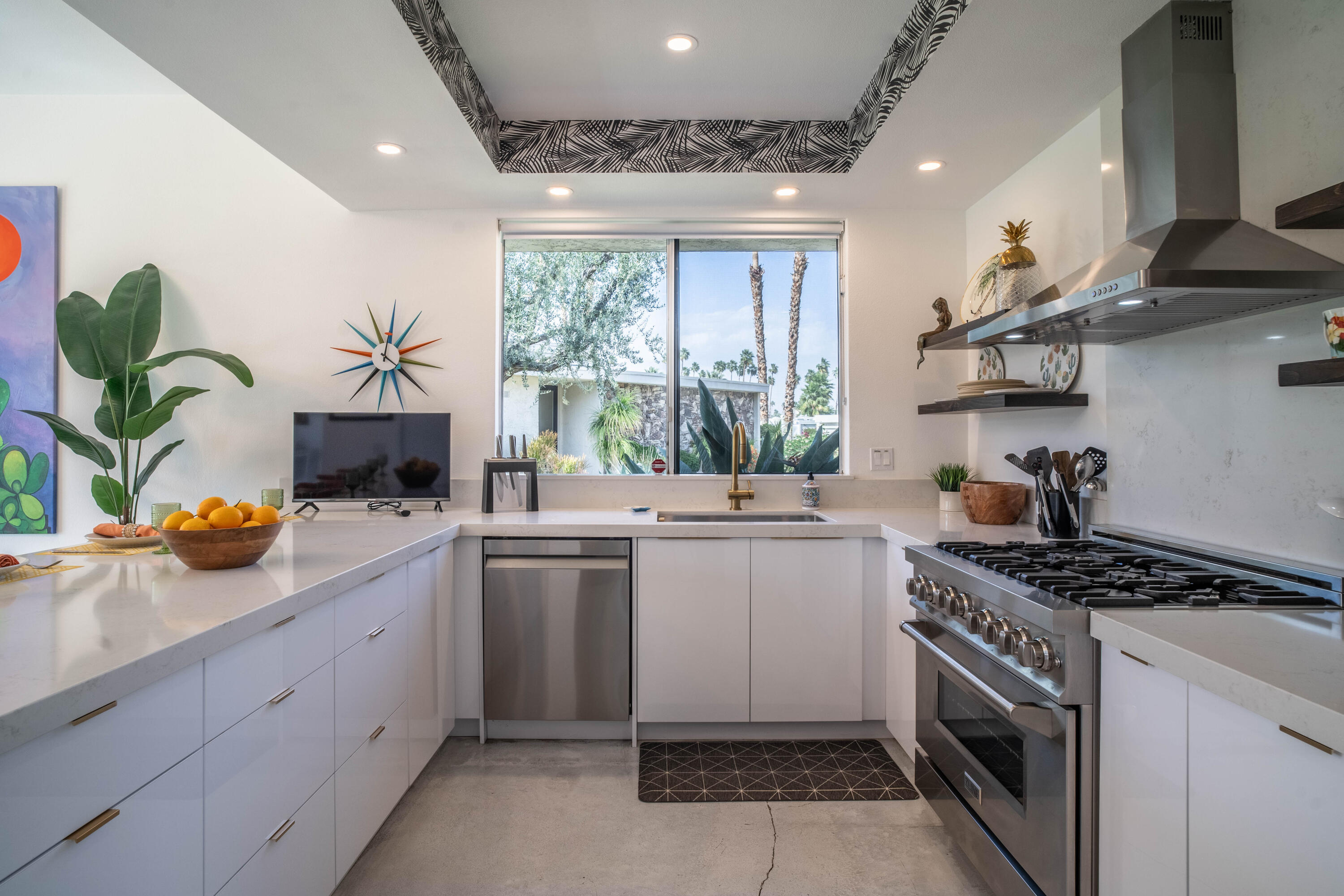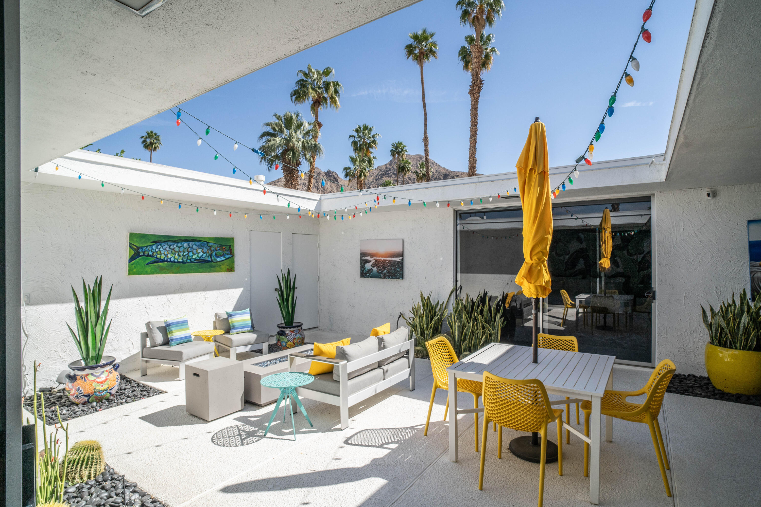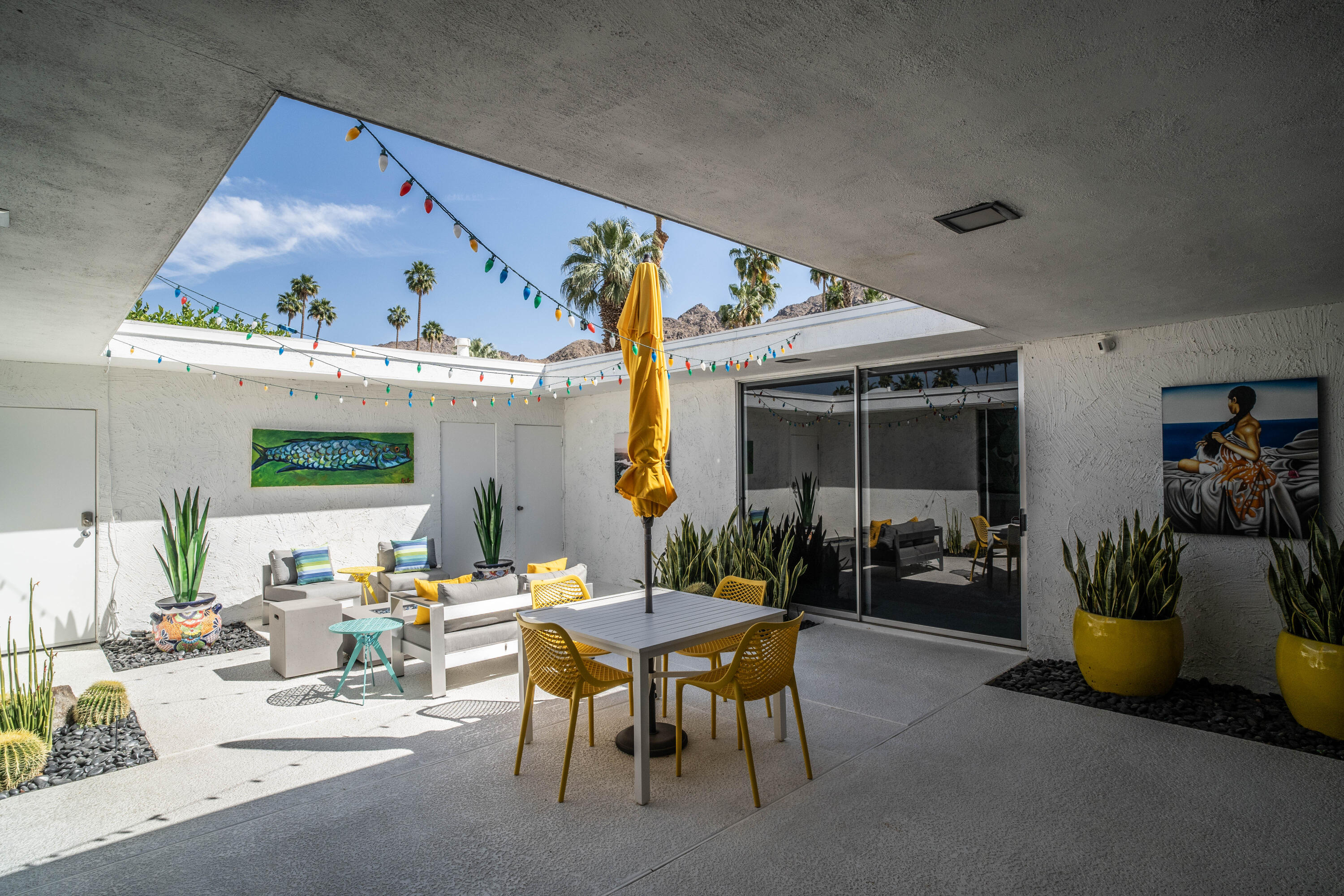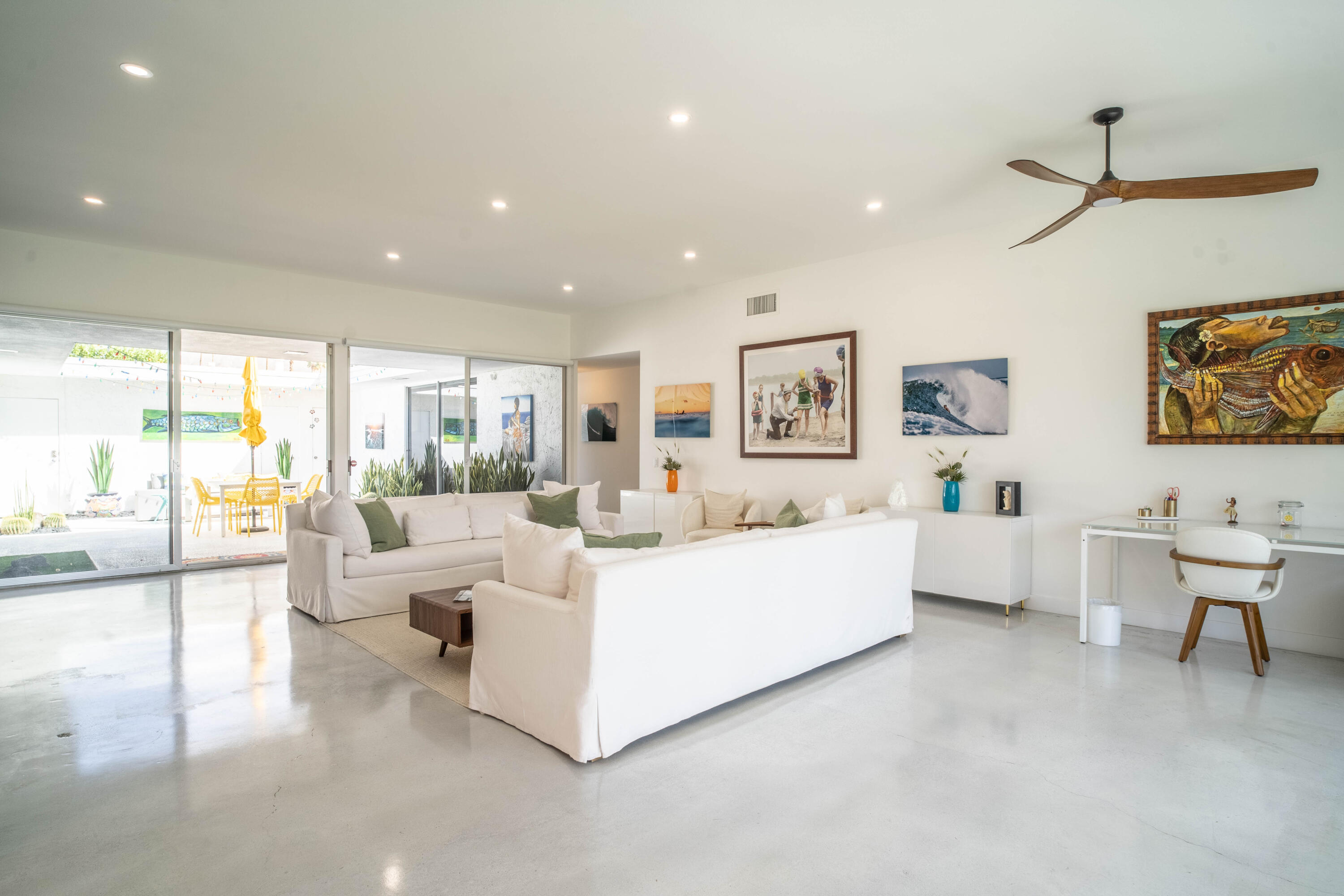 Stunning remodeled William Krisel-designed Mid-Centry Modern Indian Wells Villa located within the highly-sought Sandpiper Community at Indian Wells Country Club. This condo has been tastefully updated to restore the mid-century vibe and honor the history that inspired the allure of desert living. A true masterpiece combining the past with modern luxuries and amenities. The over-sized living room has been enhanced with a floor-to-ceiling stone fireplace and custom lighting updates. The sleek kitchen is complete with stainless steel appliances, quartz countertops, a breakfast bar, custom cabinetry and has been opened to the dining room. Stained & polished concrete flooring blend the spaces throughout the home seamlessly. All bedrooms have ensuite baths, large walk-in closets and open to either the atrium or rear covered patio. The center atrium provides beautiful natural light to the entire floor plan and offers private outdoor gathering space. 2-car garage PLUS golf-cart space with ample storage space. Newer HVAC, on-demand hot water heater and new doors throughout the interior (raised to 8'}. The Laundry room was updated and redone. Located in close proximity to the clubhouse on a lush greenbelt overlooking the community pool surrounded by swaying palm trees.Interested in this Listing?