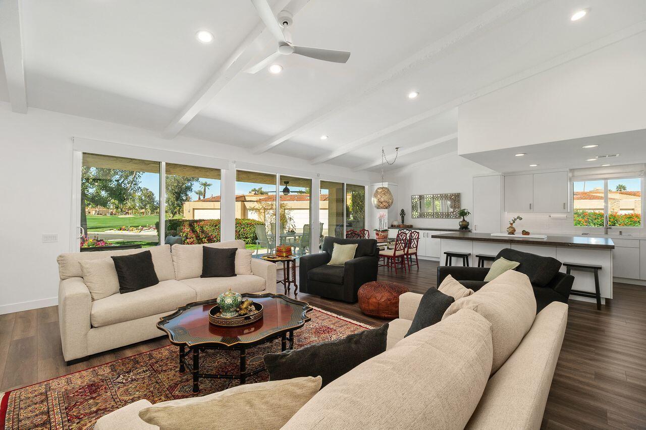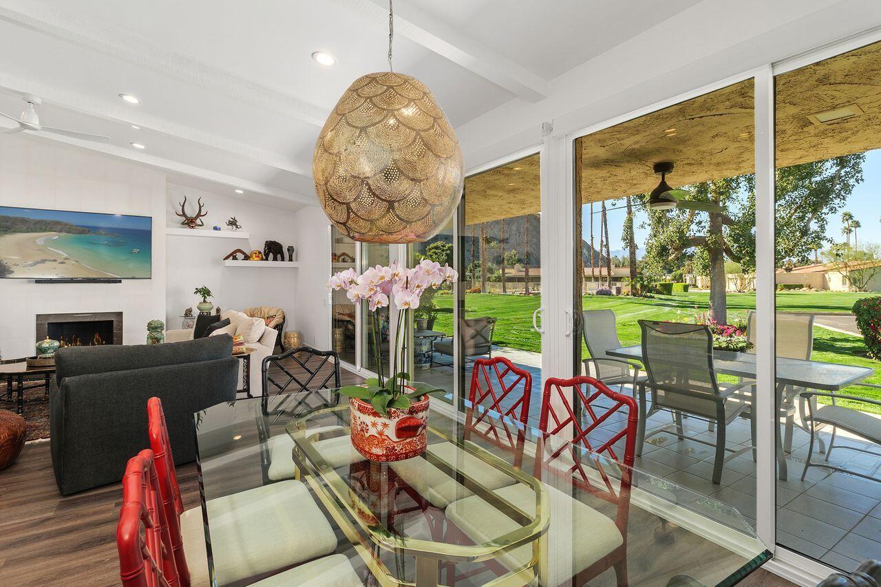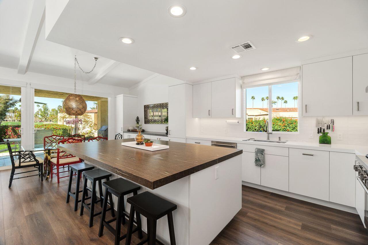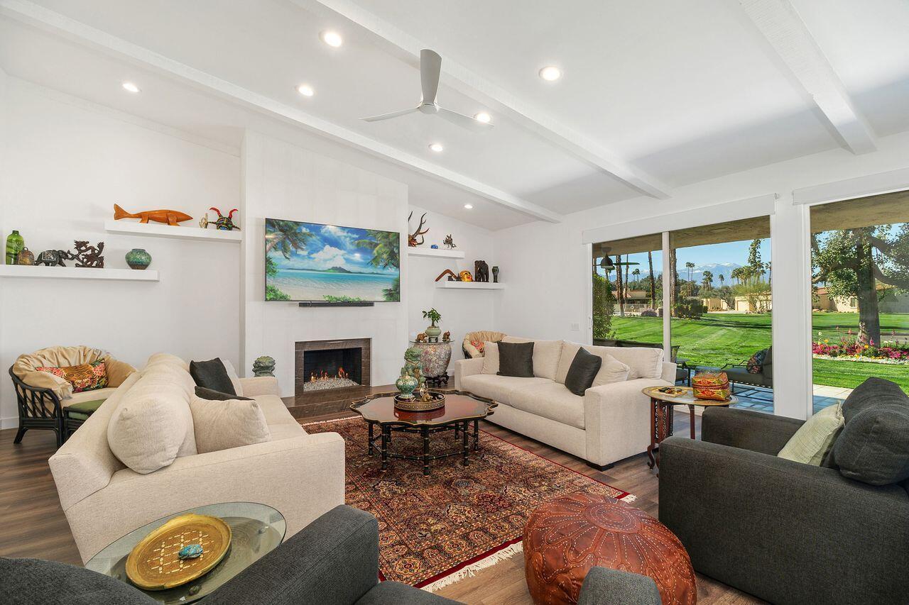 Experience the ultimate desert lifestyle with this exquisitely reimagined 2,008 SF, 2-bedroom, 2-bathroom condo located in Indian Wells Country Club. This luxurious condo offers magnificent views of the mountains, golf course, and community pool, making it an ideal retreat for year-round indoor/outdoor living. The open-concept kitchen is a chef's dream, featuring a full suite of Thermador appliances, including a built-in counter-depth fridge, gas range, electric oven, dishwasher, microwave drawer, and two beverage drawers. The kitchen seamlessly flows into the spacious living and dining areas with vaulted wood-beam ceilings and a cozy stone fireplace. Both generously sized bedrooms open to a private enclosed atrium, providing a tranquil escape. The bedrooms also offer direct access to the 2-car garage plus golf cart garage. Features include waterproof laminate flooring, marble bathroom floors, Digitalart Bianco glazed porcelain bathroom walls (crafted in Italy), Brizo by Delta bathroom faucets and fixtures, and brand new Madison sliding doors and windows. Other features include new electrical wiring, new HVAC system and ducting installed in 2021, and a gas line to the back patio for convenient BBQs. This condo combines elegance, comfort, and modern sophistication, making it the perfect home for those seeking the finest in desert living. As a resident of Indian Wells, you'll enjoy exclusive benefits, including 20% discounts on food and spa services, as well as reduced rates for golfing at the renowned Indian Wells Golf Resort.Interested in this Listing?
