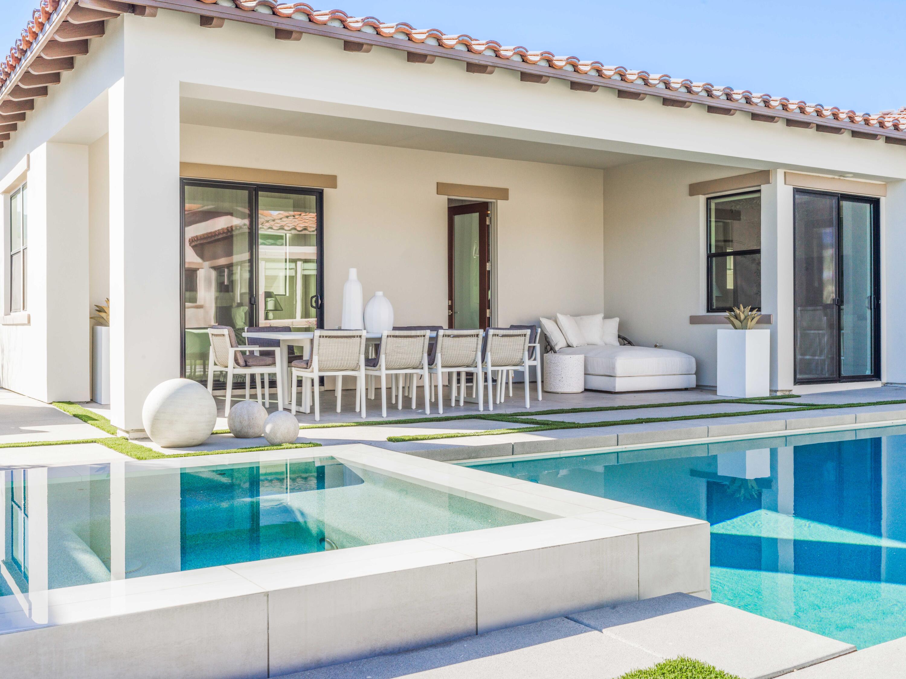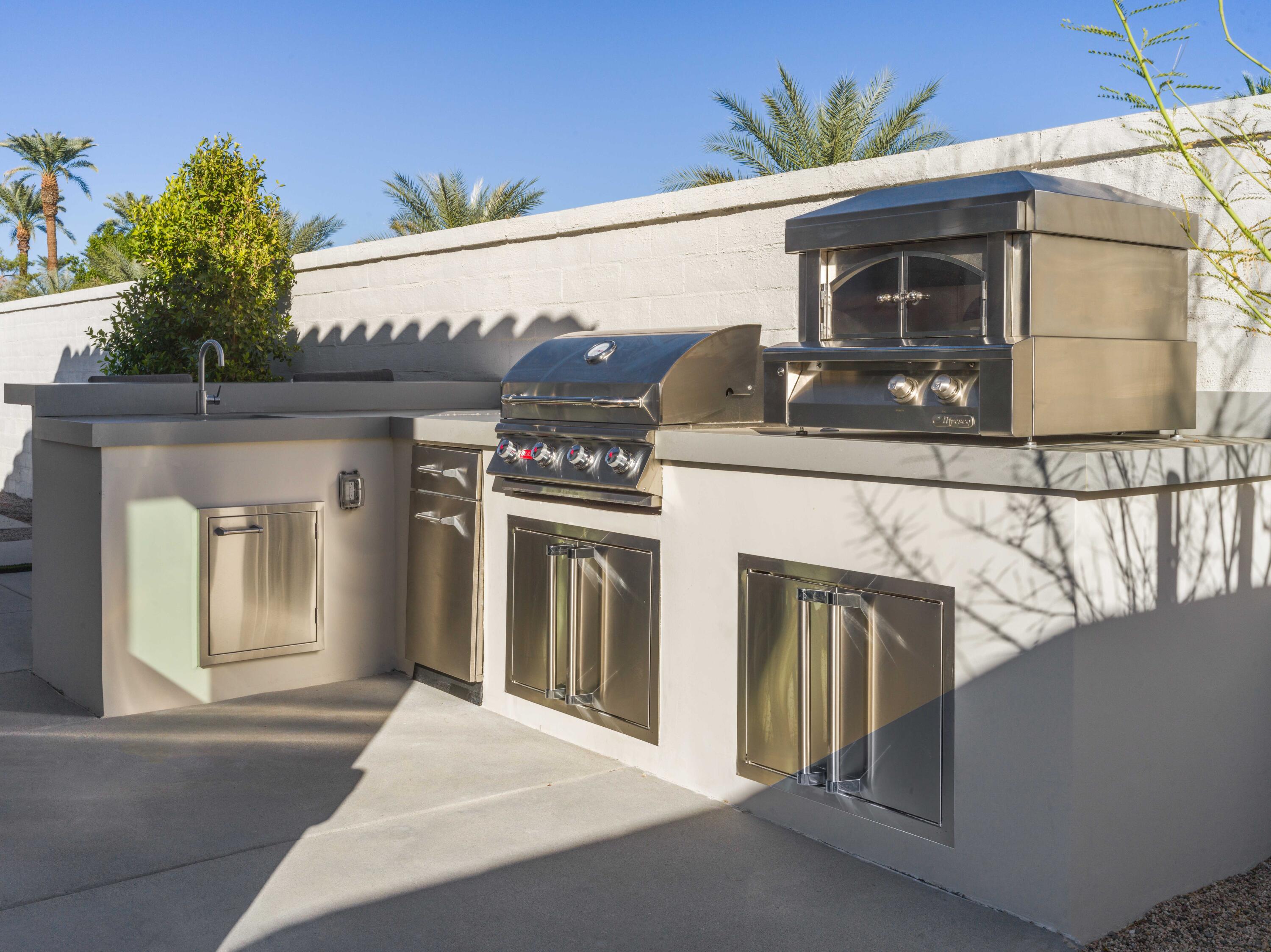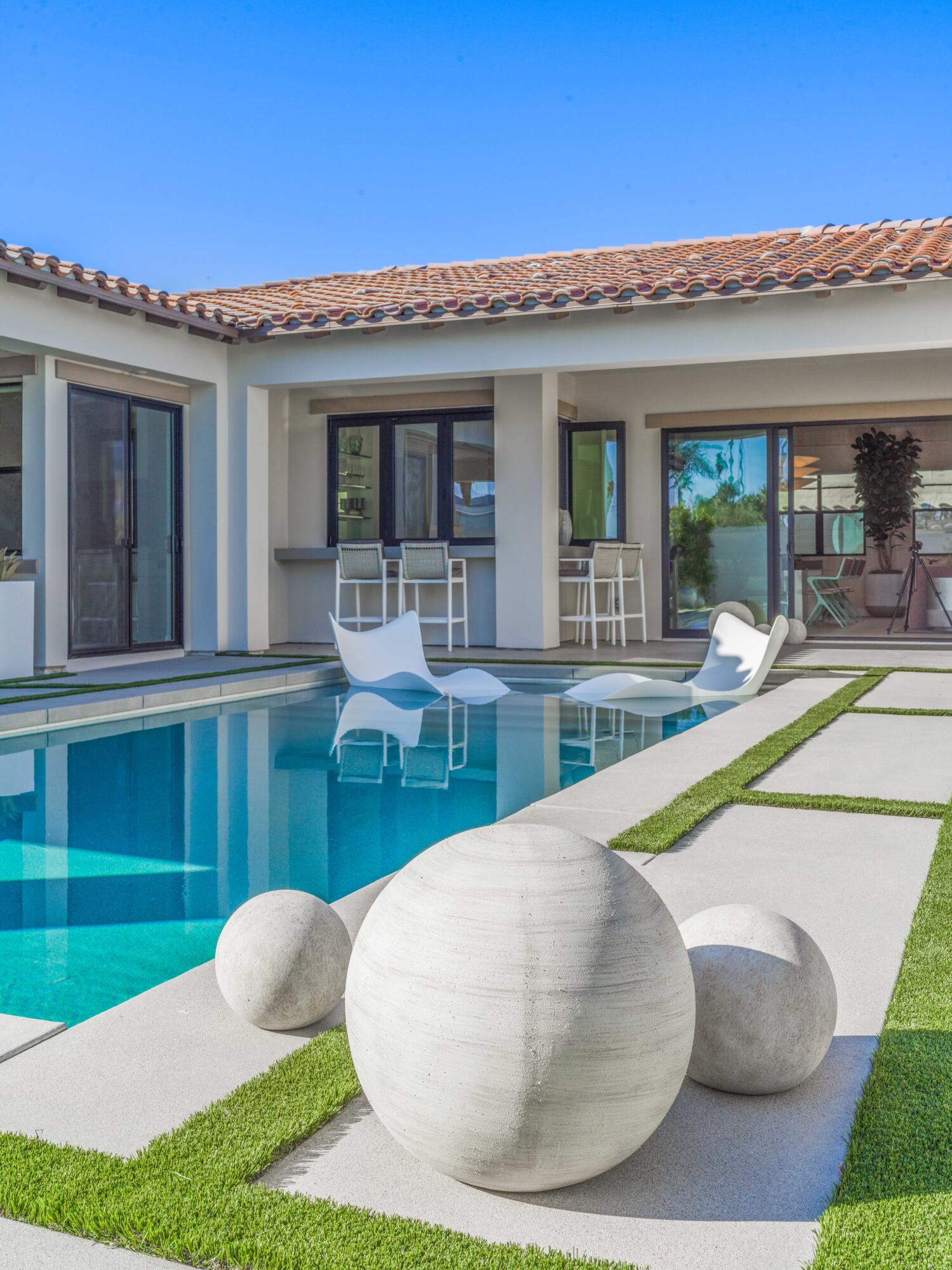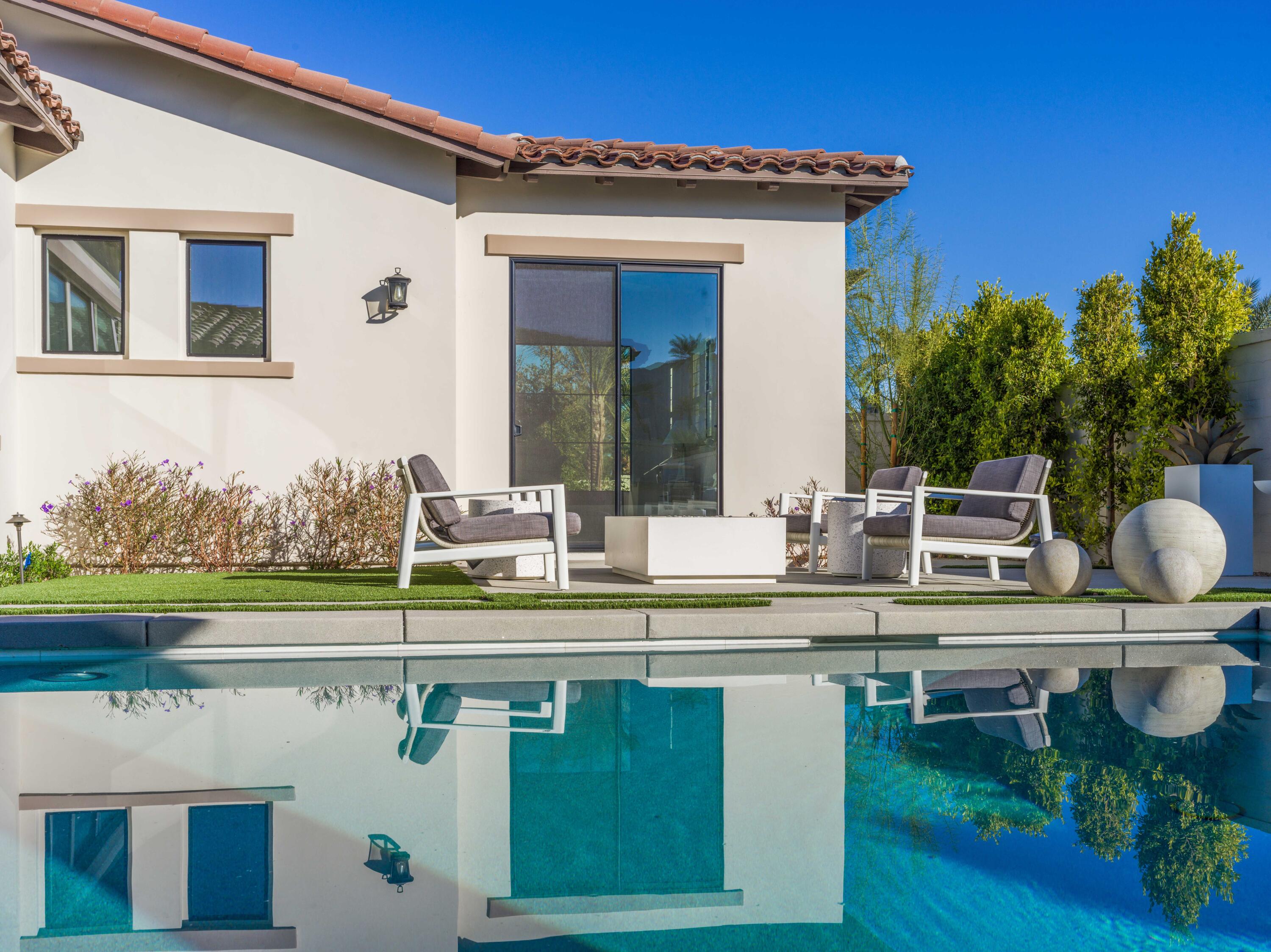Discover your ultimate desert oasis, built in 2023 with luxurious design and impeccable attention to detail. This stunning home features soaring 12-ft ceilings and light-filled spaces throughout. The chef's gourmet kitchen is a dream, outfitted with Dacor appliances, a Sub-Zero refrigerator, two ovens, a six-burner stove, dishwasher, and a butler's pantry. Designer furnishings, including a custom dining table for 10, elevate the space further. The home offers indoor-outdoor living at its finest, with a large pocket door that seamlessly connects the spacious interior to the private backyard. Entertain effortlessly with a custom pool and spa, outdoor kitchen featuring a pizza oven, a fire pit, and alfresco dining for 10. The attached casita, complete with its own private entrance, makes for a perfect guest retreat. Additional highlights include a dedicated office, two spacious guest suites with en-suites, dual walk-in closets with built-ins in the primary suite, a private security system, and a two-car garage. Designer landscaping enhances the private setting, while the modern amenities like smart TVs throughout ensure convenience and style. A true masterpiece of desert living awaits!Interested in this Listing?