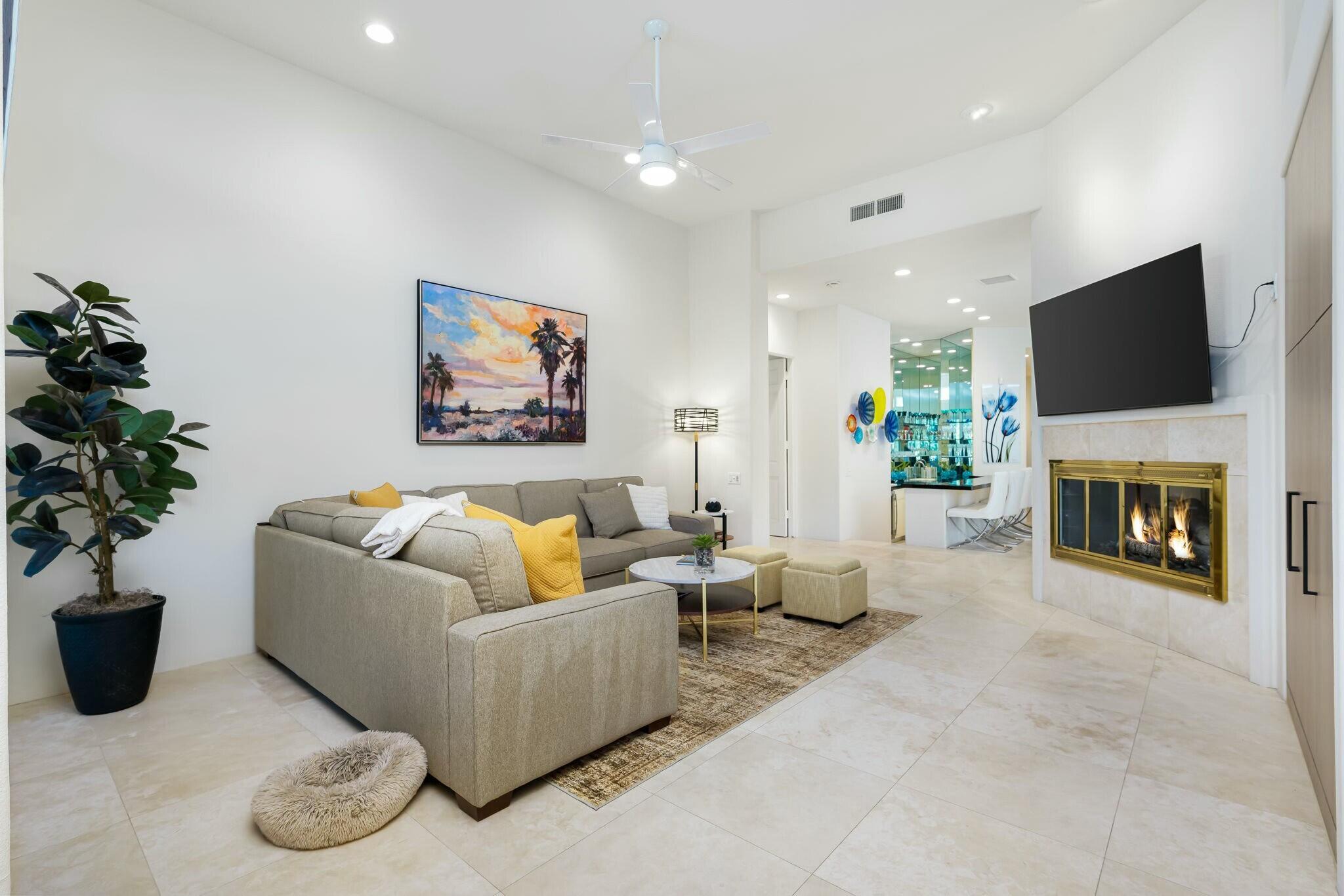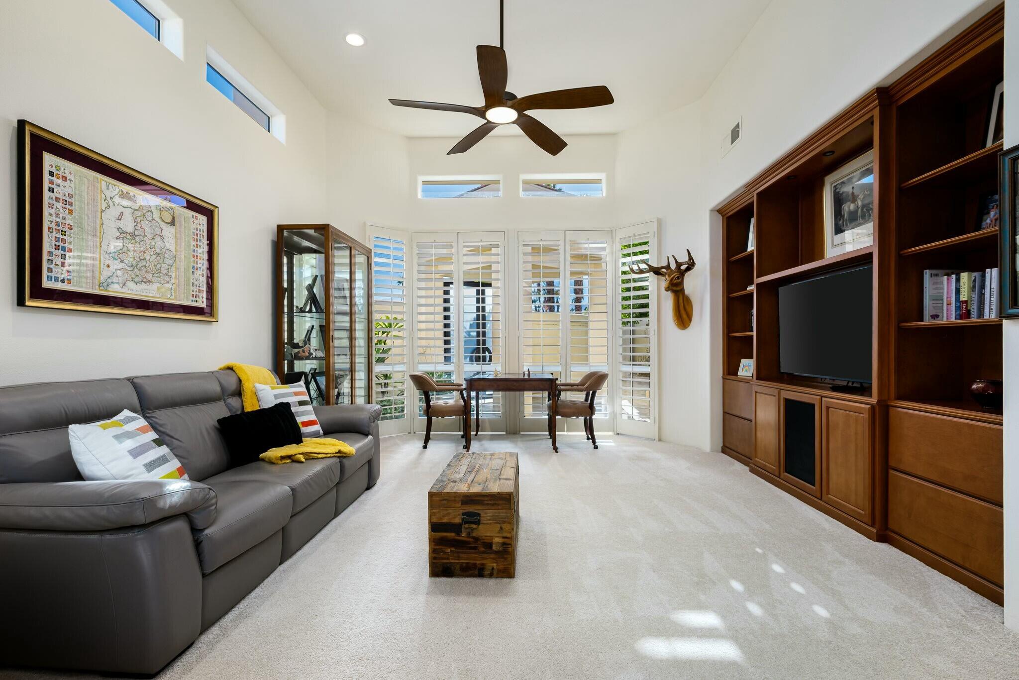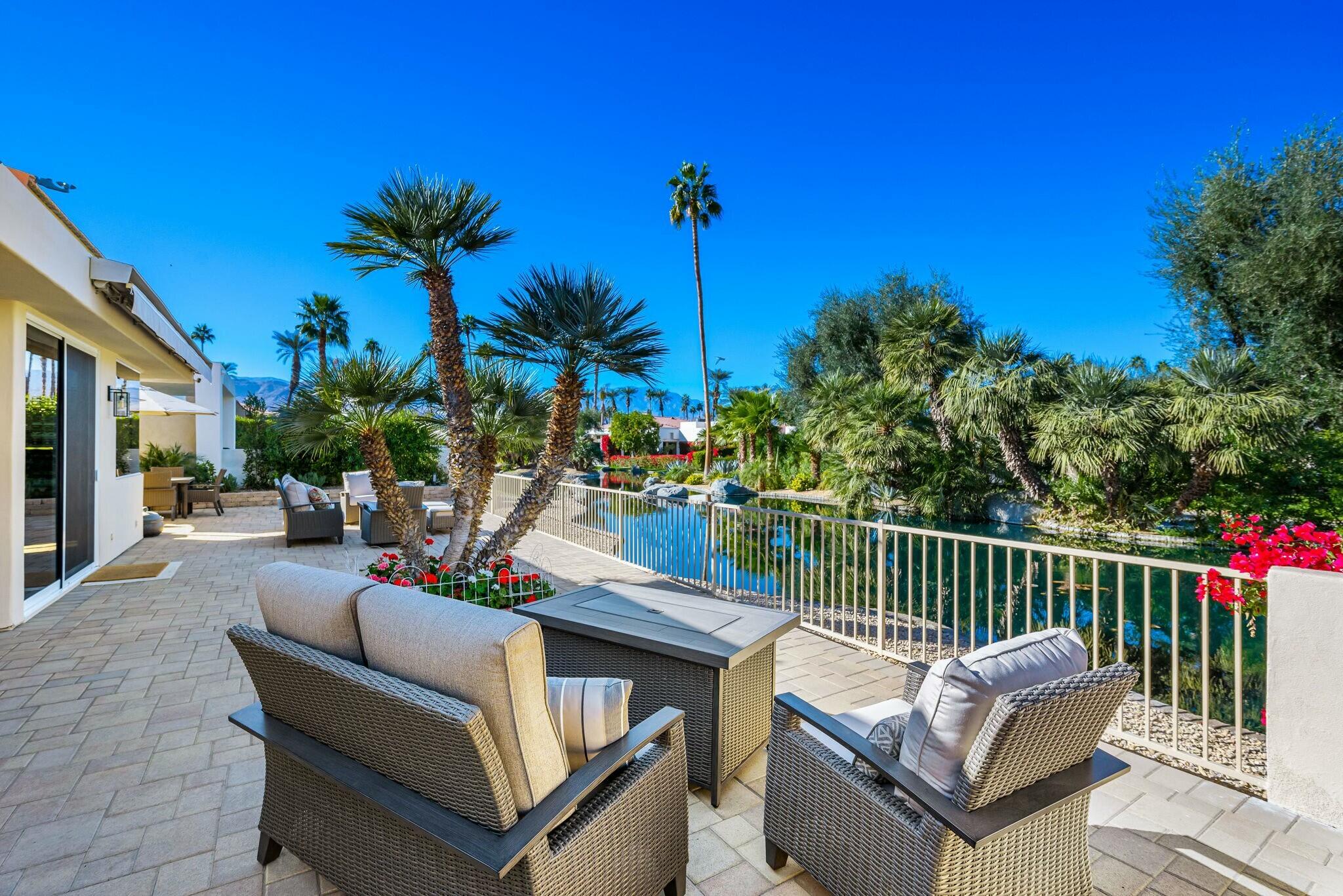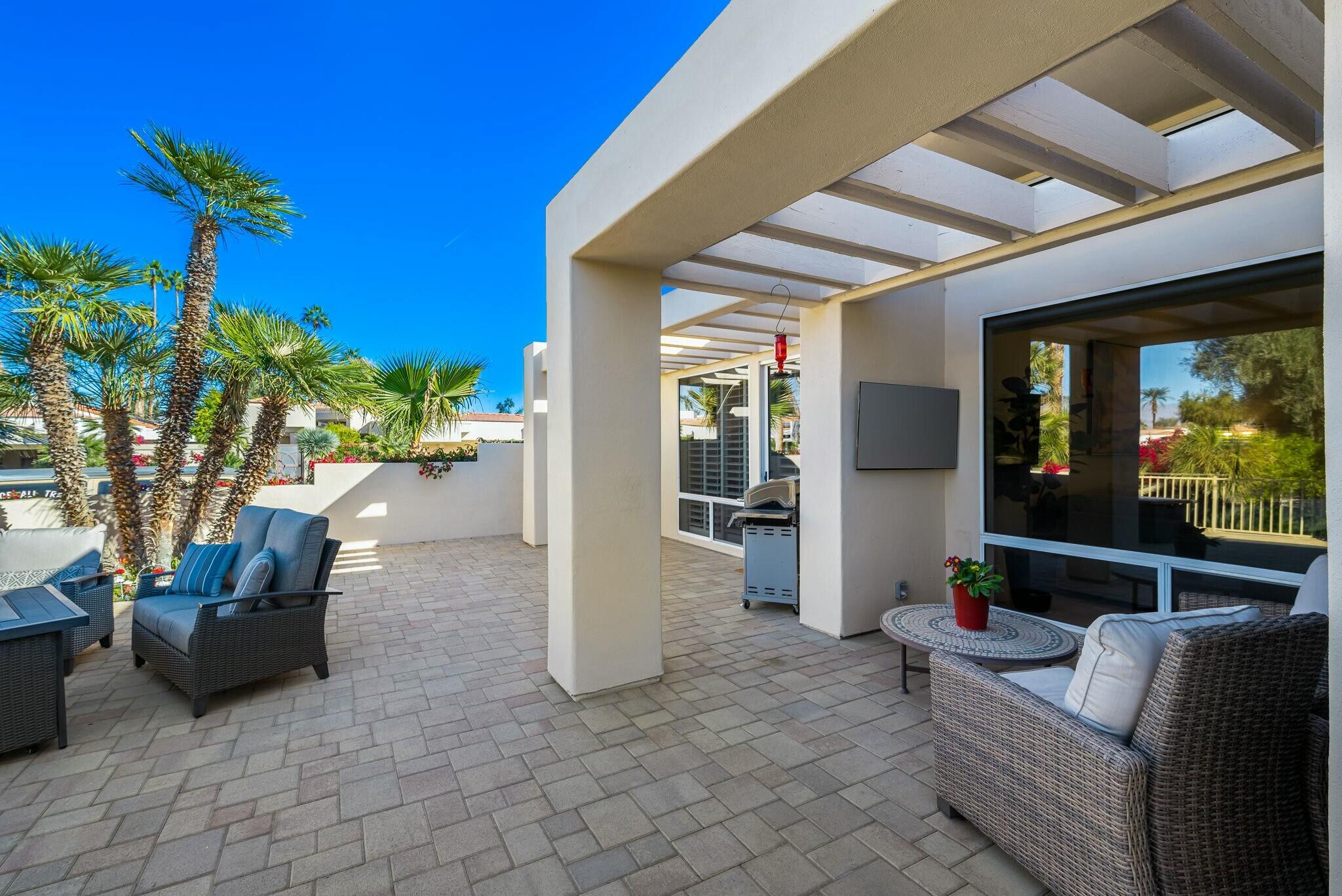 Lease Available for $4500 per month June til October. LEASED Nov- May 2026 This lovely Furnished 3 Bedroom Home is situated in a cul-de-sac within the prestigious community of Desert Horizons Country Club. With only one neighboring home, the peaceful surroundings enhance the allure of this property. Upon entering, you are greeted by a private pavered Courtyard and a beautiful landscaped yard. This custom Doral floor plan has an Open-concept layout, enhanced by a striking double-sided fireplace, which is a focal point for both the Living Room and Family Room. The Family Room offers a large Flat Screen TV and Sofa. For those who work from home, the Office features custom built-in cabinets and a slider that leads out to a 3rd Patio area and large side yard. The Primary Suite boasts a King Bed, spa-style bath with dual vanities and a spacious walk-in closet. The comfortable 2nd Bedroom offers a Queen Bed with an en-suite bath and the versatile 3rd bedroom which serves as a Den has a Flat Screen TV, enhancing the home's functionality. Step outside to the patio with TV, where you will enjoy stunning evening sunsets overlooking the serene pond view, all while listening to the soothing sounds of a waterfall. In addition, there is an impressive 1500 sq ft of enclosed landscaped yard. Completing this exceptional home is a 2-car Garage w/ Golf Cart Garage. Community Pool & Spa are just steps away. Cleaning Service included every 2 weeks. Golf Cart Available with proof of insurance.Interested in this Listing?