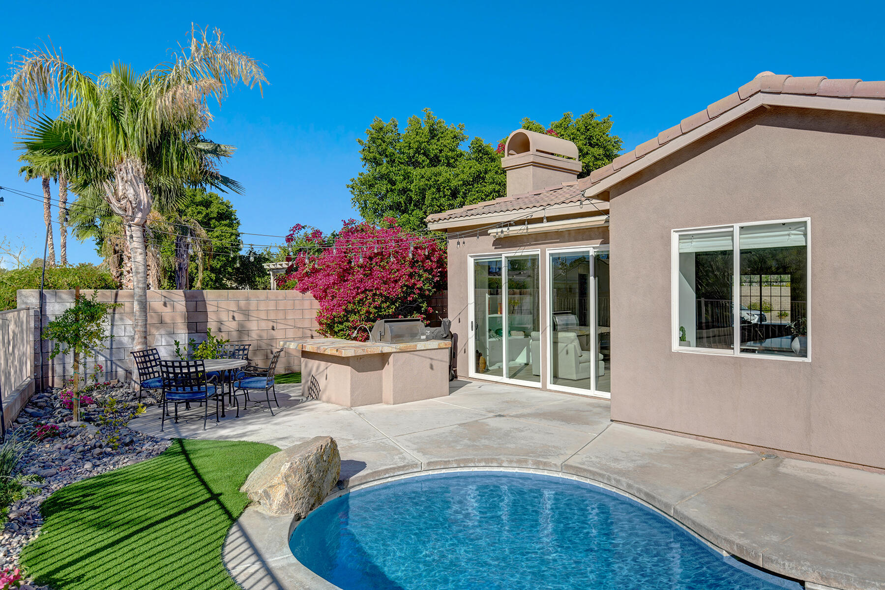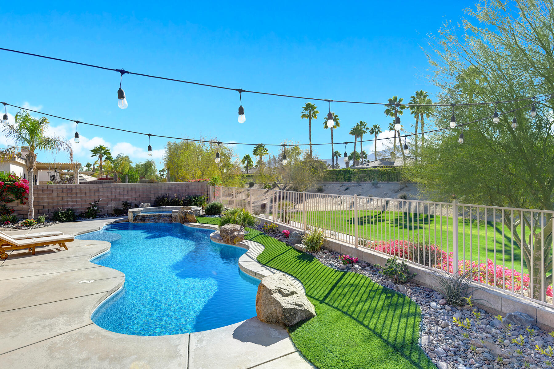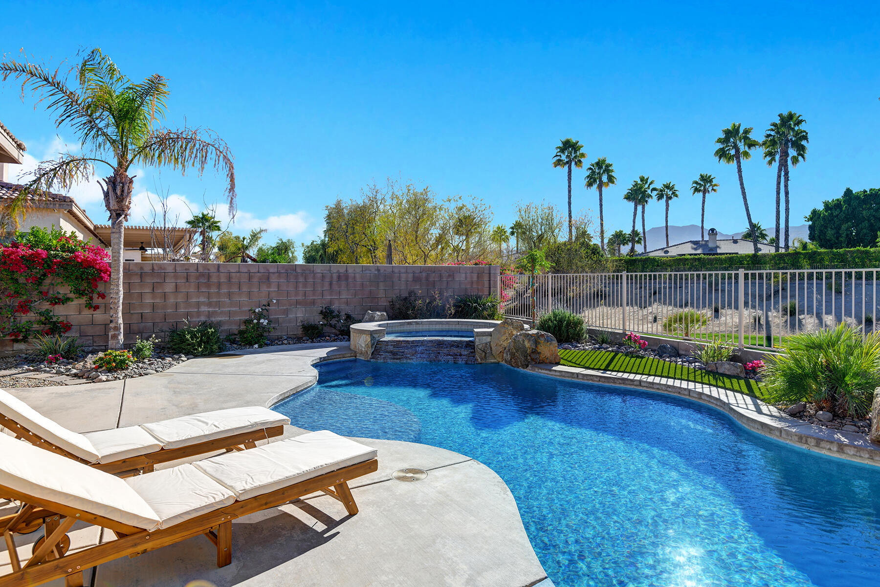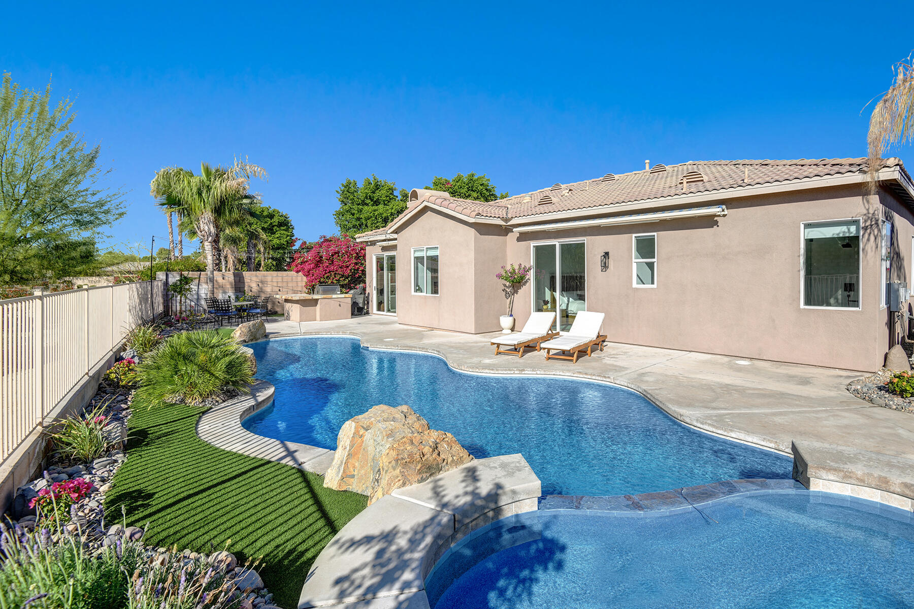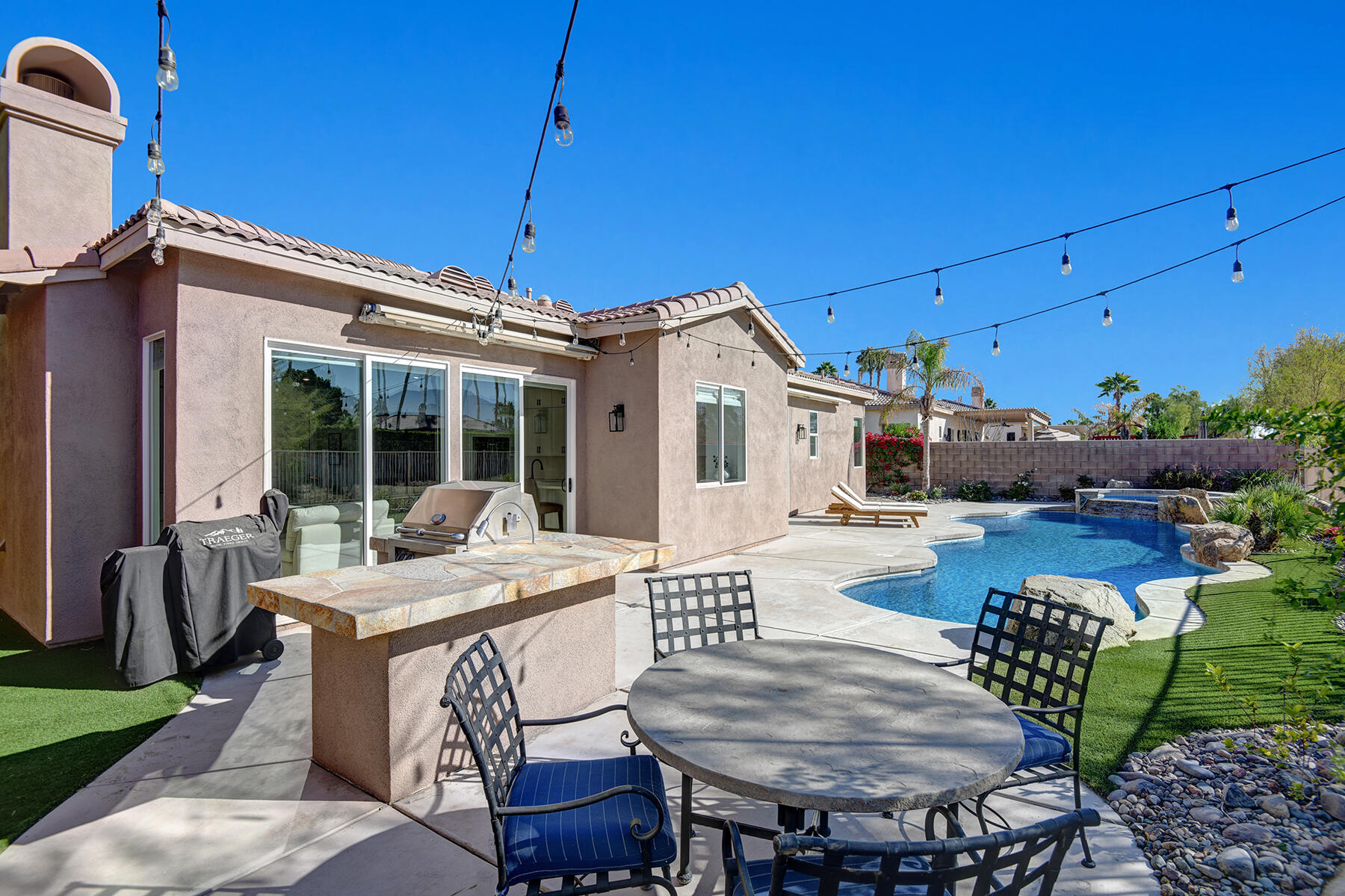 Welcome to 43179 Corte Del Oro, the perfect home for the modern family! Having undergone an extensive renovation, this home has absolutely everything today's families need to feel true comfort through elevated finishes. Step inside to discover Truwood plank ceramic flooring and a chef's kitchen designed for culinary enthusiasts. The kitchen is equipped with a KitchenAid Smart Range, soft close cabinets, quartz countertops, under-cabinet lighting, as well as a coffee bar with a wine refrigerator, and island seating. The open living area flows effortlessly into a private backyard oasis, featuring a salt-water pool, spa, and built-in barbecue. Enjoy stunning mountain views and tranquility from your elevated position to the adjacent park. The artificial turf side yard is perfect for pets, and an integrated sound system enhances your entertainment experience. The primary suite offers a spa-like bathroom with a freestanding tub inside a custom shower and an expanded walk-in closet. A versatile 5th bedroom serves as an ideal home office or additional sleeping space. Smart Home technology includes a washer/dryer, range, garage door, and lighting for ultimate convenience. The home also includes a water-softener system. With great proximity to the Indian Wells Tennis Gardens, and some of the best local dining & entertainment options, it's an incredibly well finished home in a superb, gated community! Please call listing agent for Gate Code to enter community at (949) 939-3095.Interested in this Listing?