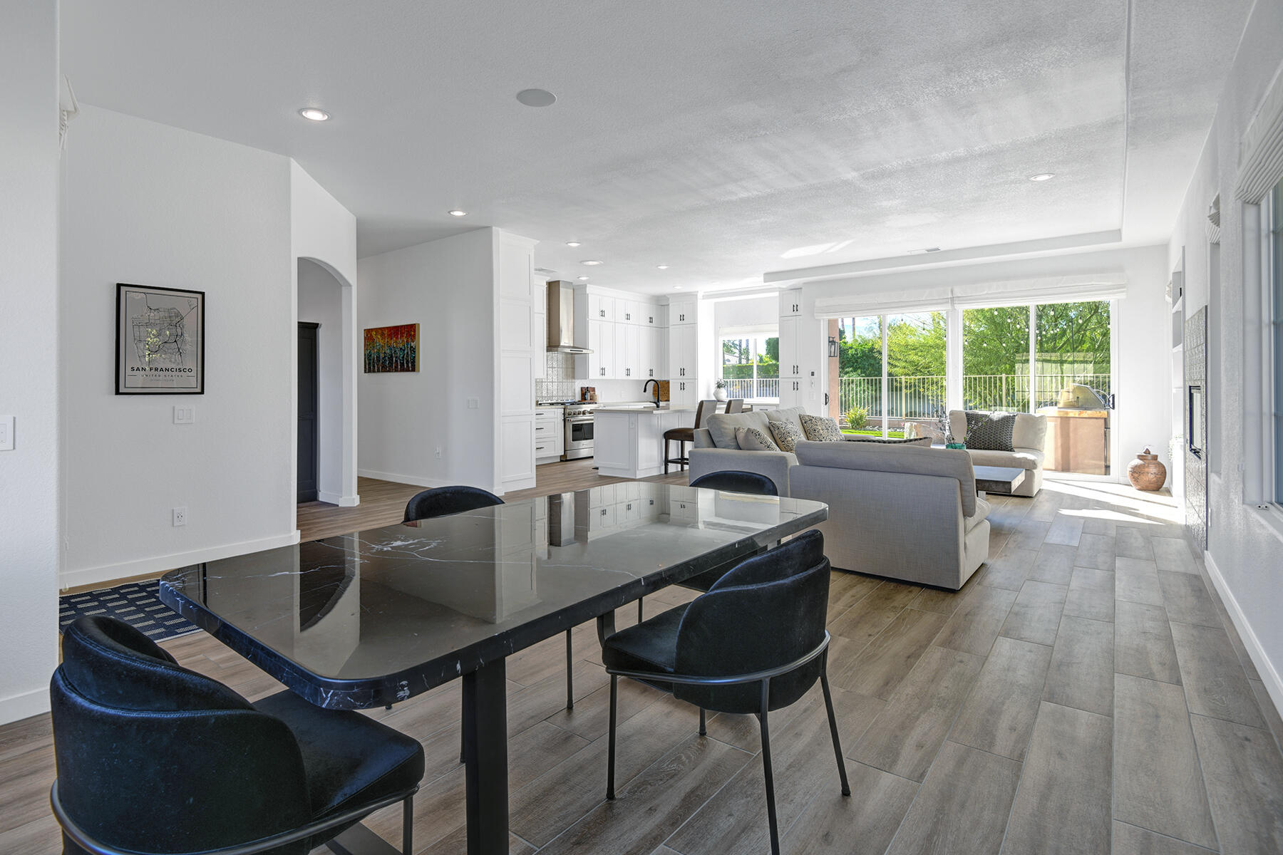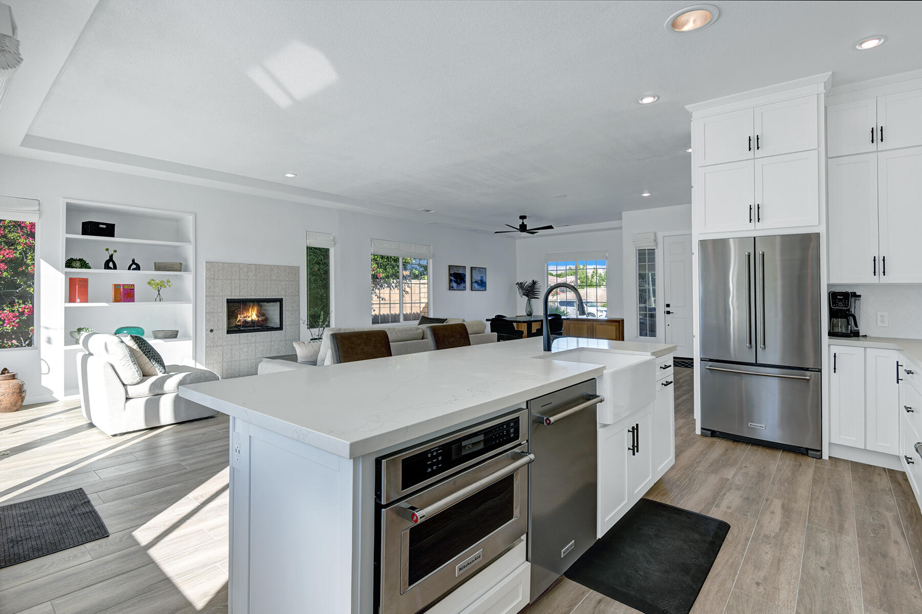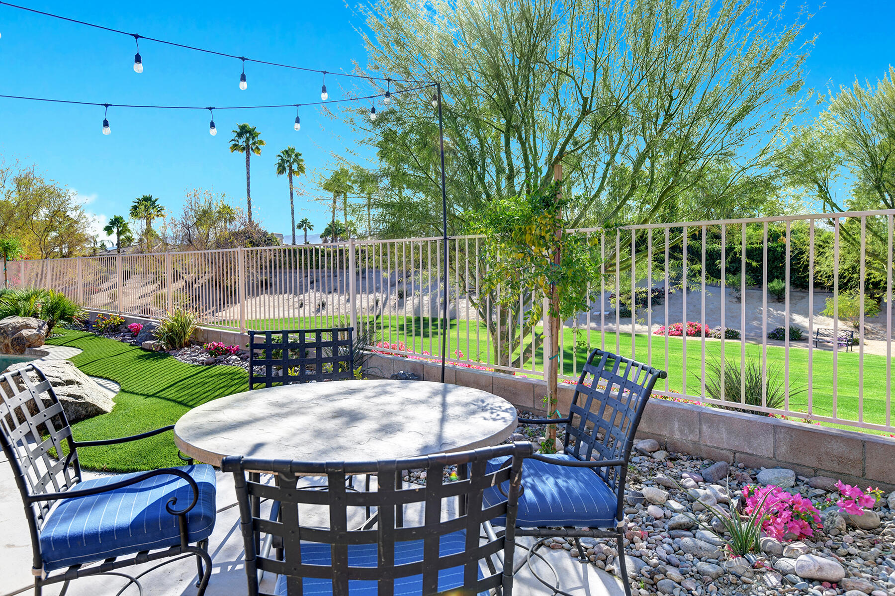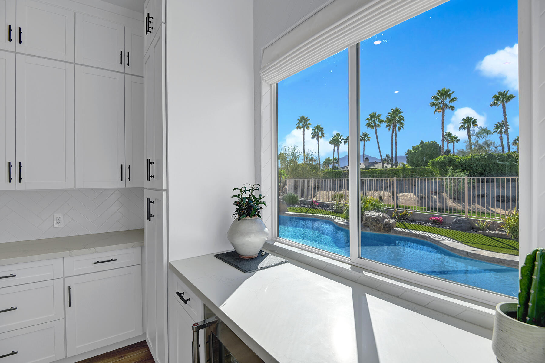 Welcome to 43179 Corte Del Oro, the perfect home for the modern family! Having undergone an extensive renovation, this home has absolutely everything today's families need to feel true comfort through elevated finishes. Step inside to discover Truwood plank ceramic flooring and a chef's kitchen designed for culinary enthusiasts. The kitchen is equipped with a KitchenAid Smart Range, soft close cabinets, quartz countertops, under-cabinet lighting, as well as a coffee bar with a wine refrigerator, and island seating. The open living area flows effortlessly into a private backyard oasis, featuring a salt-water pool, spa, and built-in barbecue. Enjoy stunning mountain views and tranquility from your elevated position to the adjacent park. The artificial turf side yard is perfect for pets, and an integrated sound system enhances your entertainment experience. The primary suite offers a spa-like bathroom with a freestanding tub inside a custom shower and an expanded walk-in closet. A versatile 5th bedroom serves as an ideal home office or additional sleeping space. Smart Home technology includes a washer/dryer, range, garage door, and lighting for ultimate convenience. The home also includes a water-softener system. With great proximity to the Indian Wells Tennis Gardens, and some of the best local dining & entertainment options, it's an incredibly well finished home in a superb, gated community! Please call listing agent for Gate Code to enter community at (949) 939-3095.Interested in this Listing?