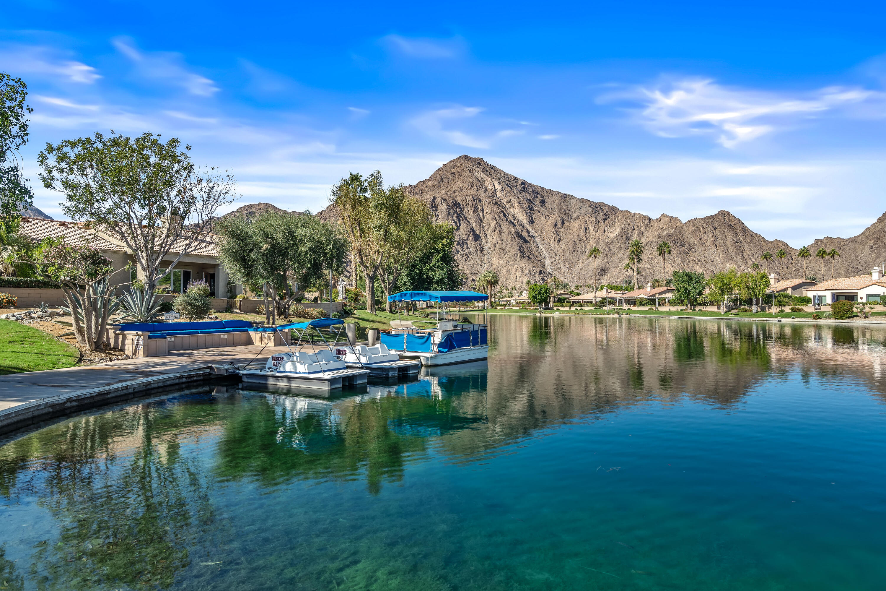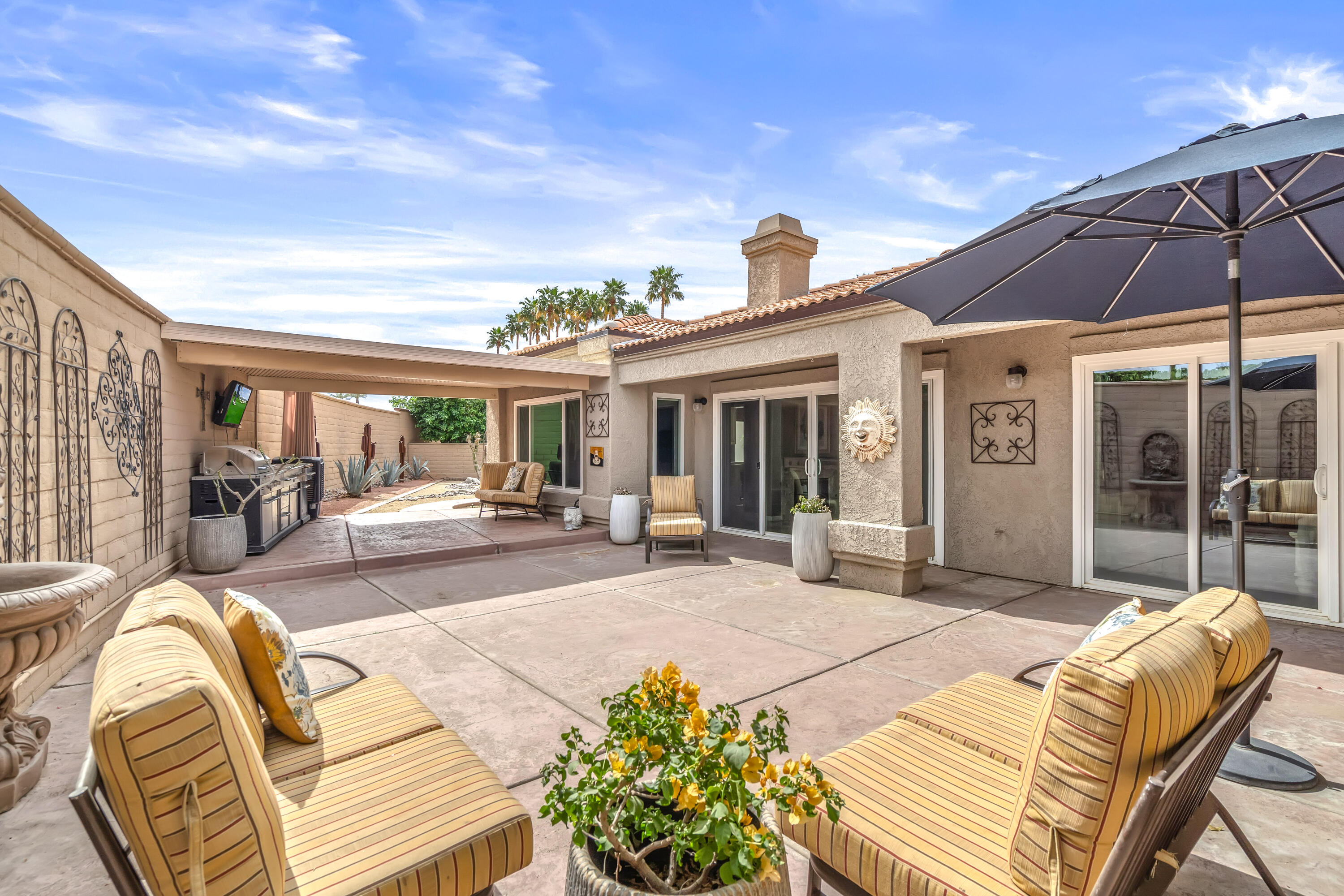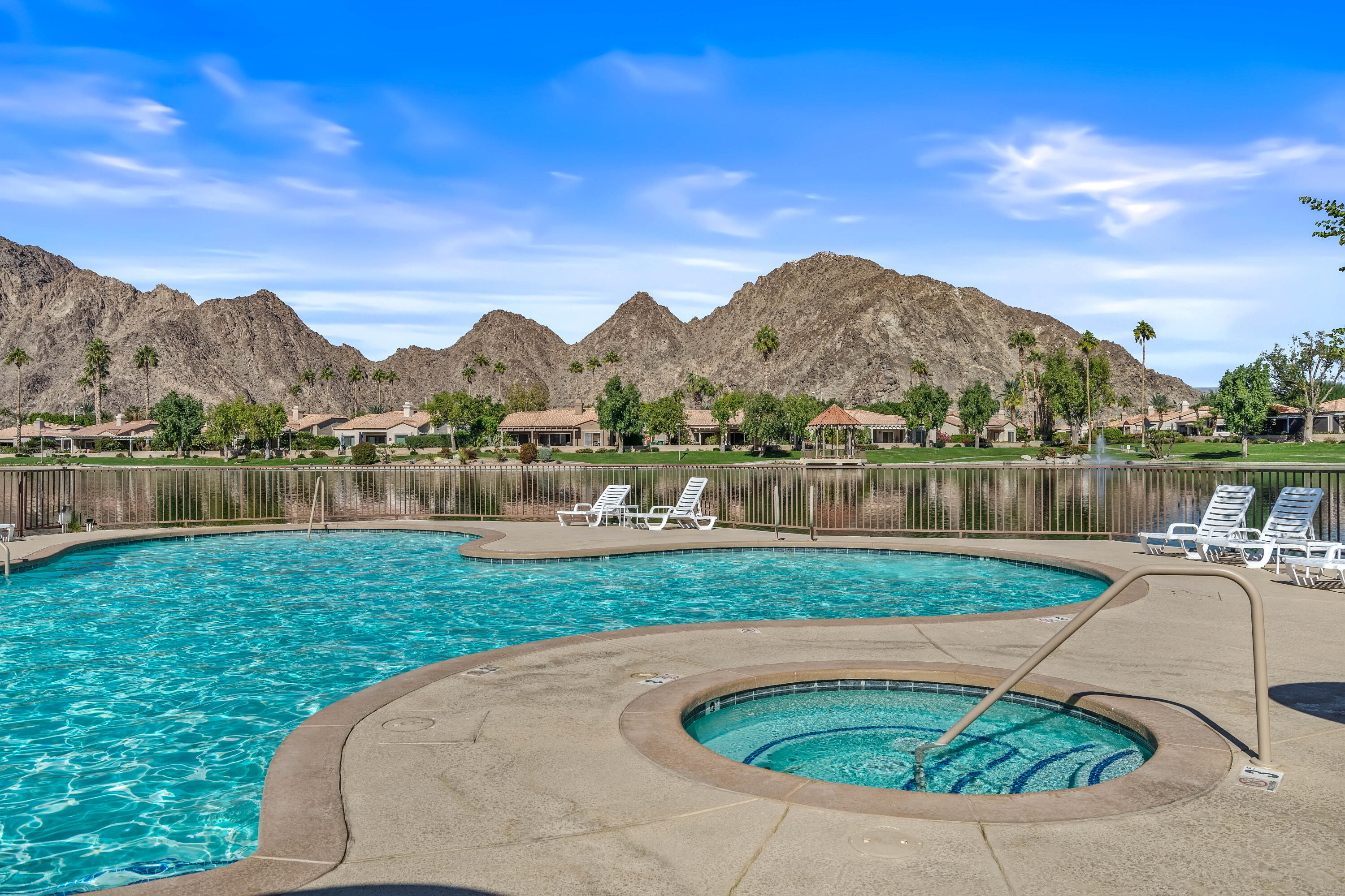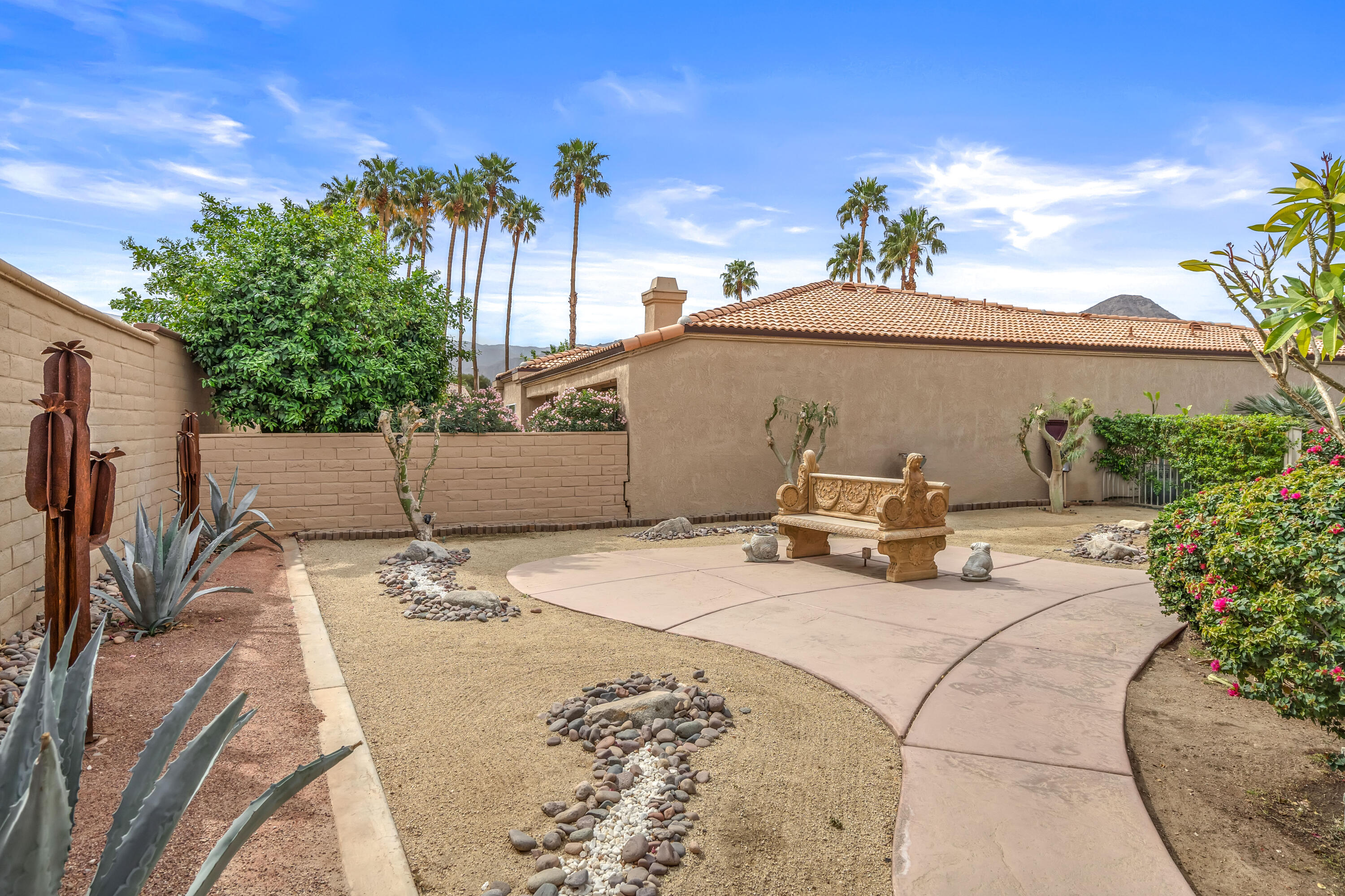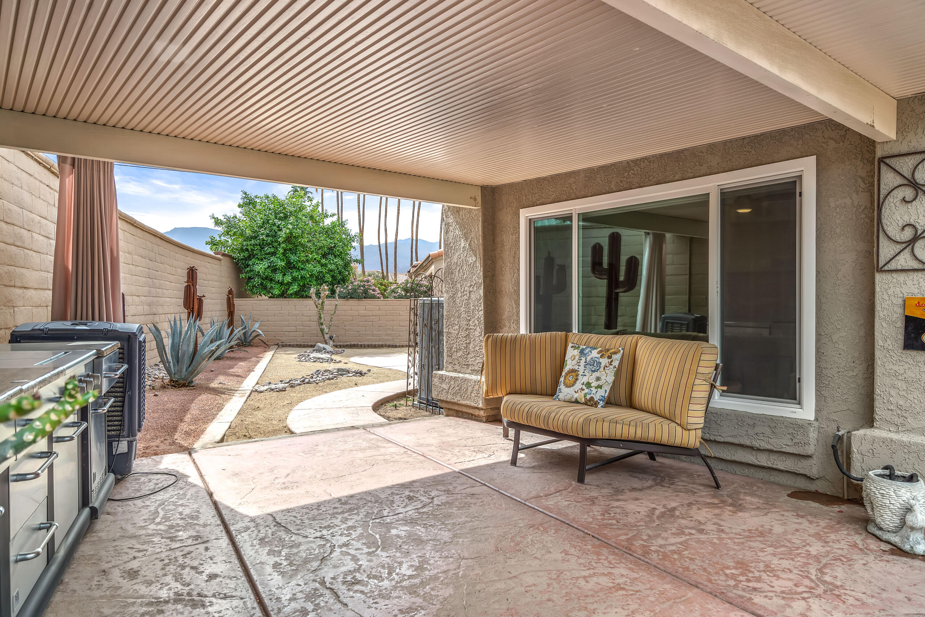 Desert Hideaway in Laguna de la Paz! Situated on a .14 acre lot, this home has an entertainers' backyard complete with BBQ/TV, portable outdoor a/c unit and expansive patio cover. There is also room to add a spool or casita with HOA approval. This spacious 1,852 sq. ft. 3bed/2bath floor plan features many upgrades including energy efficient dual pane windows, custom window shades, vinyl laminate and tile flooring, fresh paint & baseboards as well as recessed lighting throughout! The inviting living room is open to the patio and features a stone gas fireplace. Off the living room, the den/dining area wraps around the patio heading in to the light and bright kitchen featuring a cute eat-in dining area with soaring high ceilings! The primary bedroom is an oasis of it's own with double doors for privacy, a large walk in closet, a separate slider with access to the patio and a huge tiled walk-in dual shower with bench. There are two additional bedrooms on the opposite side of the home with access to a second bath which has also been remodeled, featuring a beautifully tiled shower with bench. The garage houses a Navien Tankless Water Heater for superb efficiency as well as ceiling storage racks & storage cabinets. There are so many community amenities to enjoy including 15 pools and 16 spas, a 5-acre lake with paddle boats outlined by a serene walking path, tennis, pickleball and a fitness center. Less than a mile from the famed La Quinta Resort & Spa. Enjoy close proximity to shopping and theaters as well as the IW Tennis Gardens, El Paseo, Acrisure Arena, plus hiking trails, nationally rated PGA golf resorts and more.Interested in this Listing?