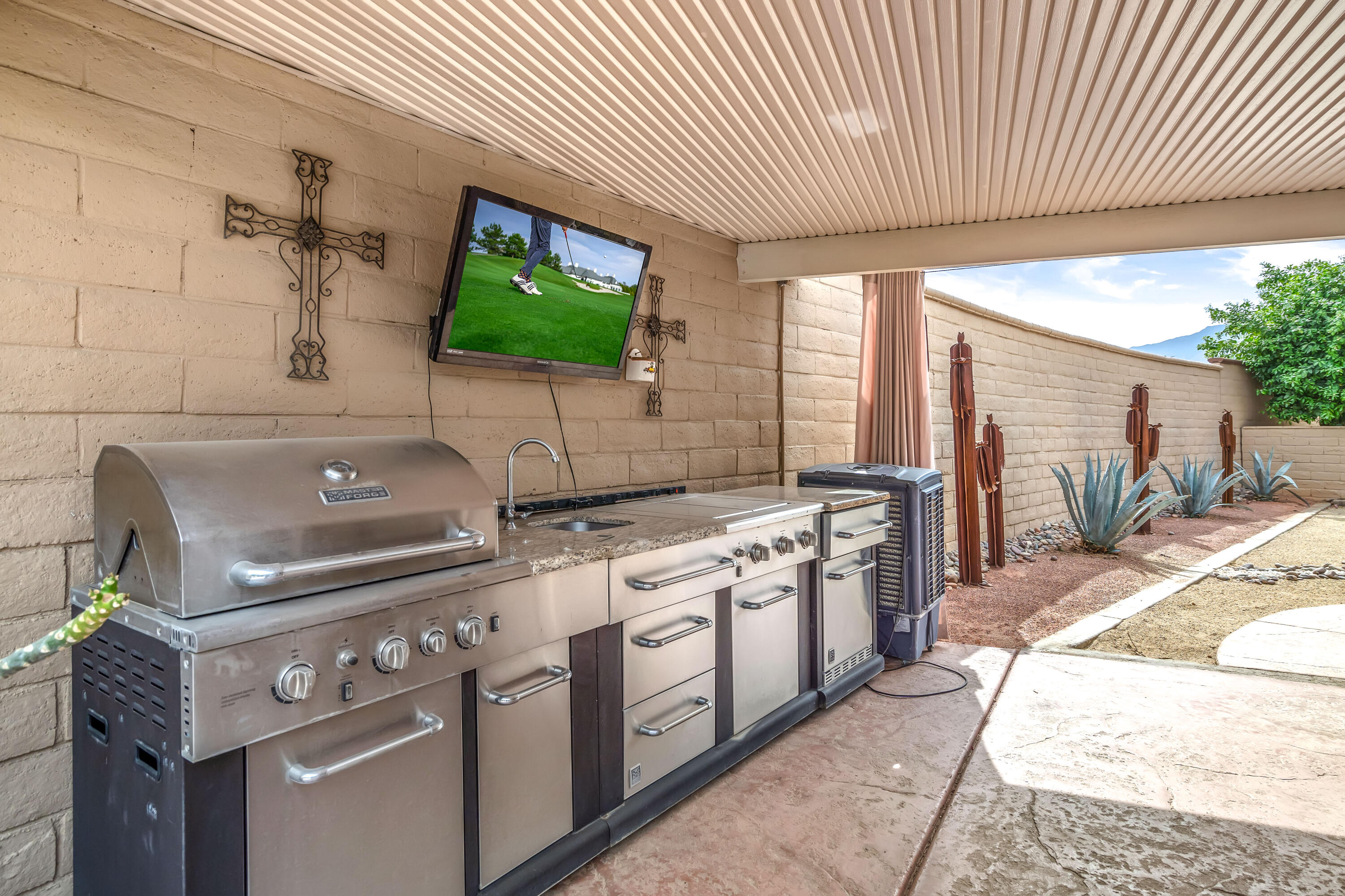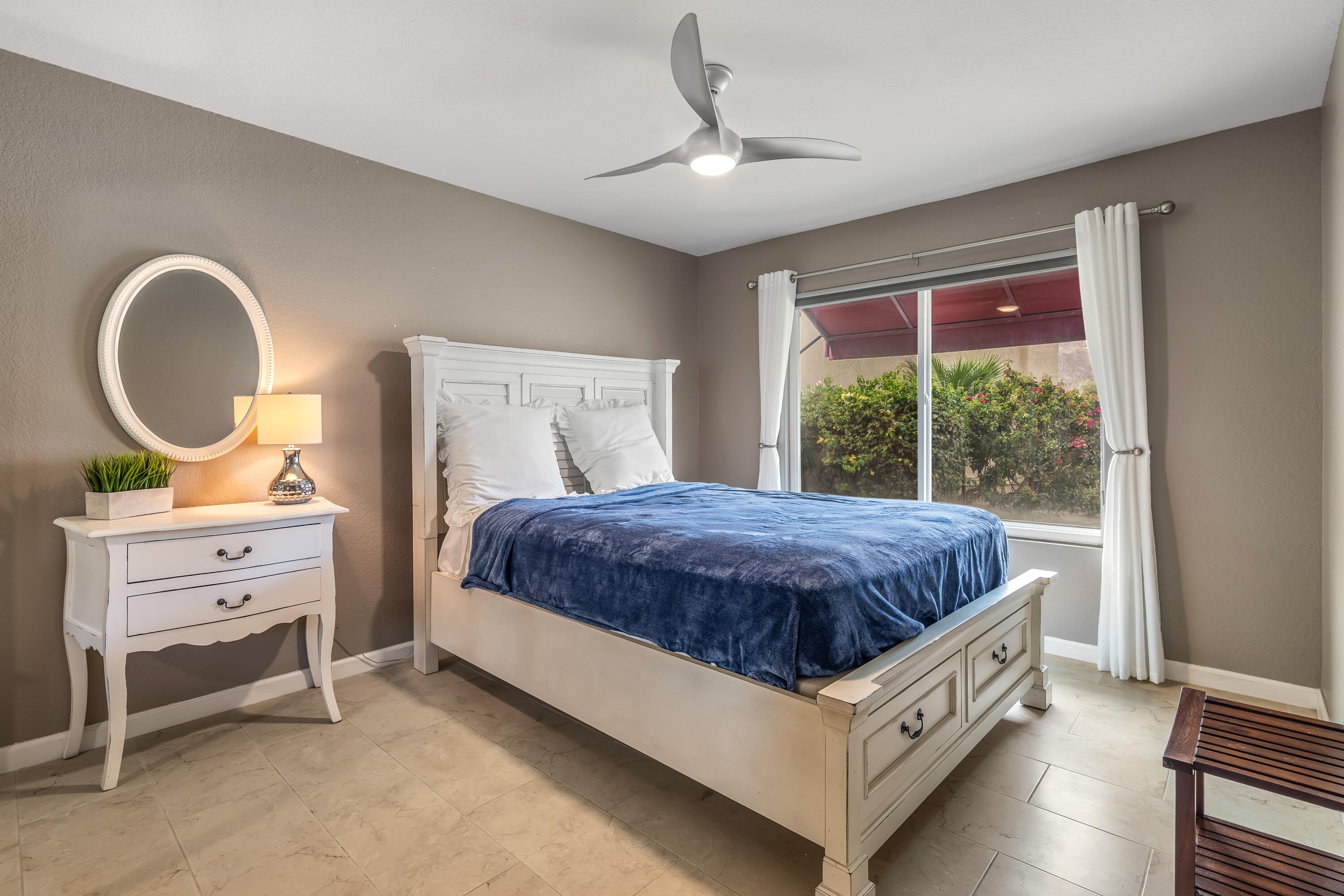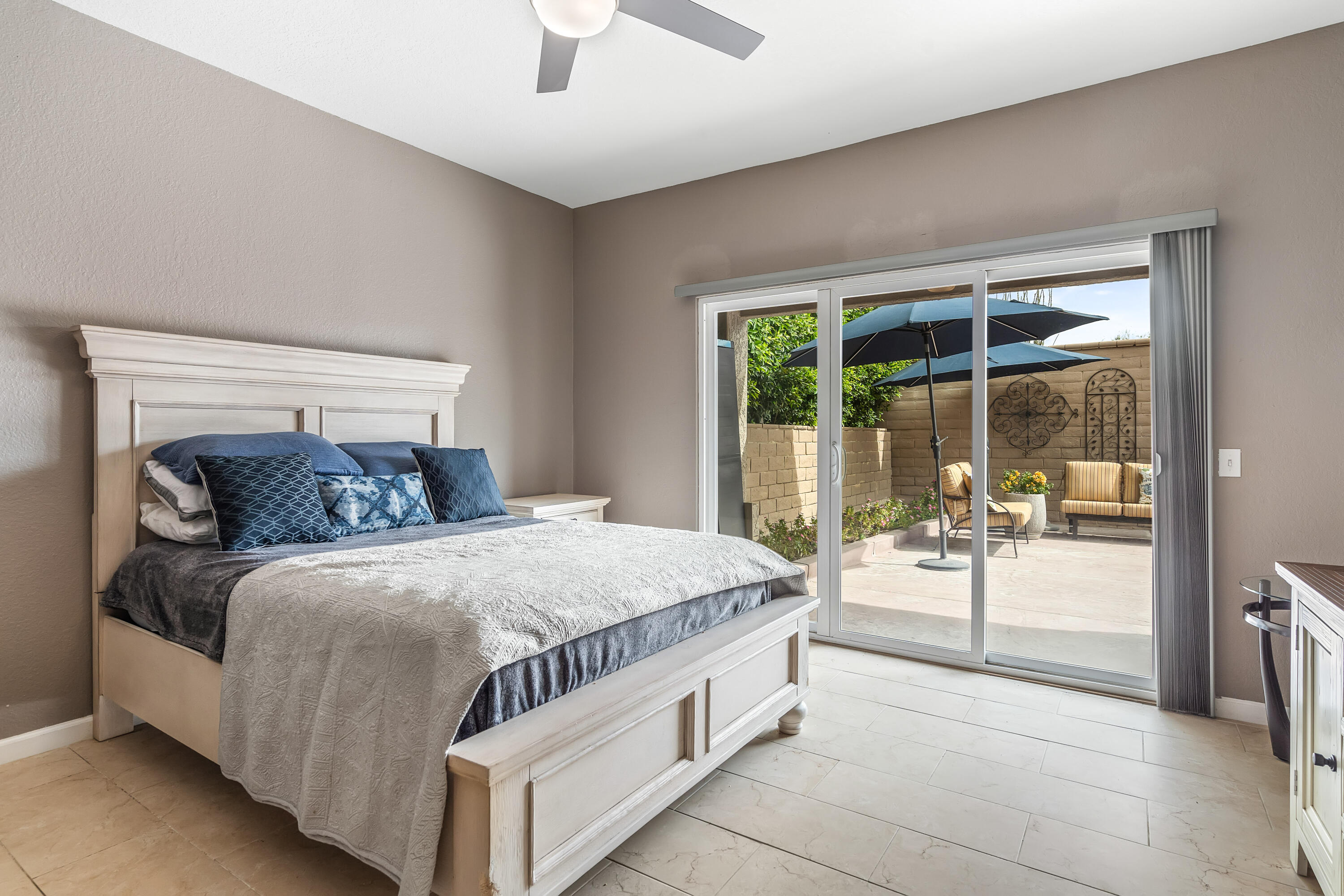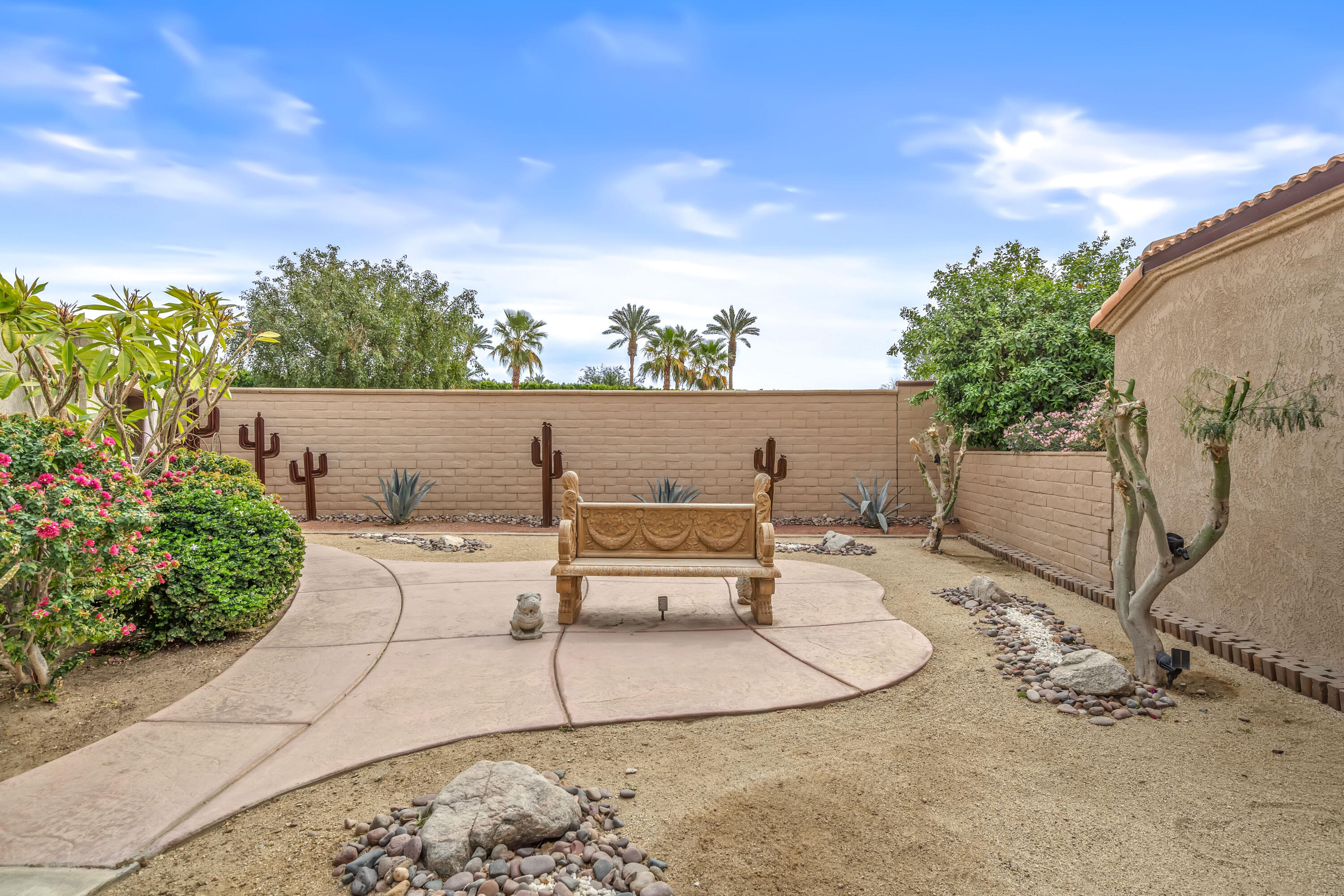 Desert Hideaway in Laguna de la Paz! Situated on a .14 acre lot, this home has an entertainers' backyard complete with BBQ/TV, portable outdoor a/c unit and expansive patio cover. There is also room to add a spool or casita with HOA approval. This spacious 1,852 sq. ft. 3bed/2bath floor plan features many upgrades including energy efficient dual pane windows, custom window shades, vinyl laminate and tile flooring, fresh paint & baseboards as well as recessed lighting throughout! The inviting living room is open to the patio and features a stone gas fireplace. Off the living room, the den/dining area wraps around the patio heading in to the light and bright kitchen featuring a cute eat-in dining area with soaring high ceilings! The primary bedroom is an oasis of it's own with double doors for privacy, a large walk in closet, a separate slider with access to the patio and a huge tiled walk-in dual shower with bench. There are two additional bedrooms on the opposite side of the home with access to a second bath which has also been remodeled, featuring a beautifully tiled shower with bench. The garage houses a Navien Tankless Water Heater for superb efficiency as well as ceiling storage racks & storage cabinets. There are so many community amenities to enjoy including 15 pools and 16 spas, a 5-acre lake with paddle boats outlined by a serene walking path, tennis, pickleball and a fitness center. Less than a mile from the famed La Quinta Resort & Spa. Enjoy close proximity to shopping and theaters as well as the IW Tennis Gardens, El Paseo, Acrisure Arena, plus hiking trails, nationally rated PGA golf resorts and more.Interested in this Listing?